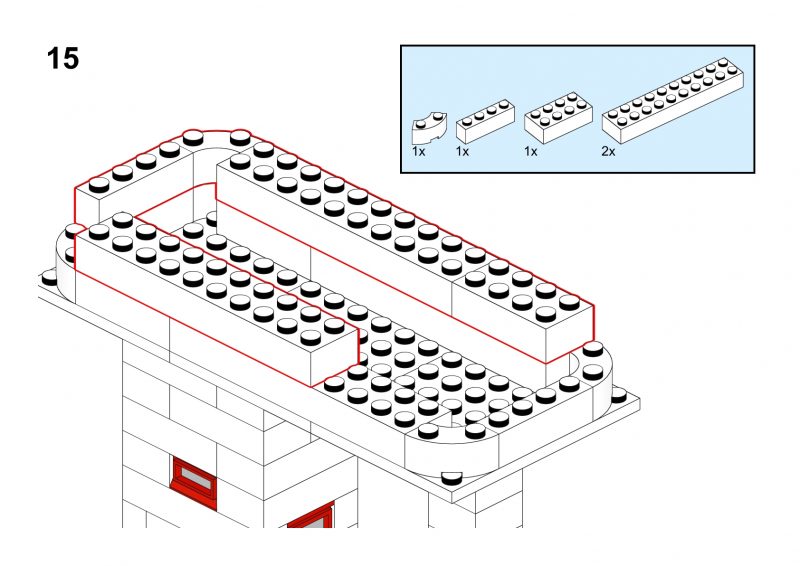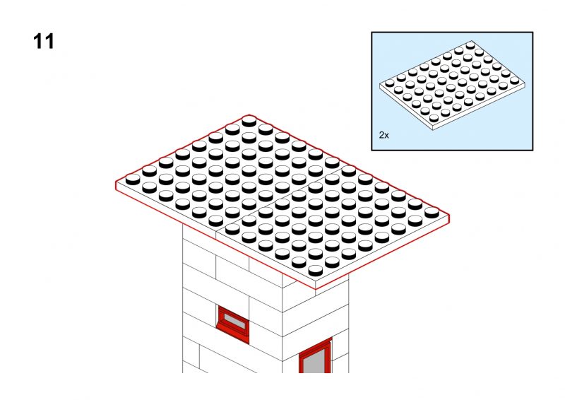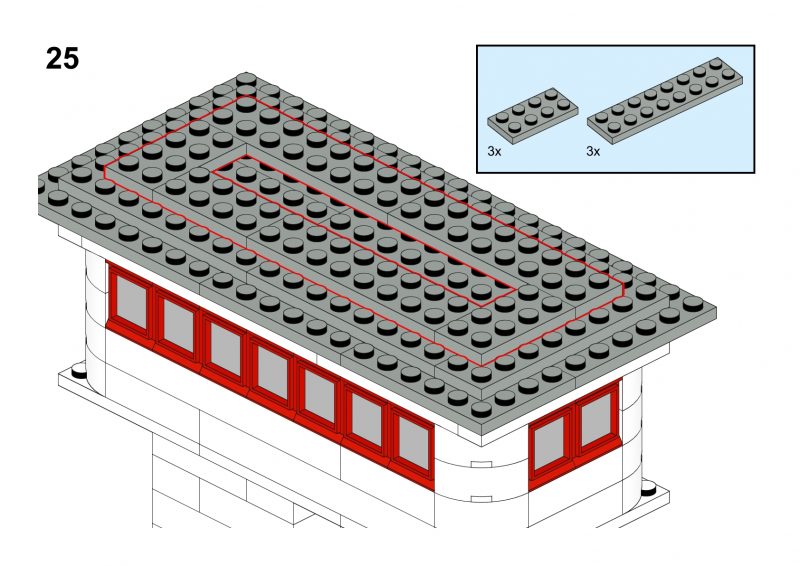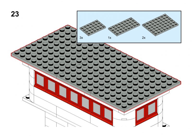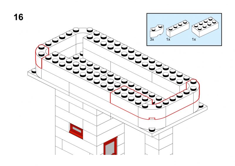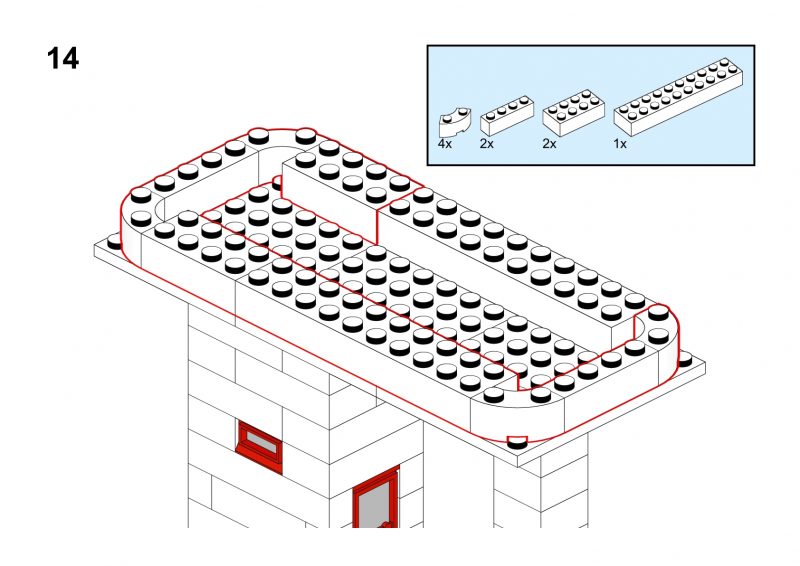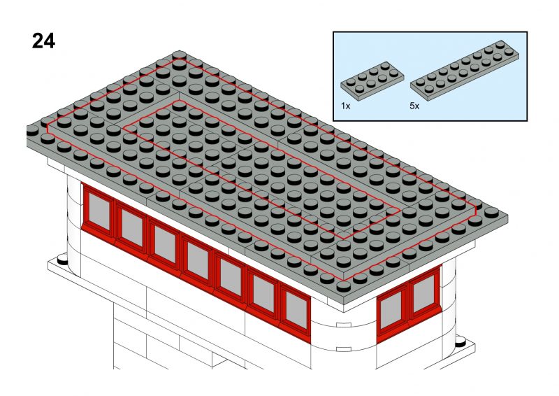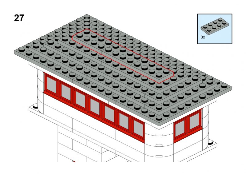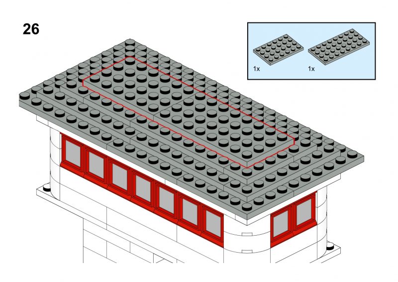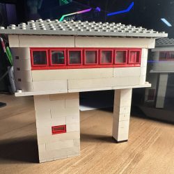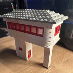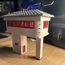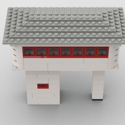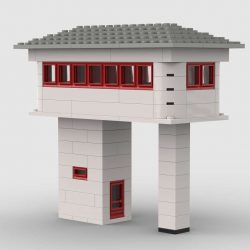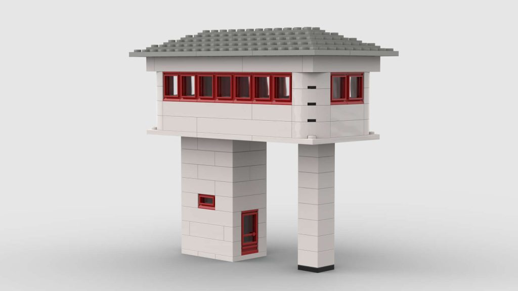 This model is a faithful tribute to the iconic signal towers featured in vintage LEGO System leaflets from the 1960s and 70s. Elevated on two sturdy pillars, the main control room is perched high above the tracks, offering operators a clear view of the railway. The building is crafted in classic white bricks with a grey gabled roof and striking red-framed windows that wrap around the structure—an unmistakable nod to mid-century LEGO design language.