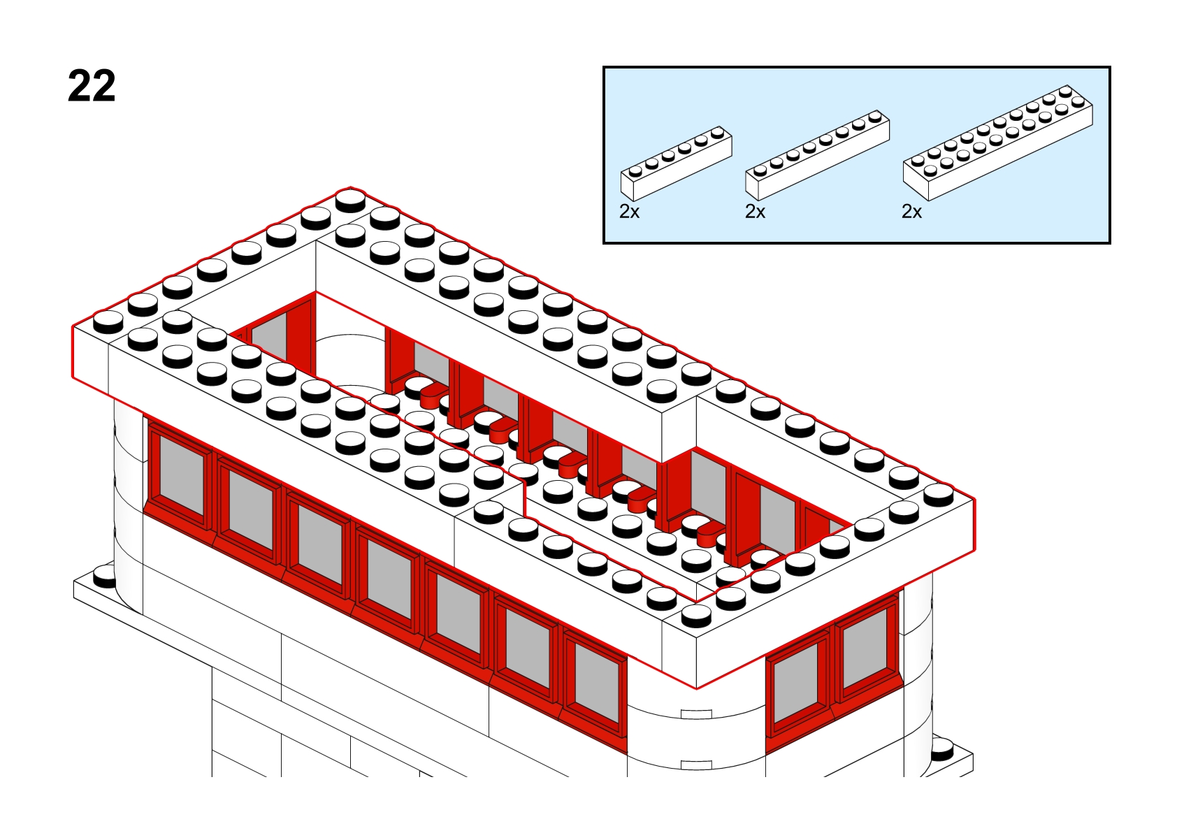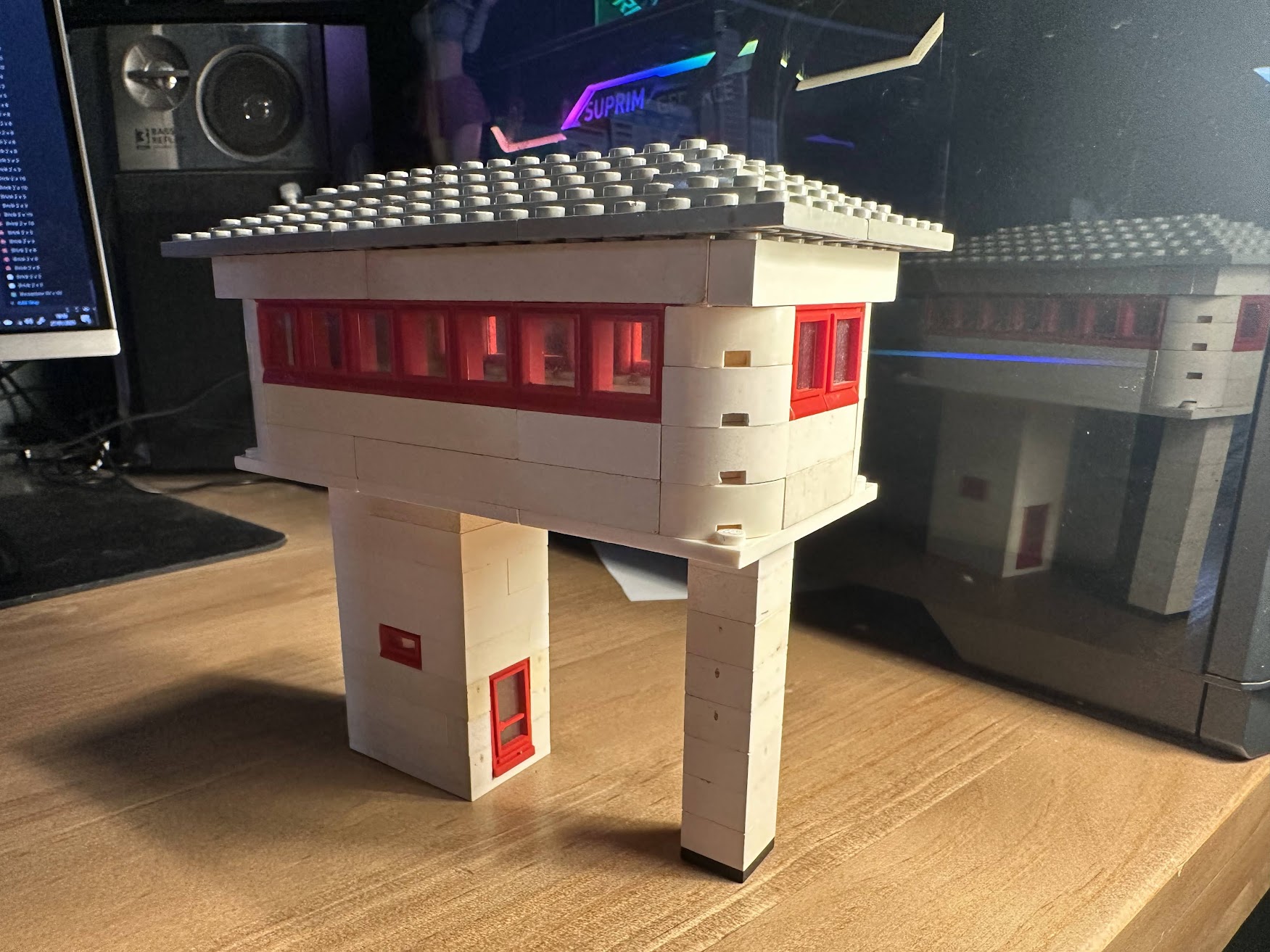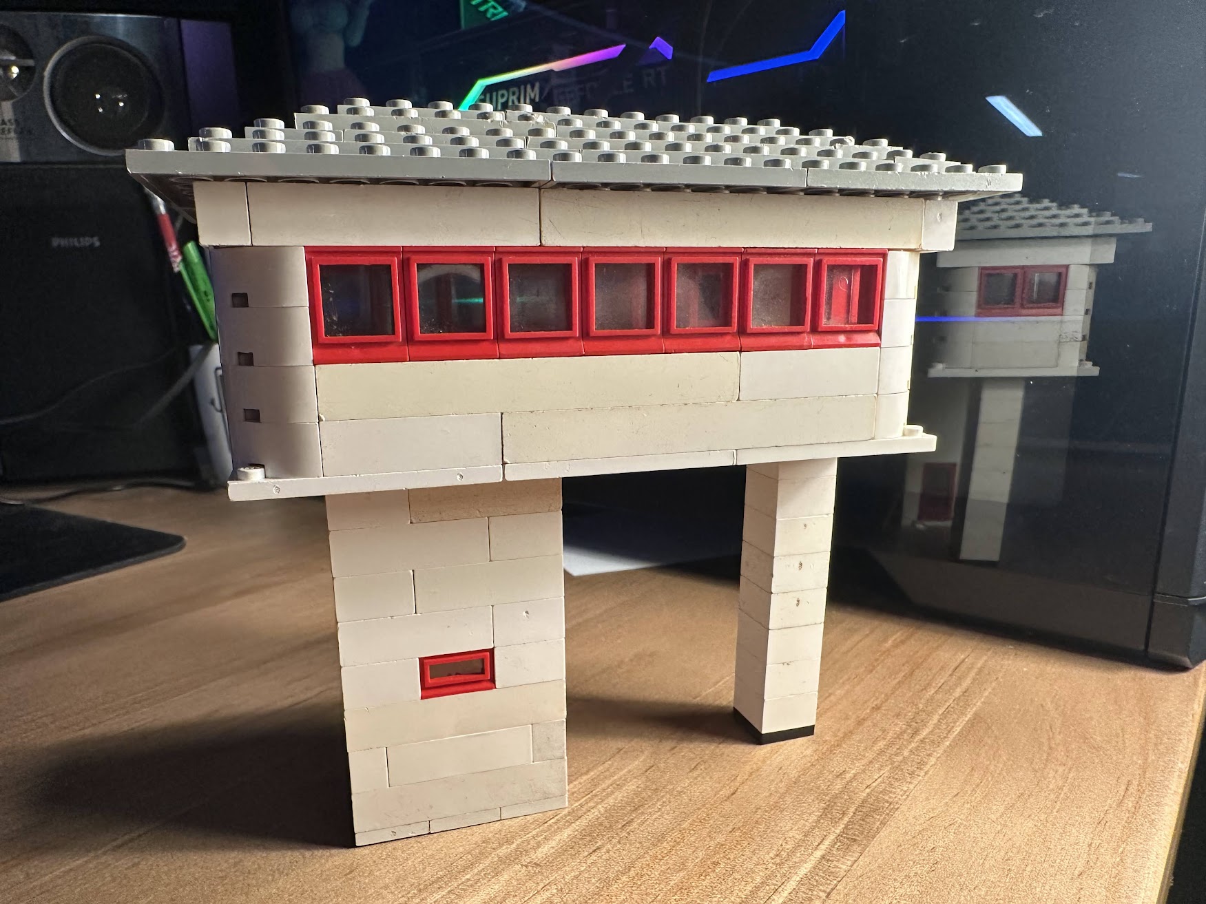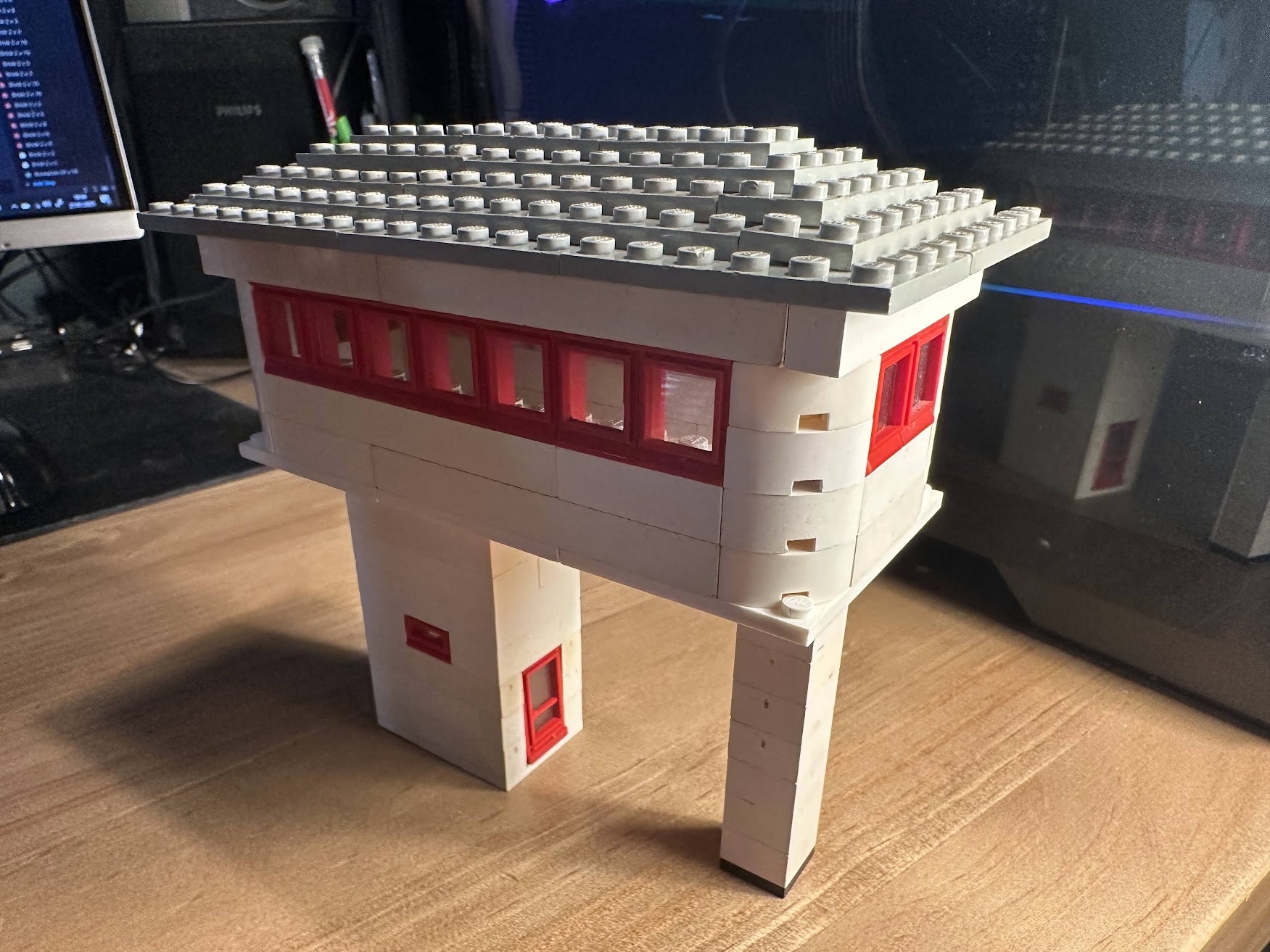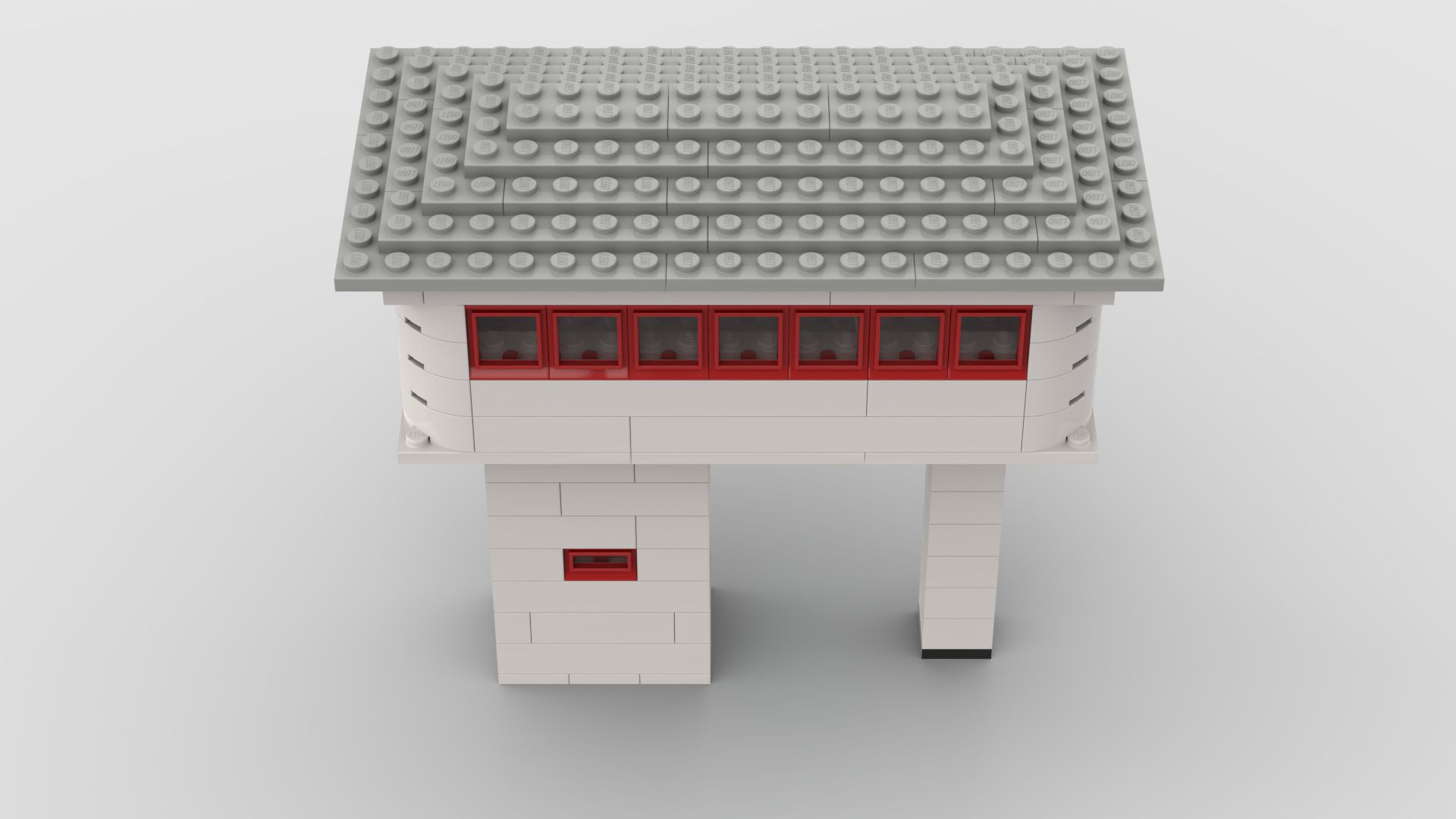 This model is a faithful tribute to the iconic signal towers featured in vintage LEGO System leaflets from the 1960s and 70s. Elevated on two sturdy pillars, the main control room is perched high above the tracks, offering operators a clear view of the railway. The building is crafted in classic white bricks with a grey gabled roof and striking red-framed windows that wrap around the structure—an unmistakable nod to mid-century LEGO design language.