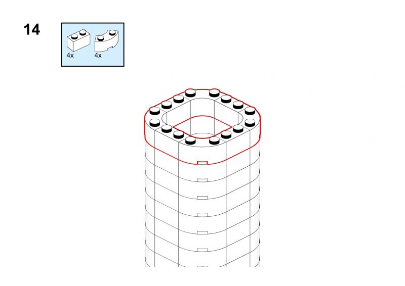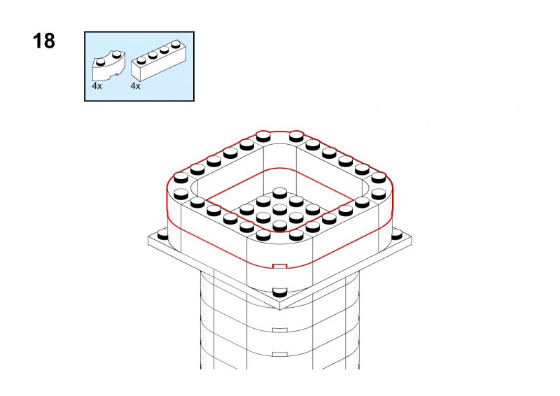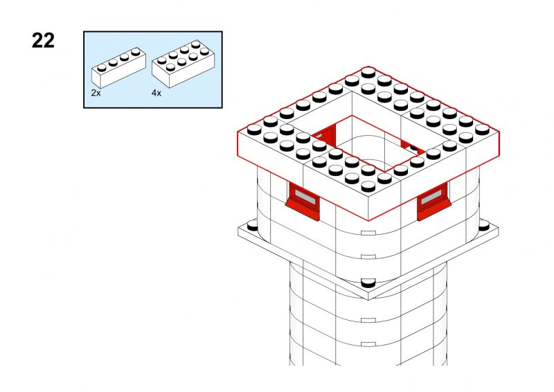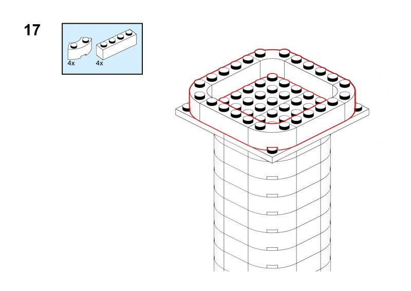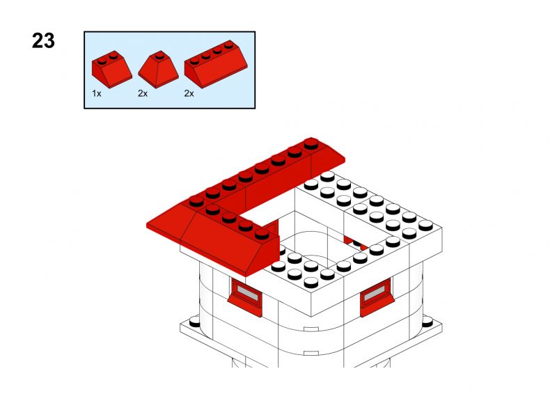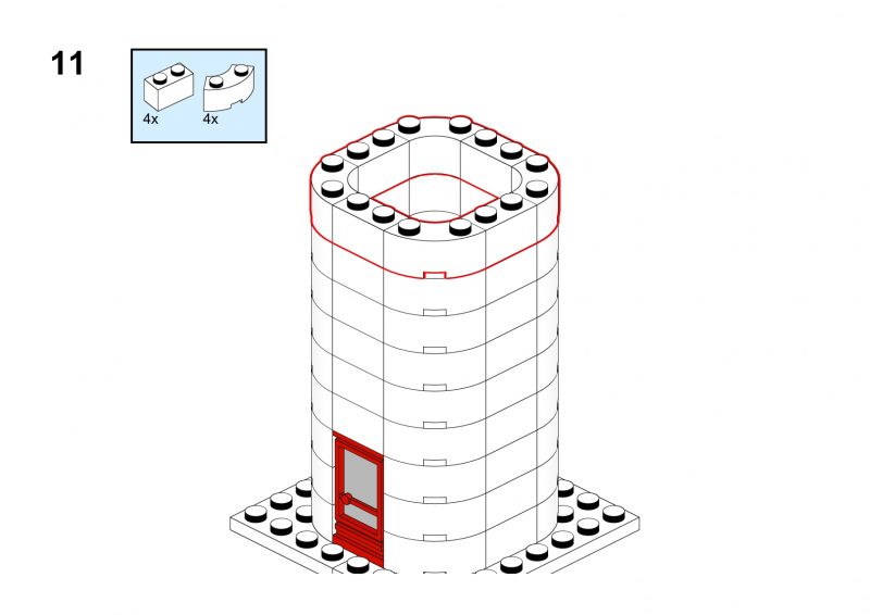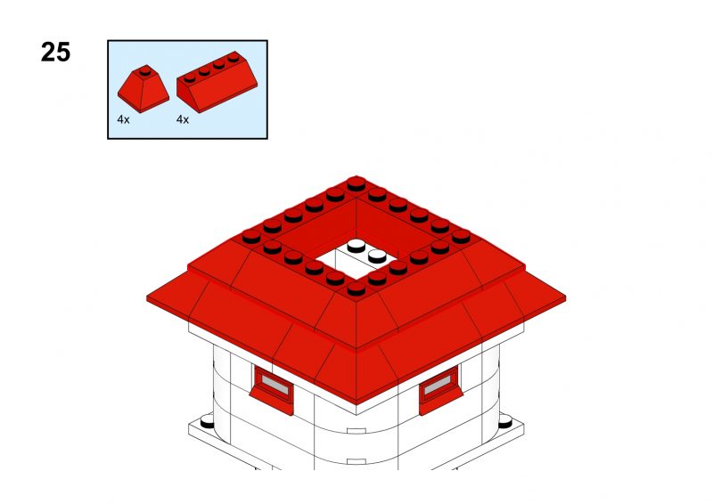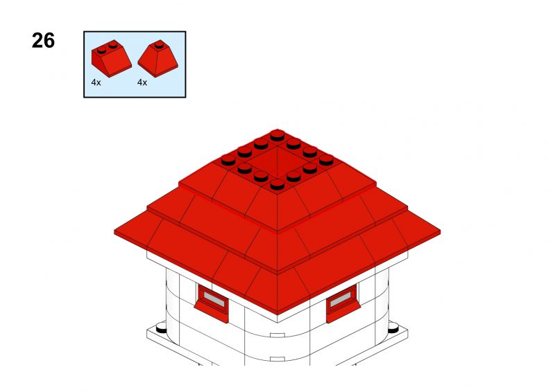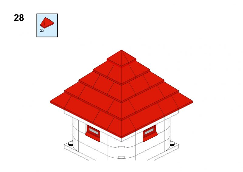 This nice tower has rounded corners and tiny windows and a red roof.