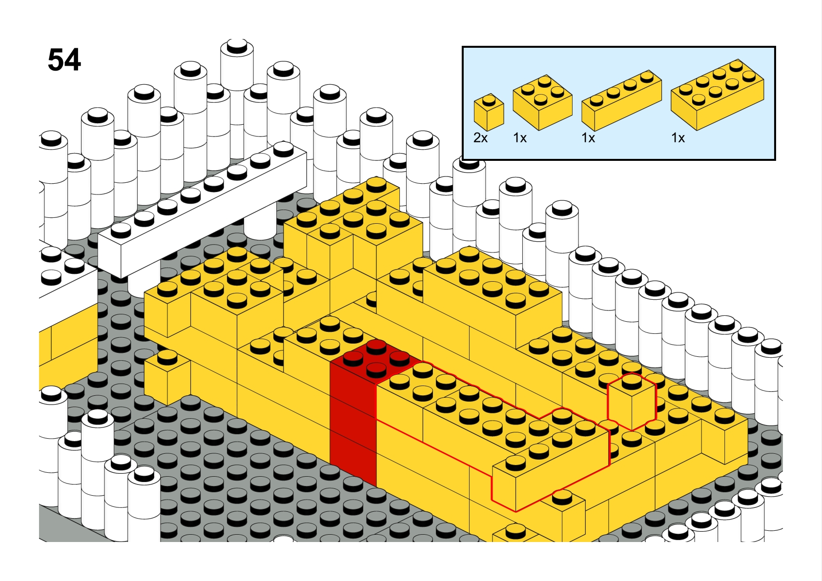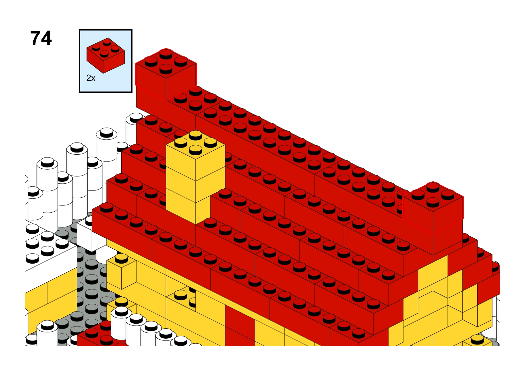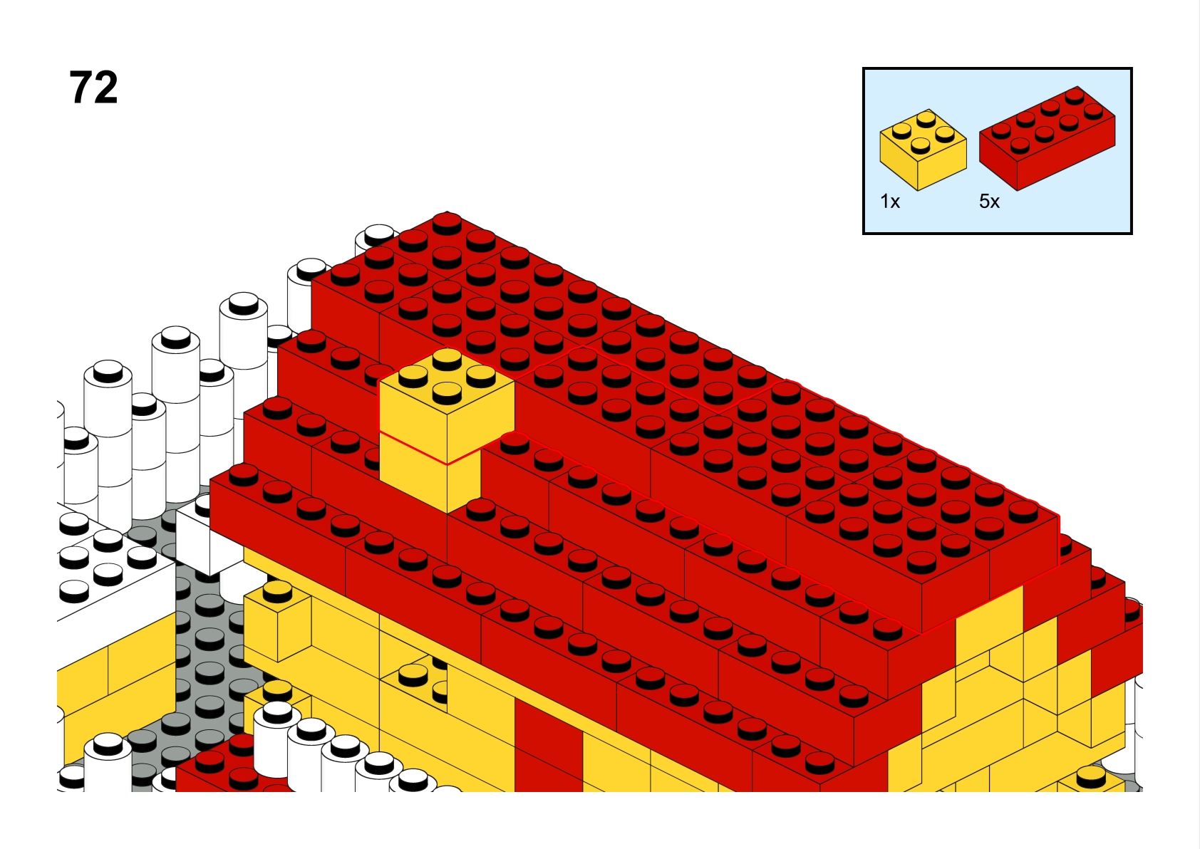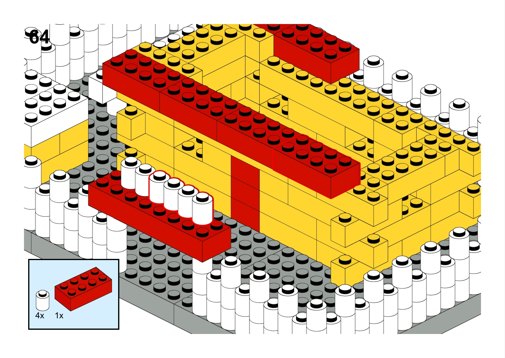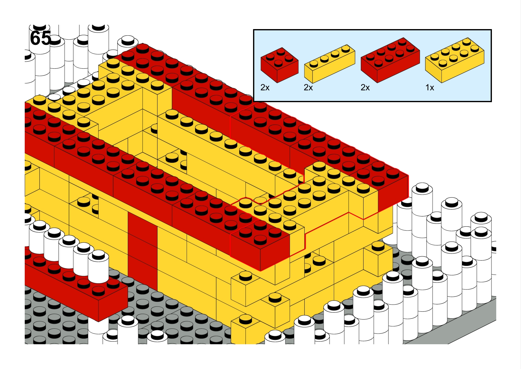 It features a simple rectangular structure with white or gray walls, a red roof, a fence and a barbecue, using the 1960s primary color palette. It doesn’t use any doors or windows.