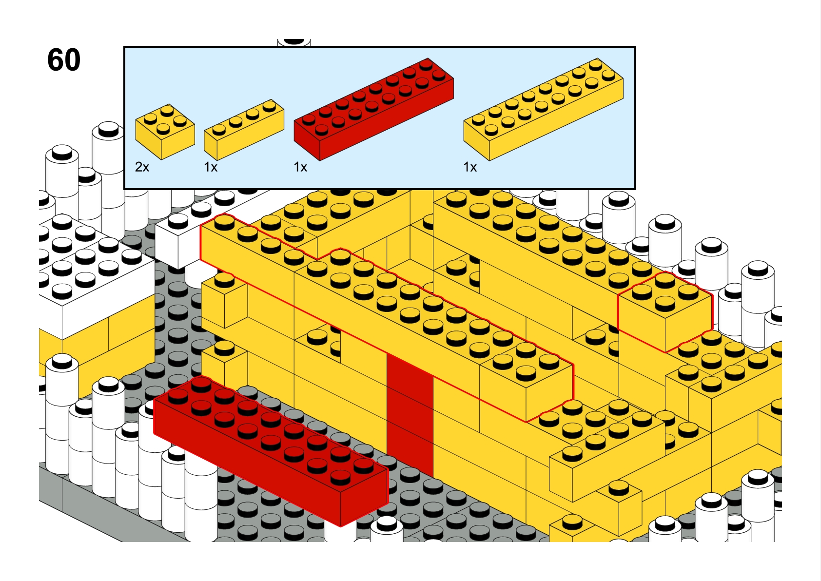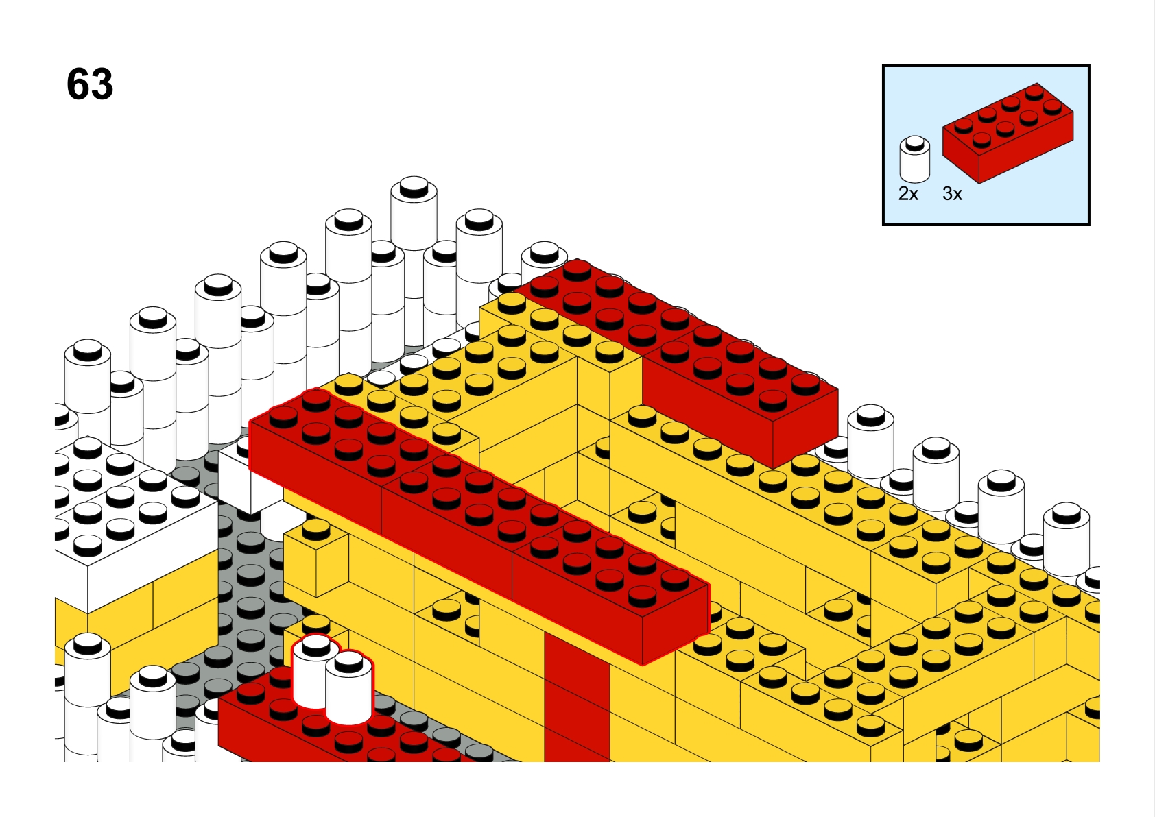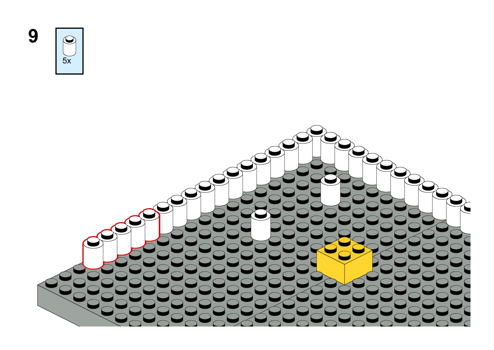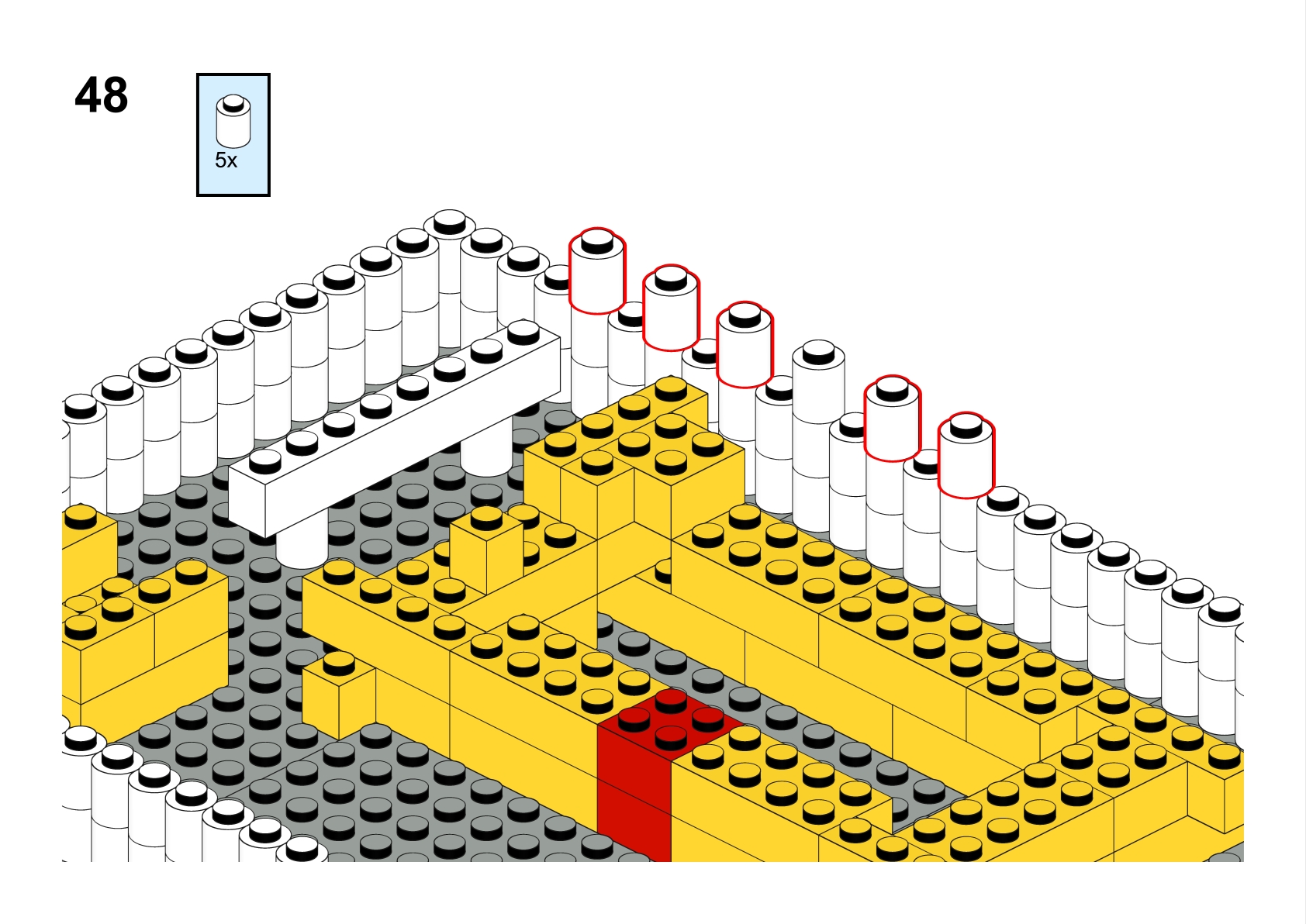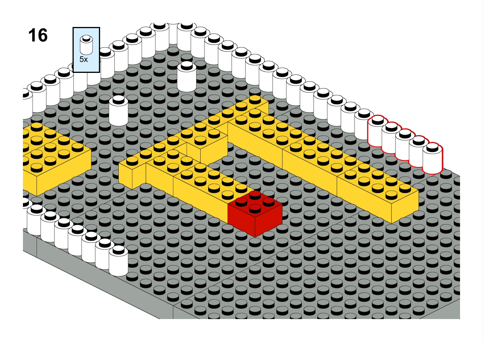 It features a simple rectangular structure with white or gray walls, a red roof, a fence and a barbecue, using the 1960s primary color palette. It doesn’t use any doors or windows.