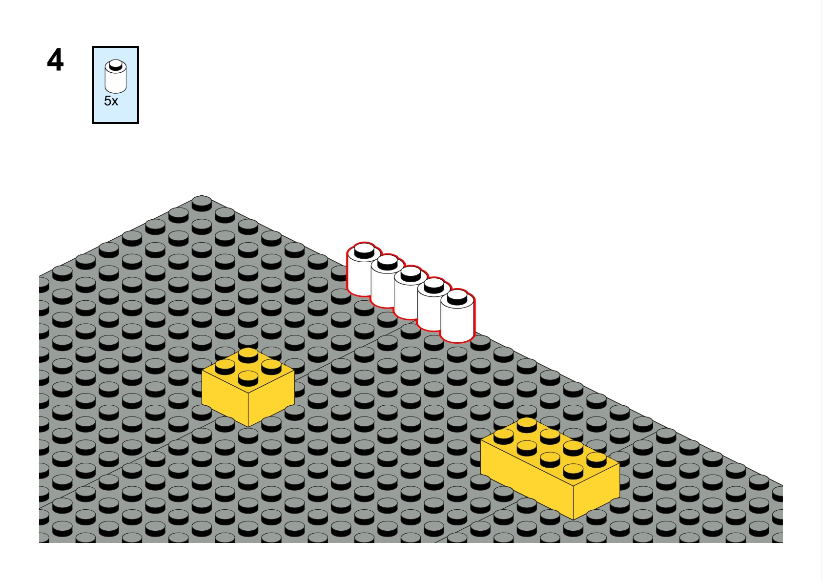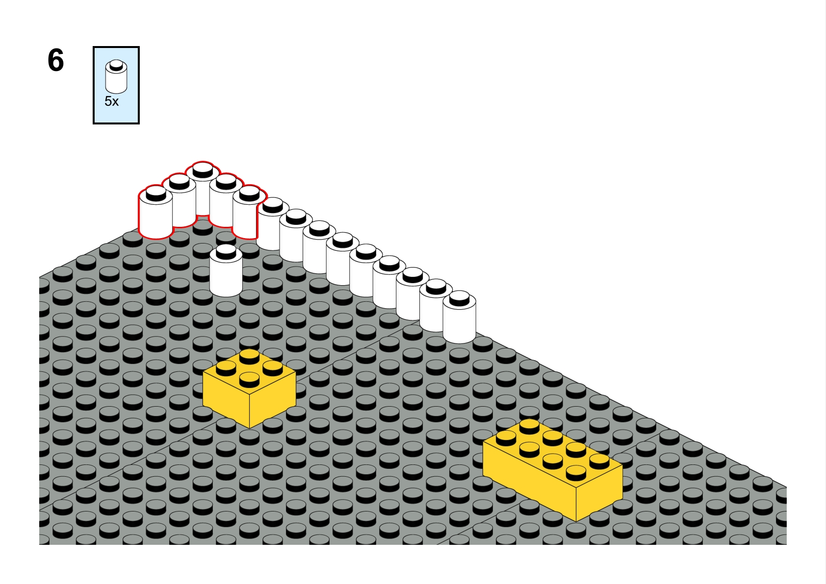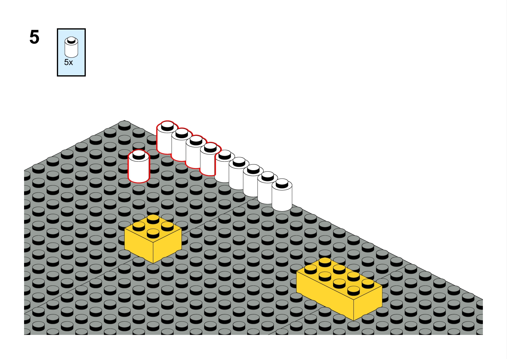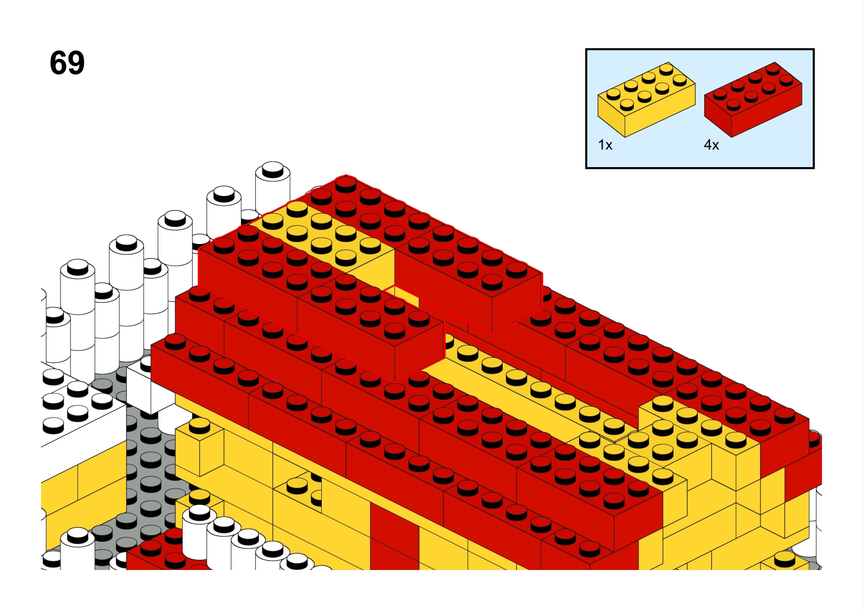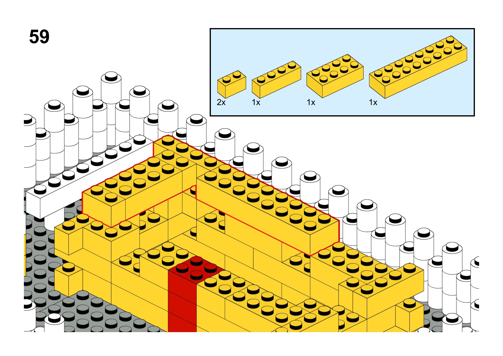 It features a simple rectangular structure with white or gray walls, a red roof, a fence and a barbecue, using the 1960s primary color palette. It doesn’t use any doors or windows.