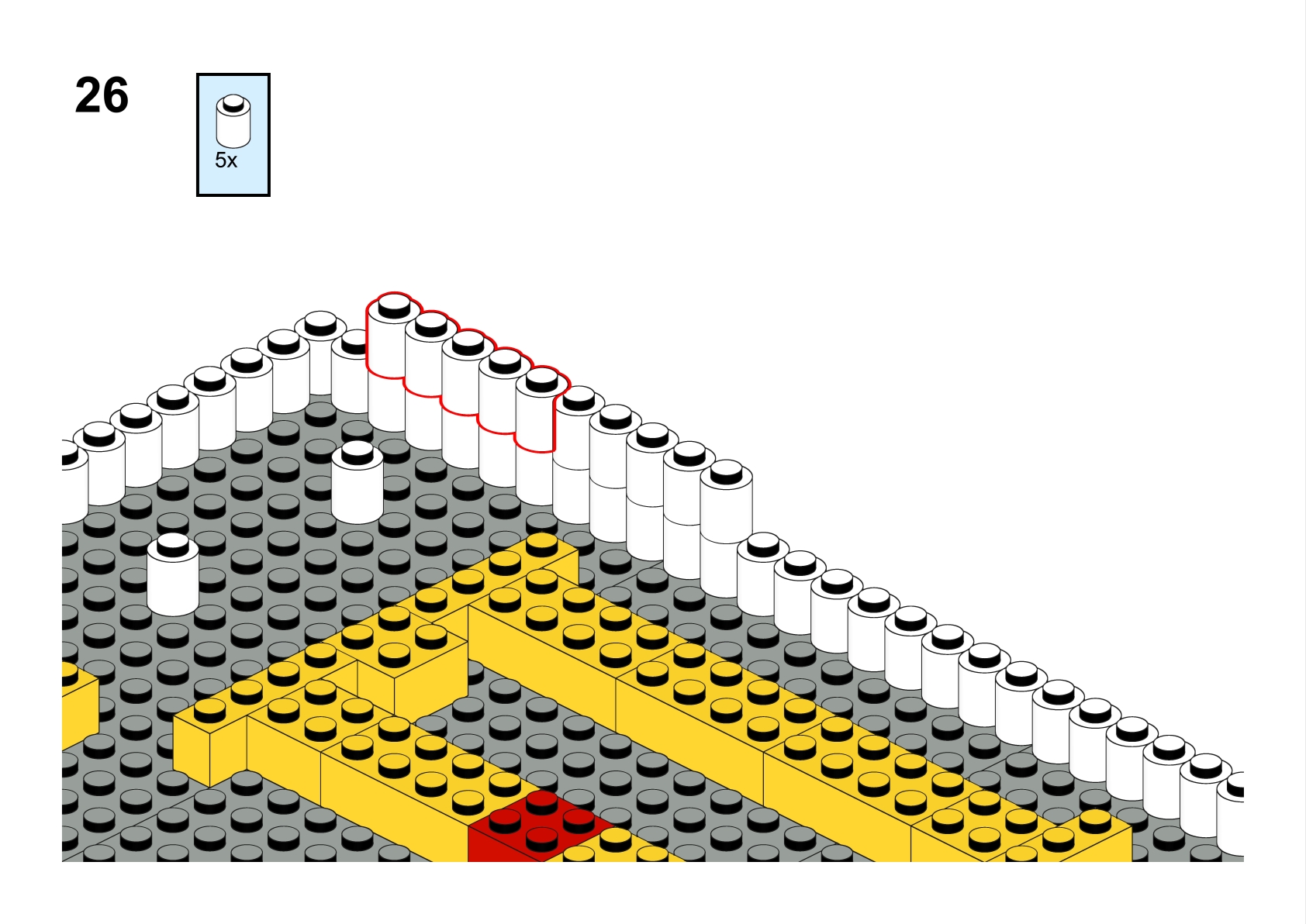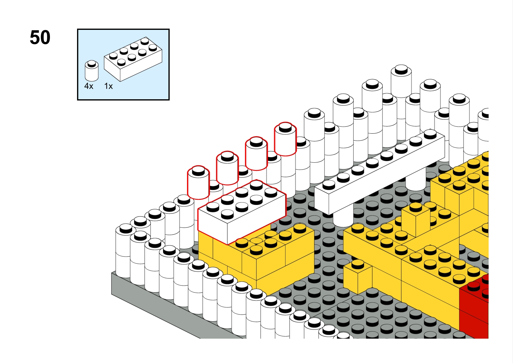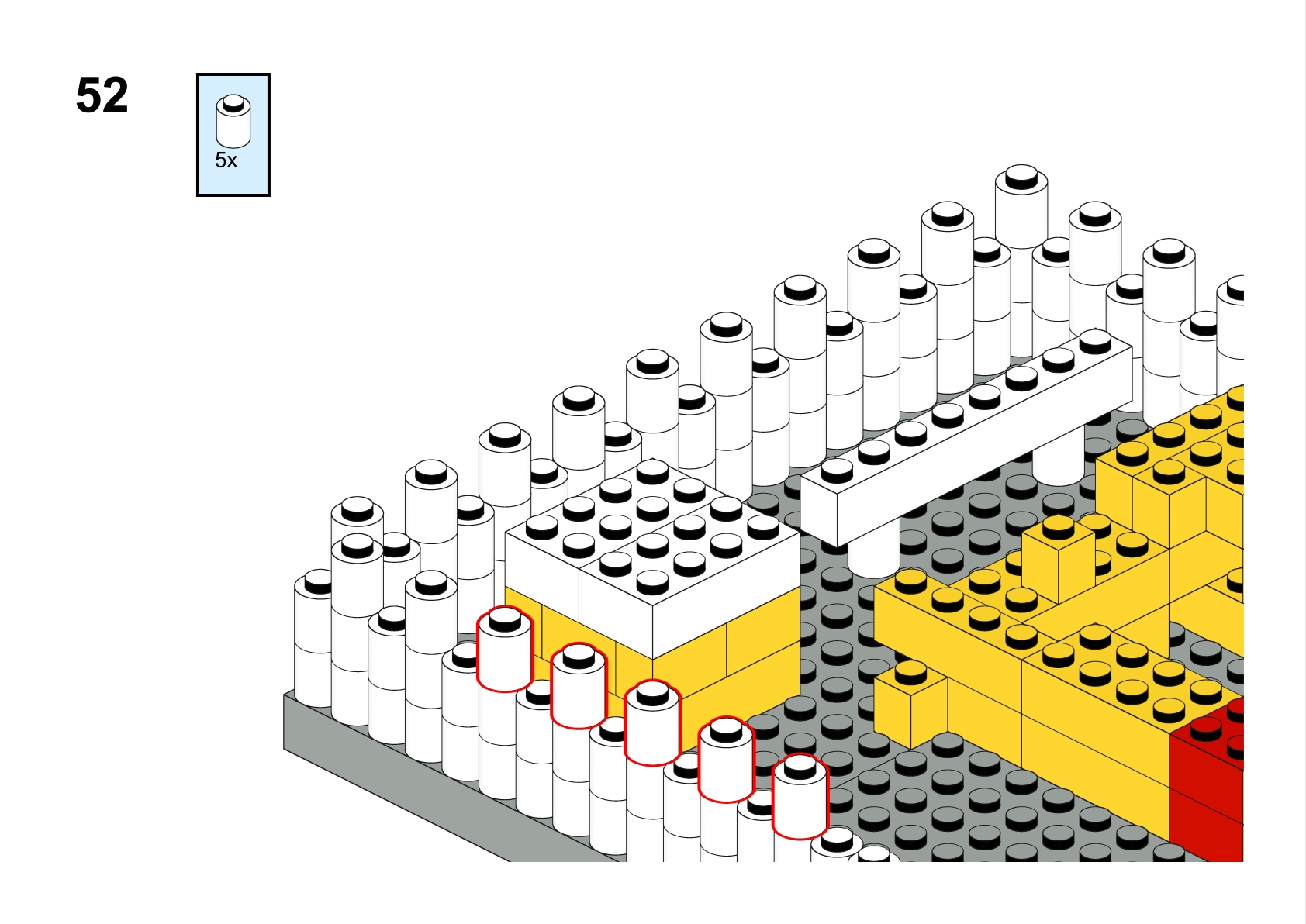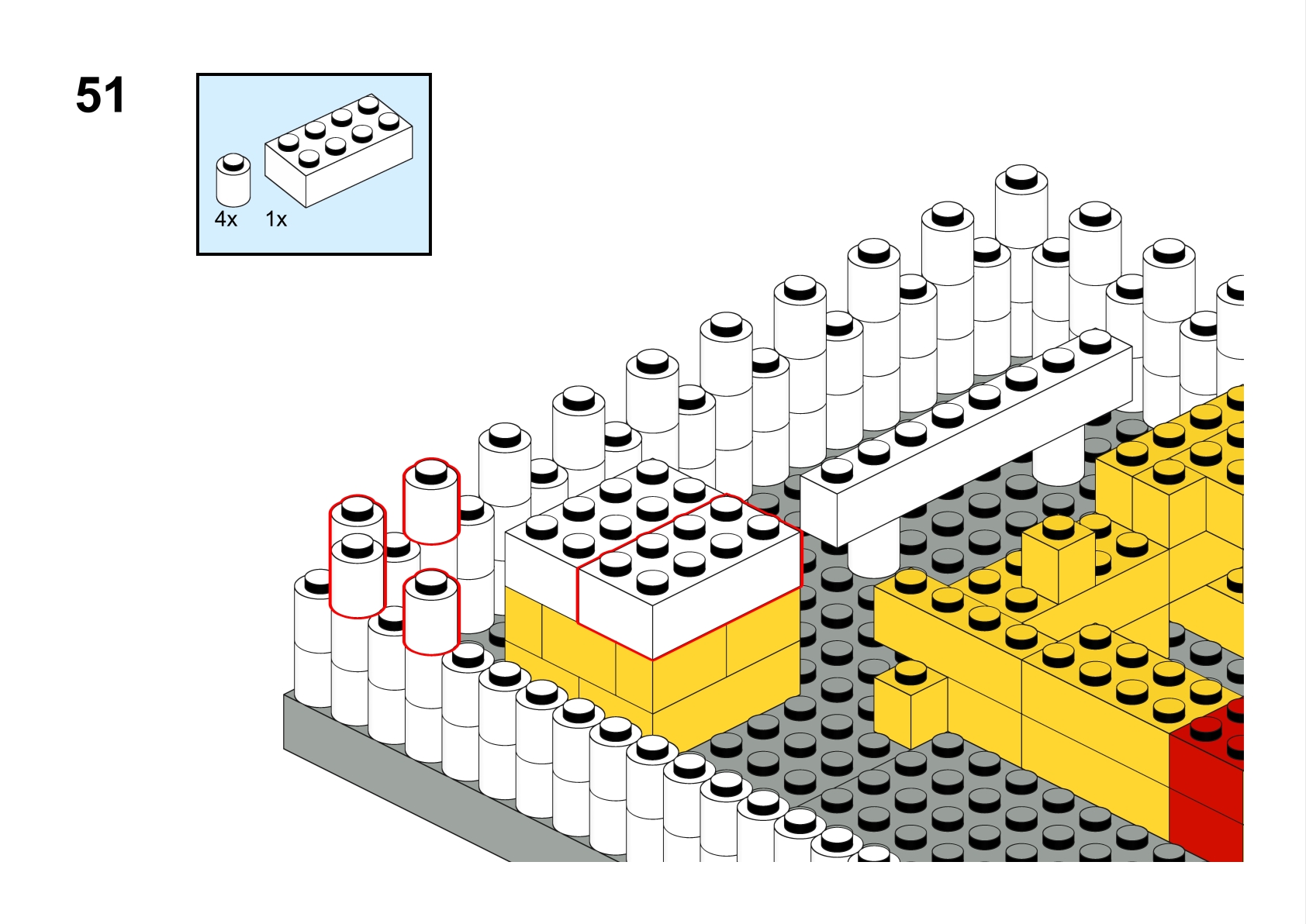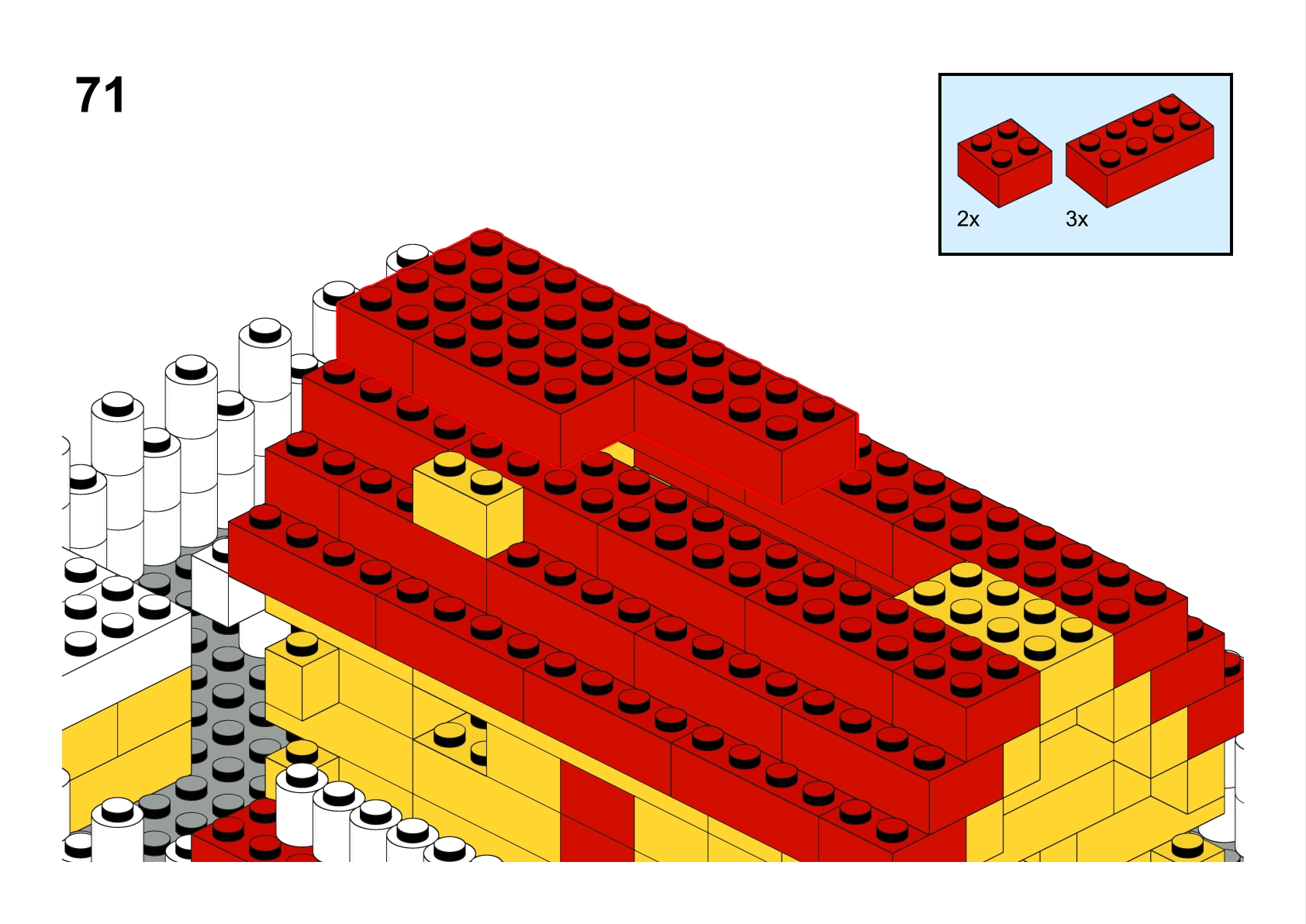 It features a simple rectangular structure with white or gray walls, a red roof, a fence and a barbecue, using the 1960s primary color palette. It doesn’t use any doors or windows.