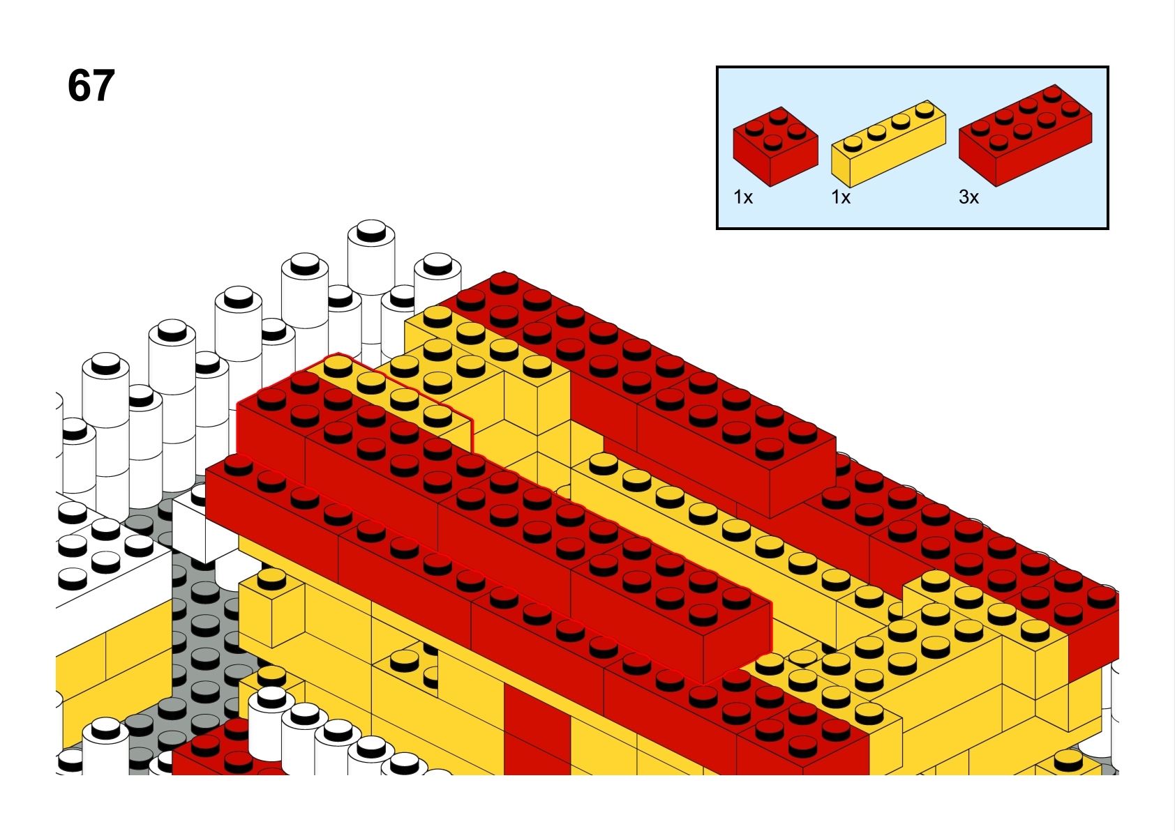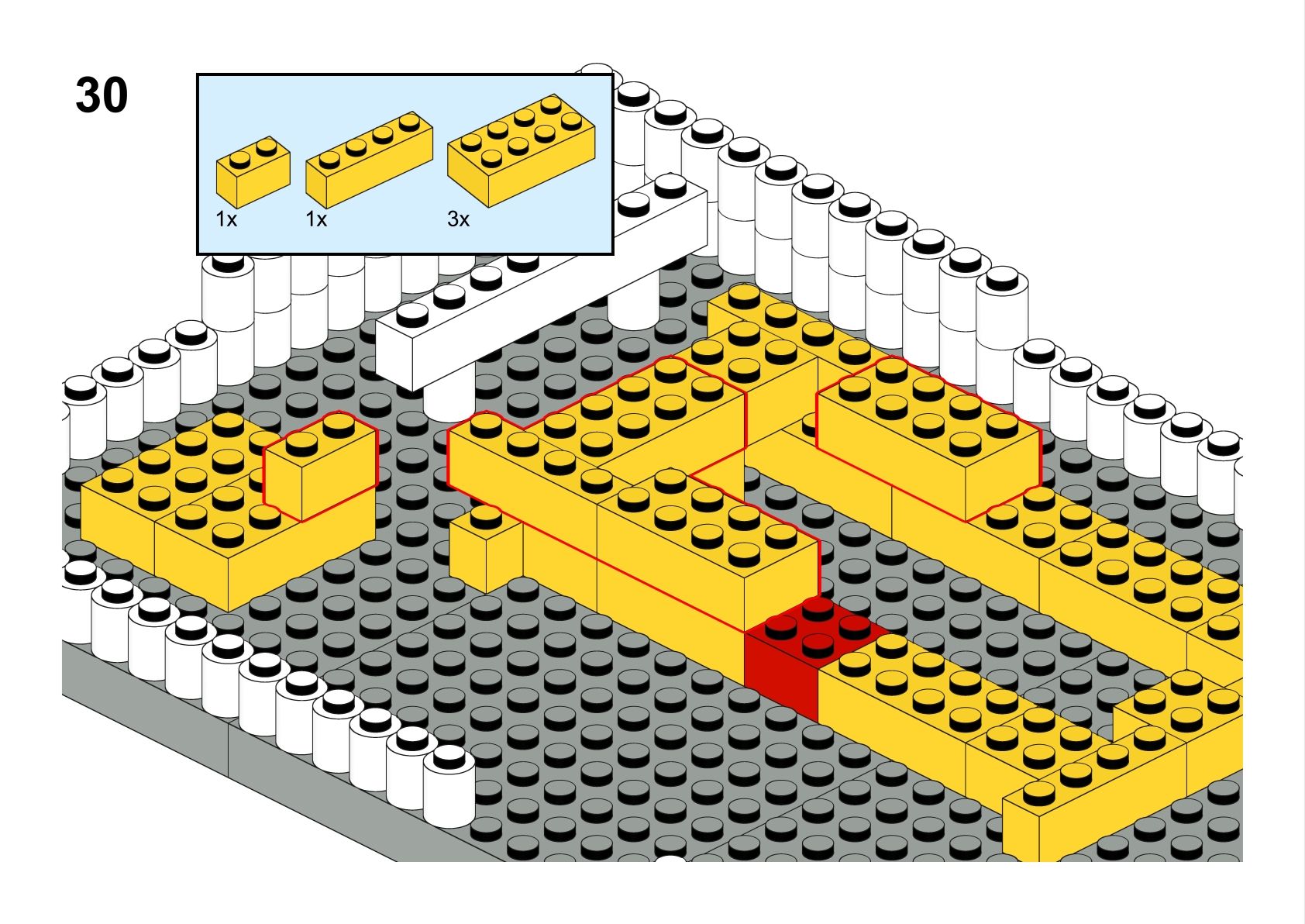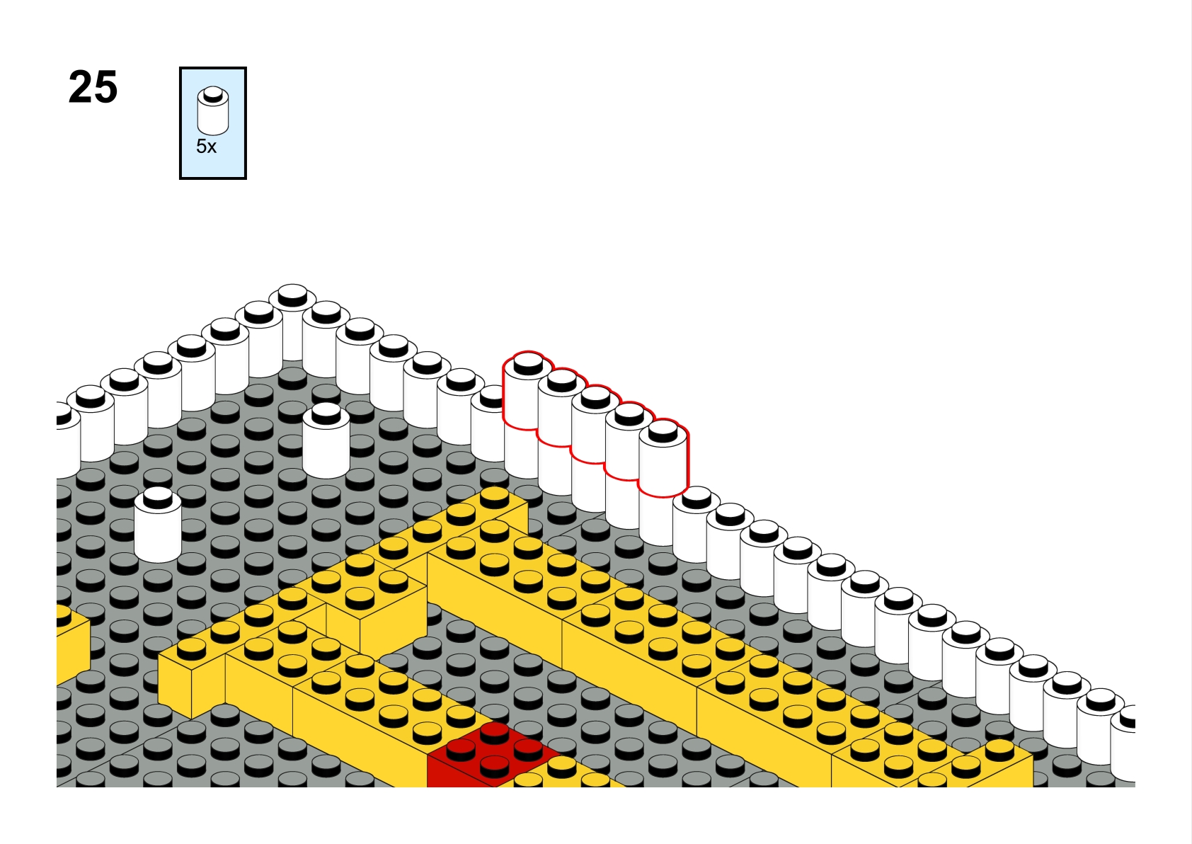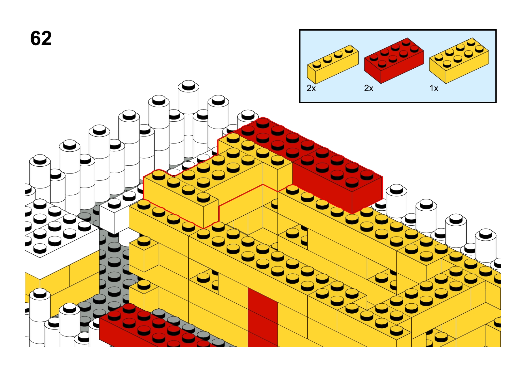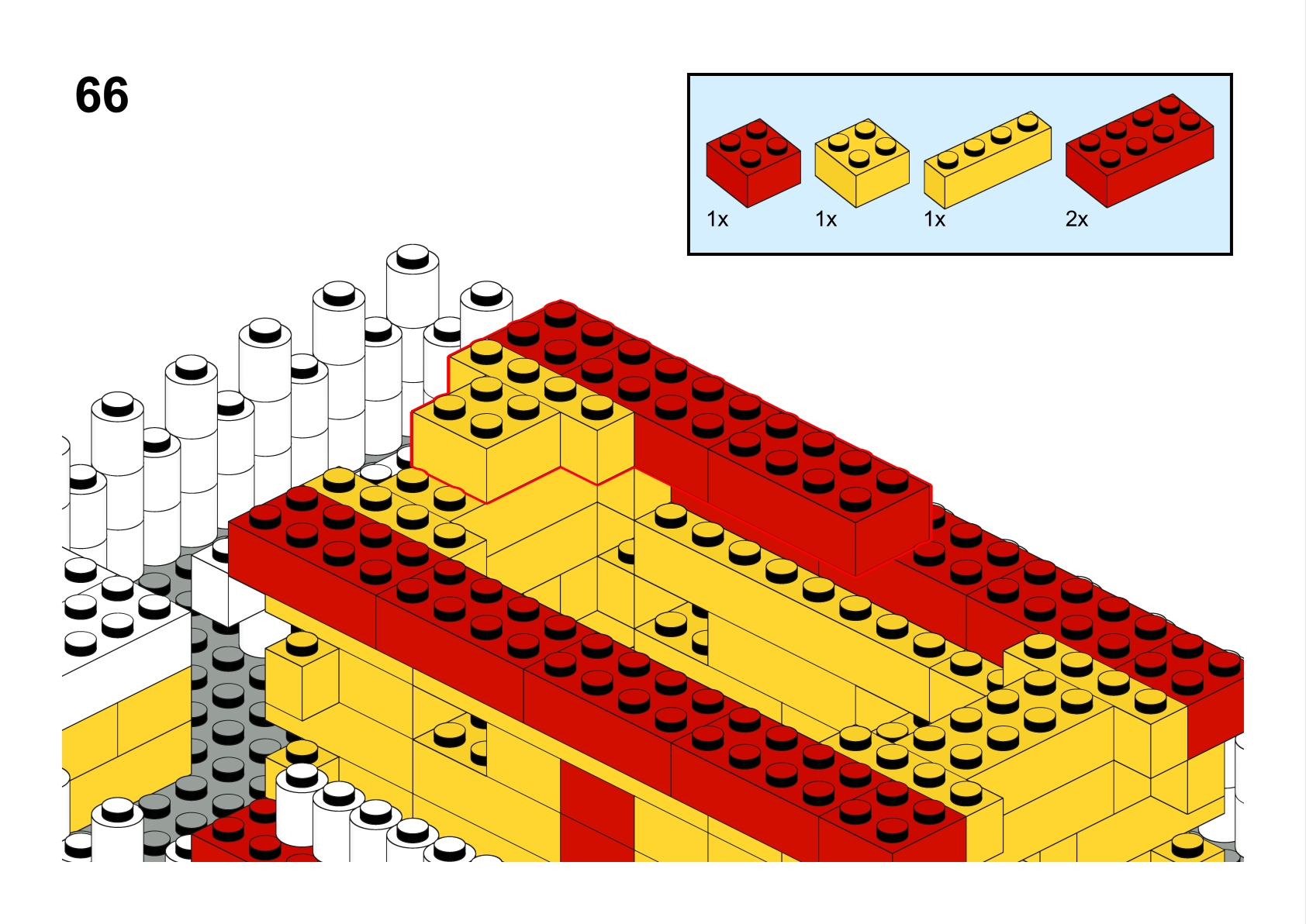 It features a simple rectangular structure with white or gray walls, a red roof, a fence and a barbecue, using the 1960s primary color palette. It doesn’t use any doors or windows.