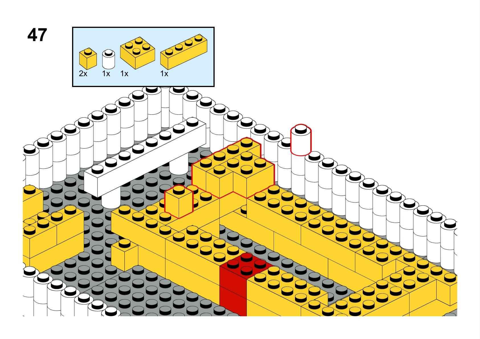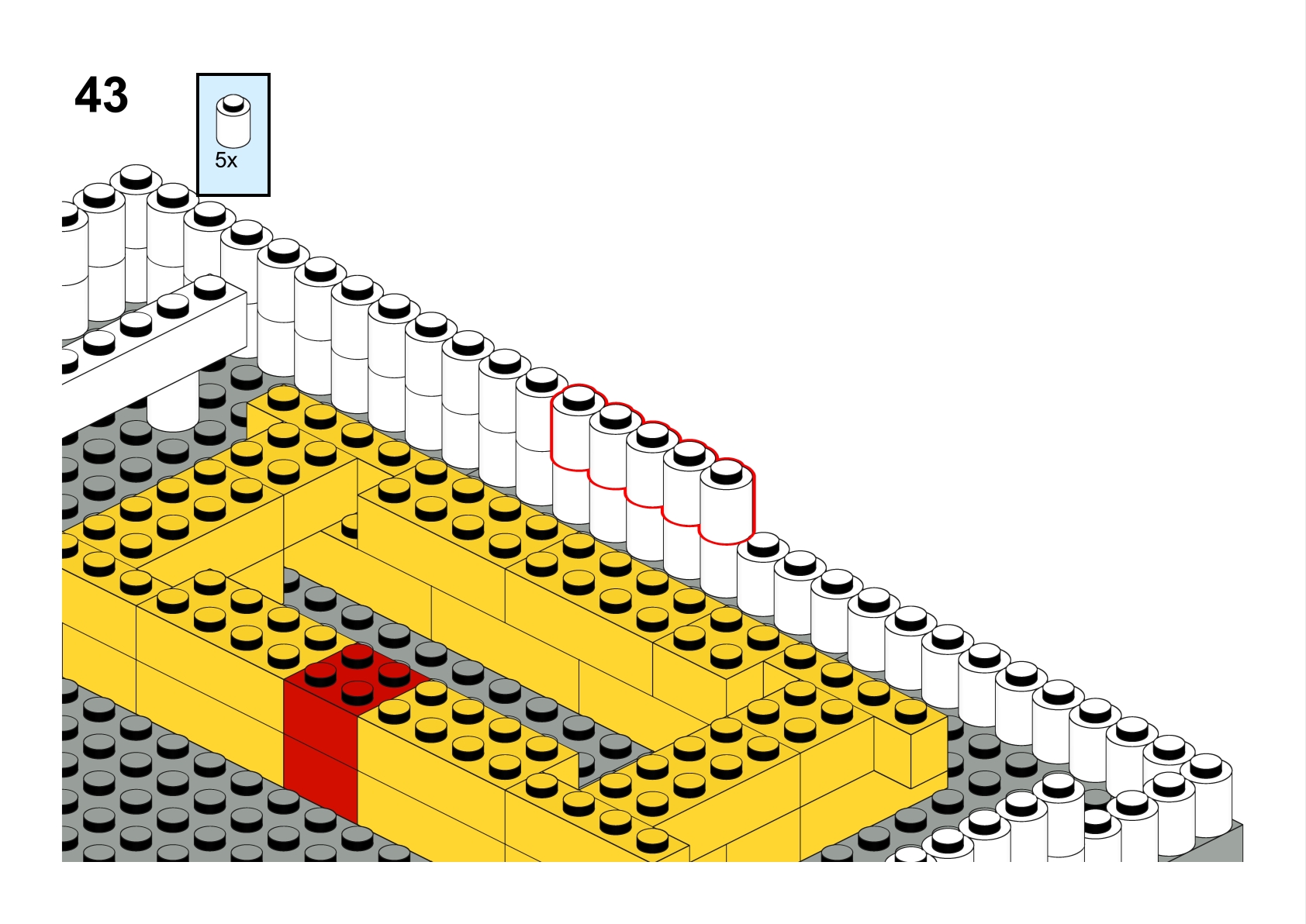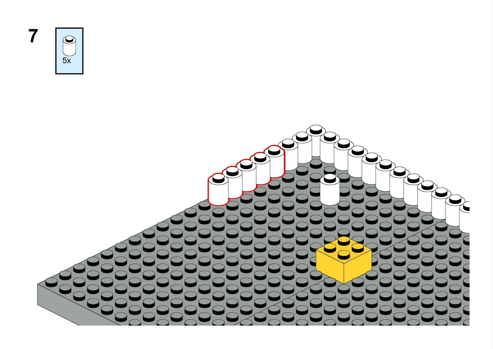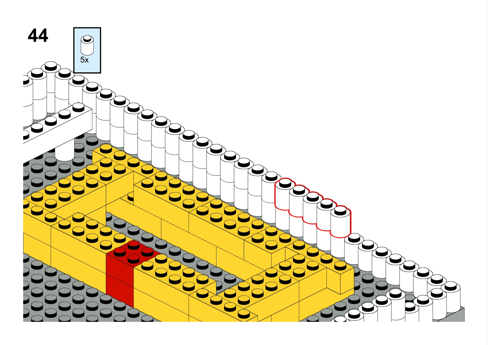 It features a simple rectangular structure with white or gray walls, a red roof, a fence and a barbecue, using the 1960s primary color palette. It doesn’t use any doors or windows.