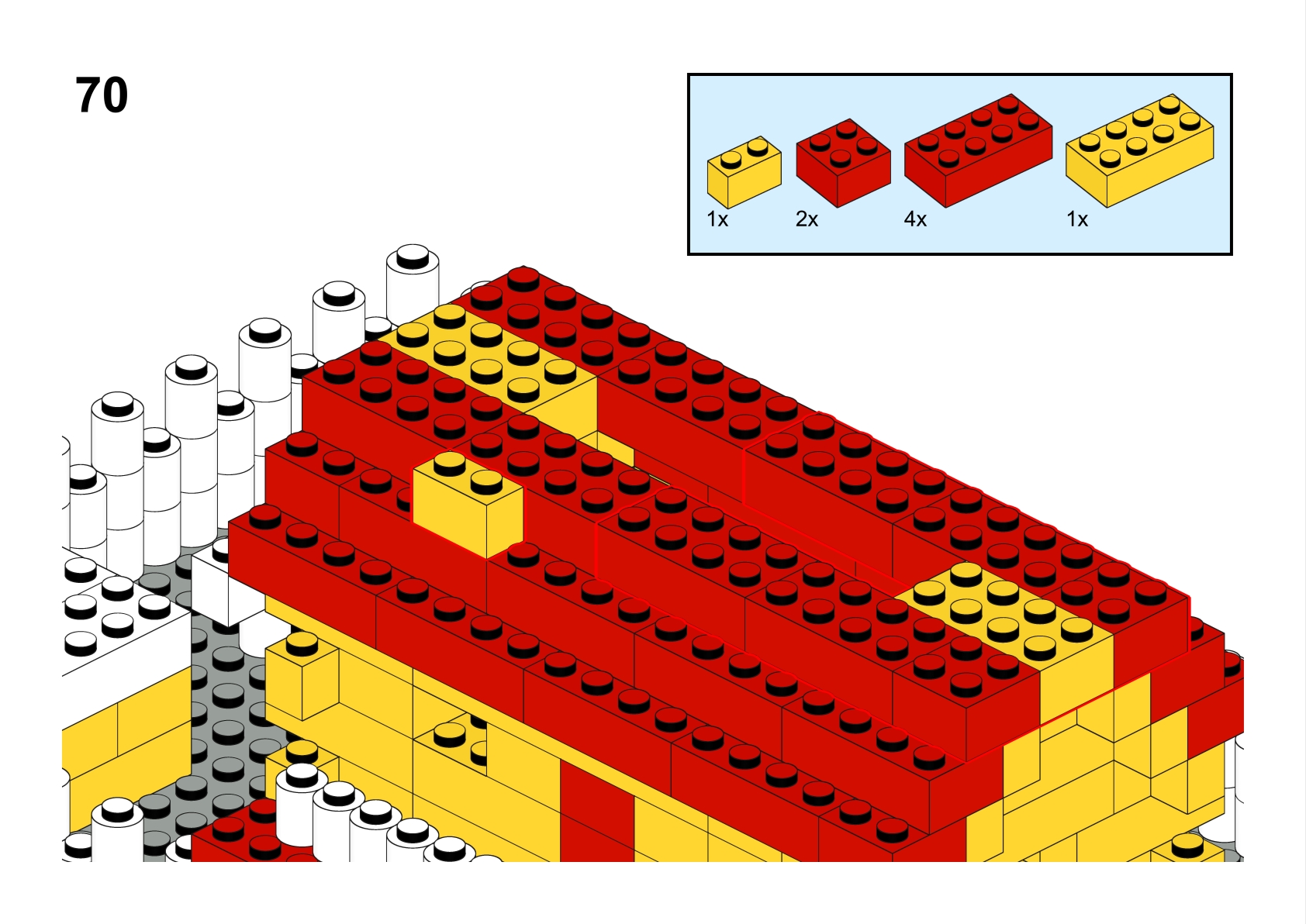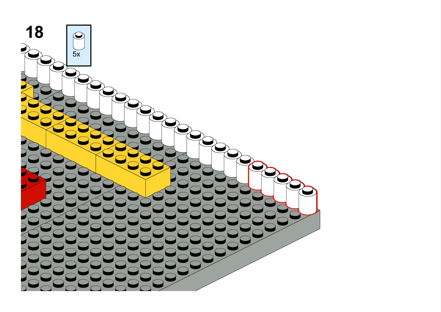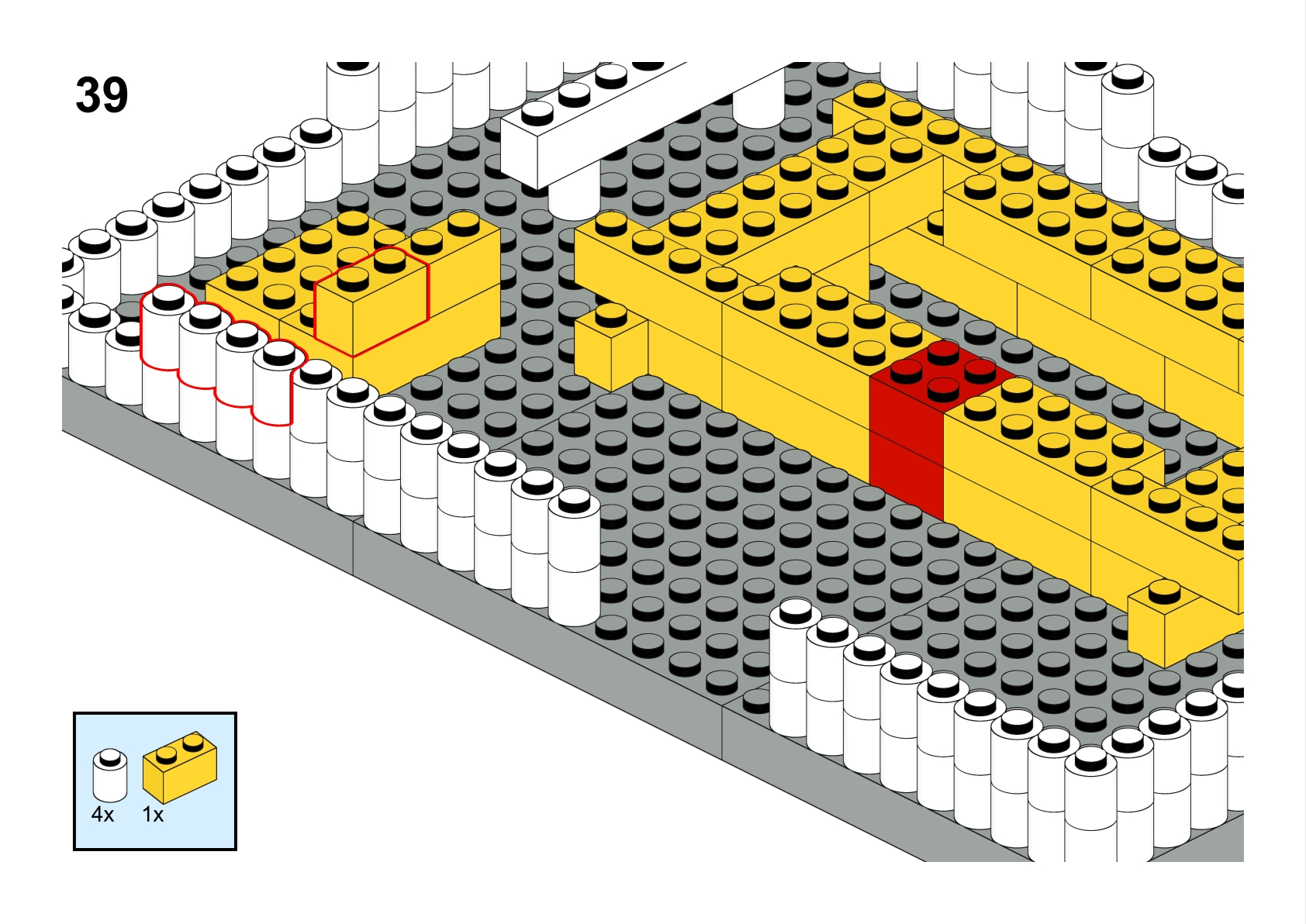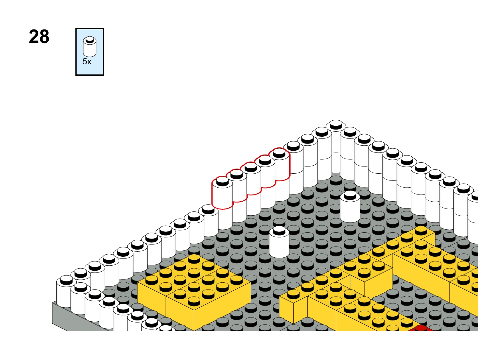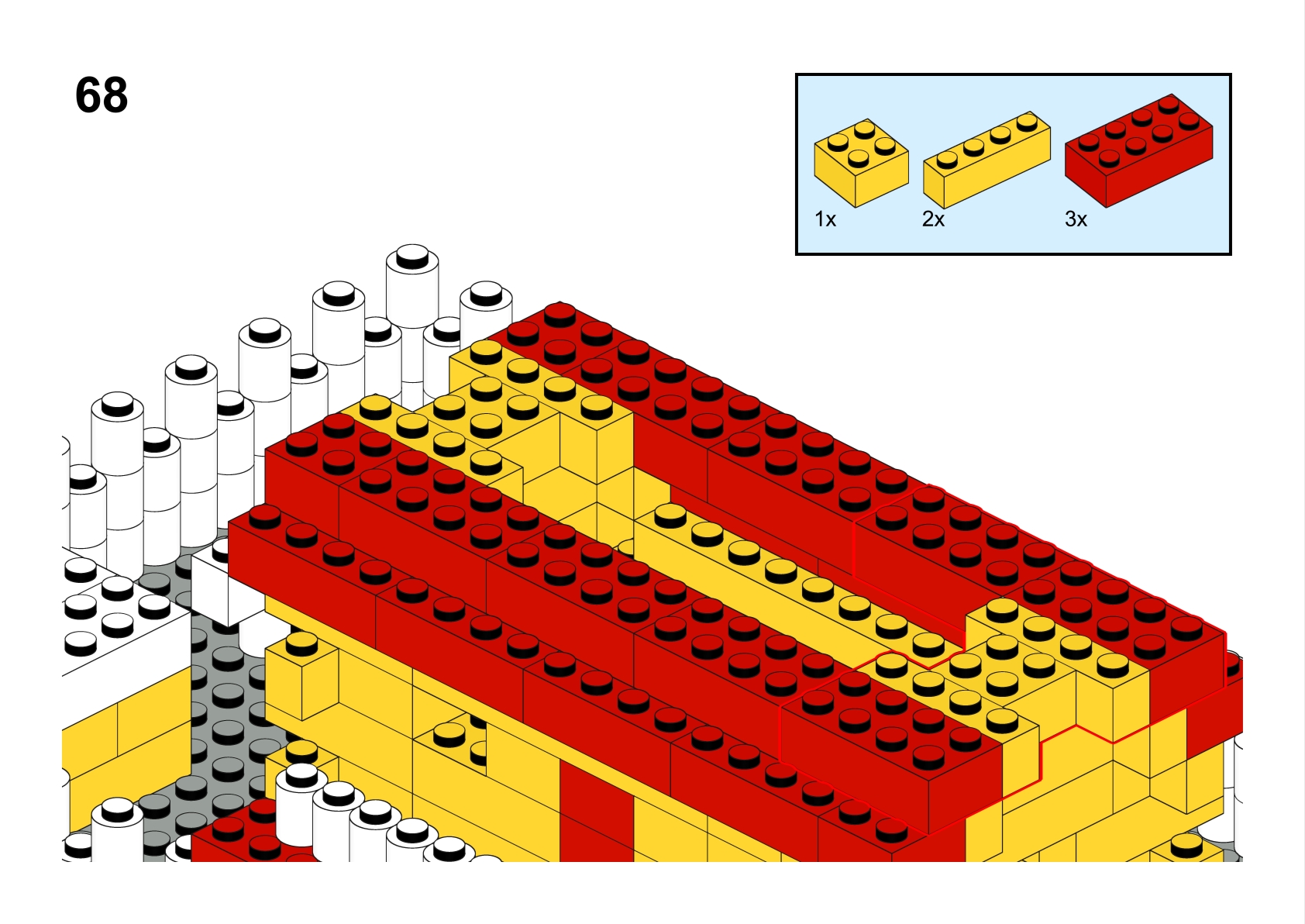 It features a simple rectangular structure with white or gray walls, a red roof, a fence and a barbecue, using the 1960s primary color palette. It doesn’t use any doors or windows.