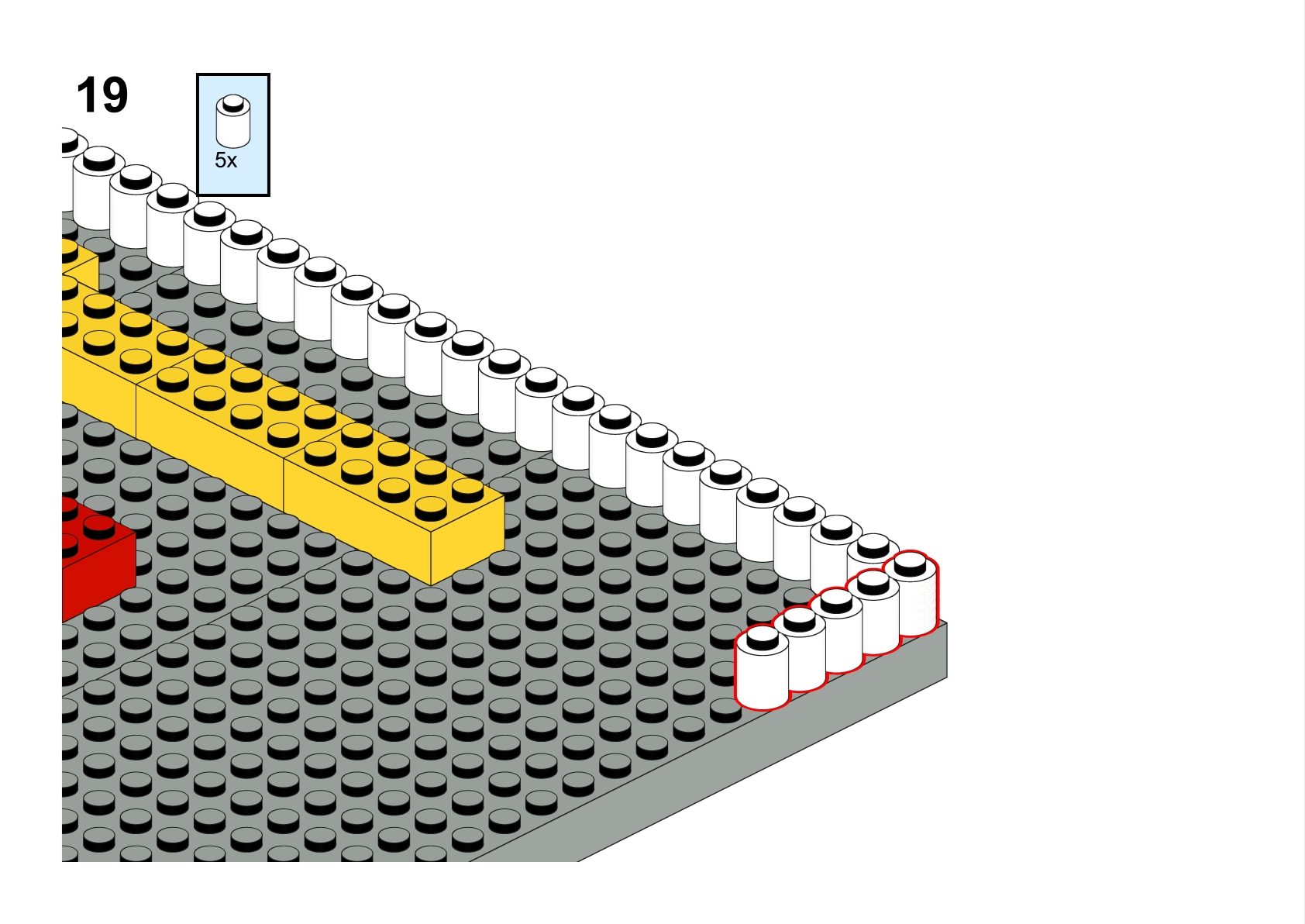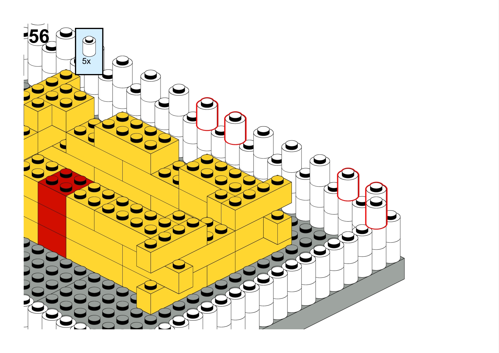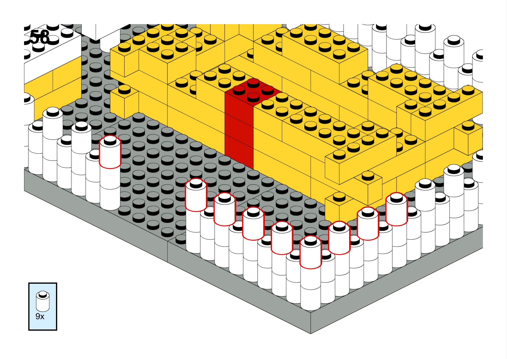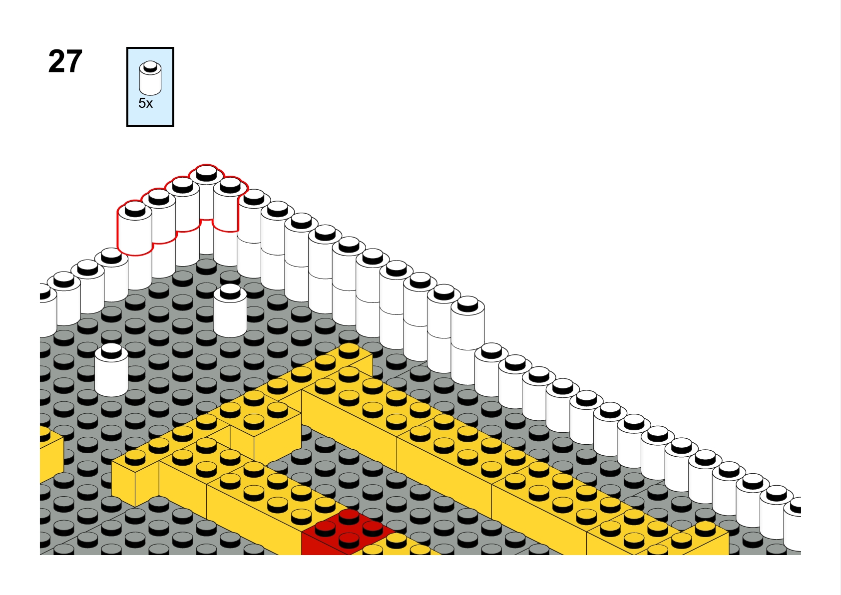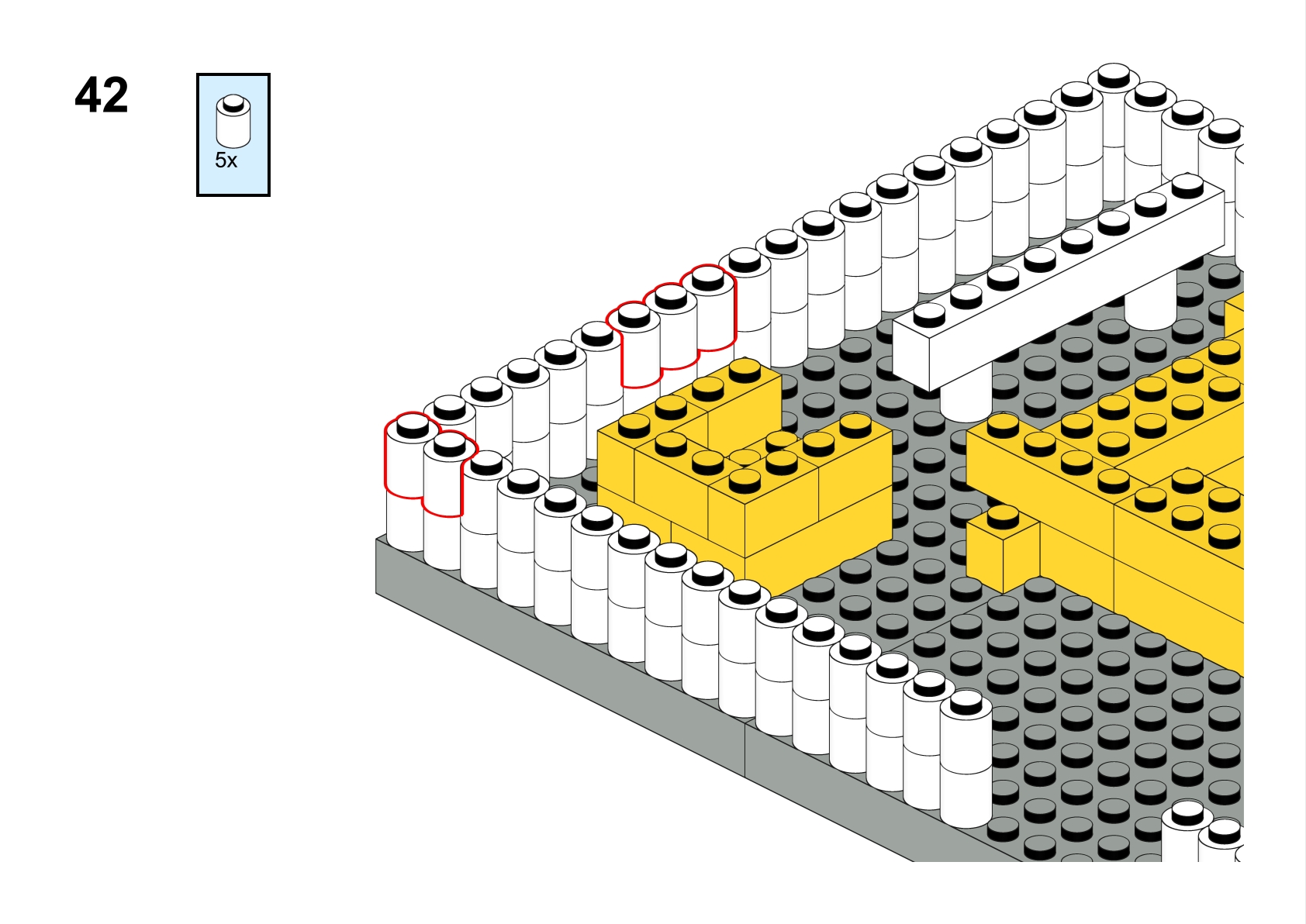 It features a simple rectangular structure with white or gray walls, a red roof, a fence and a barbecue, using the 1960s primary color palette. It doesn’t use any doors or windows.