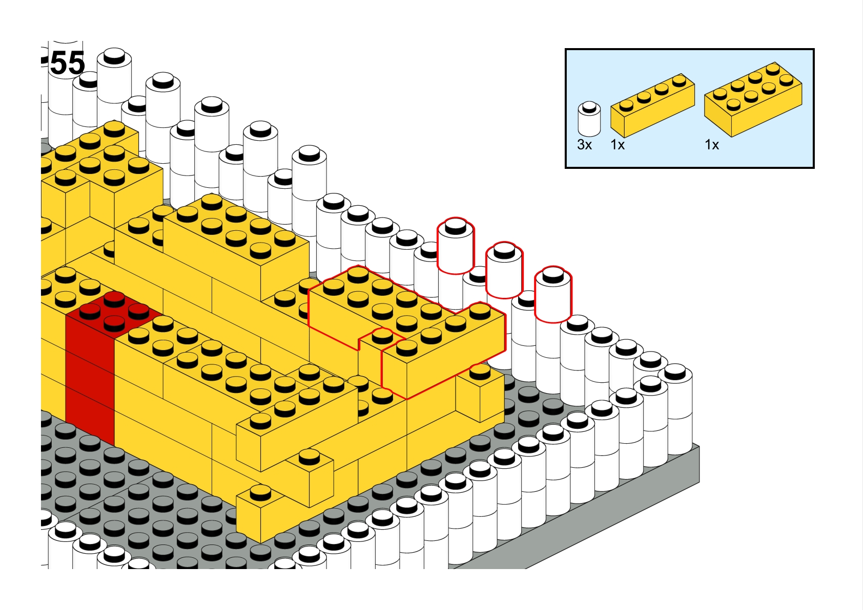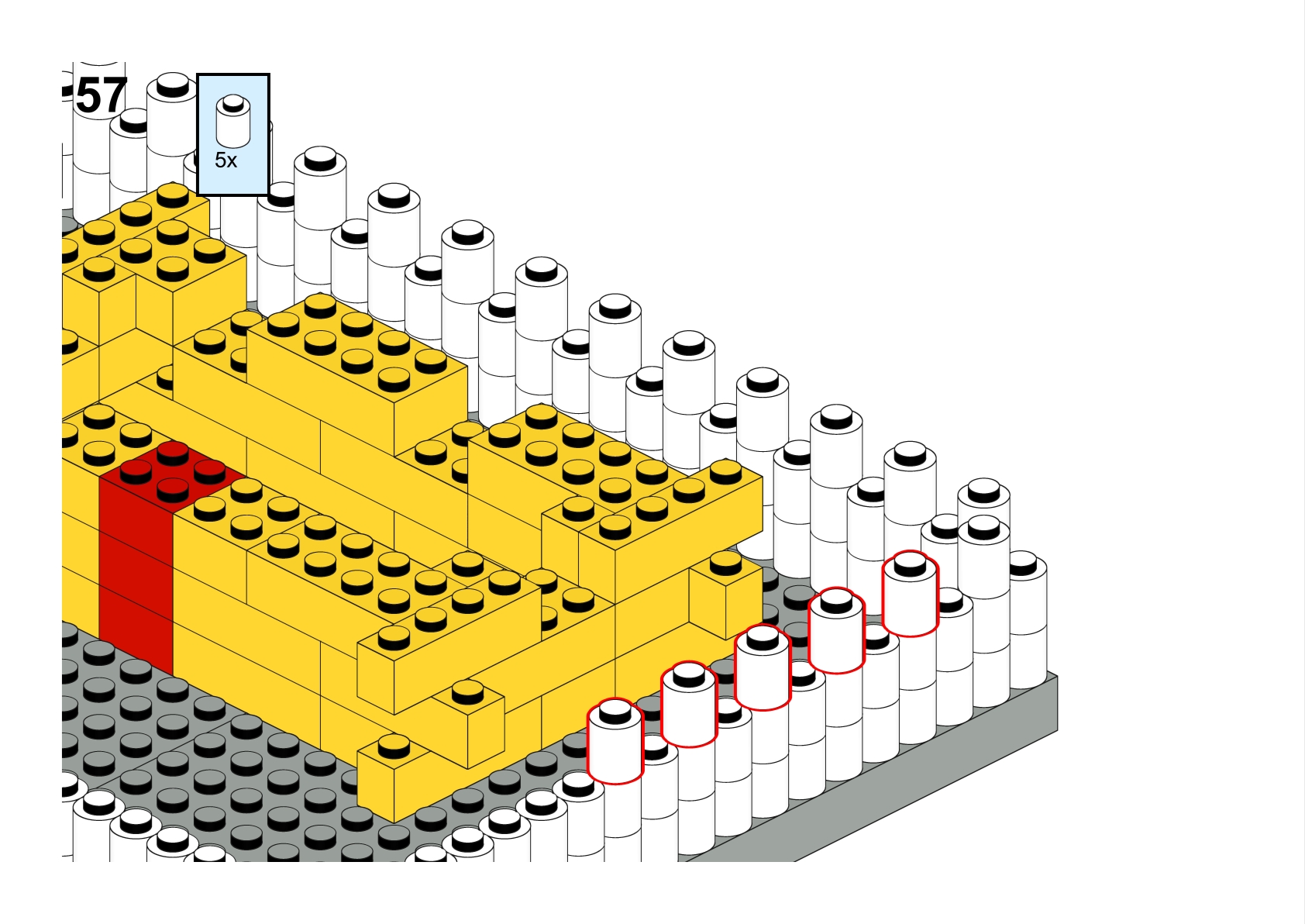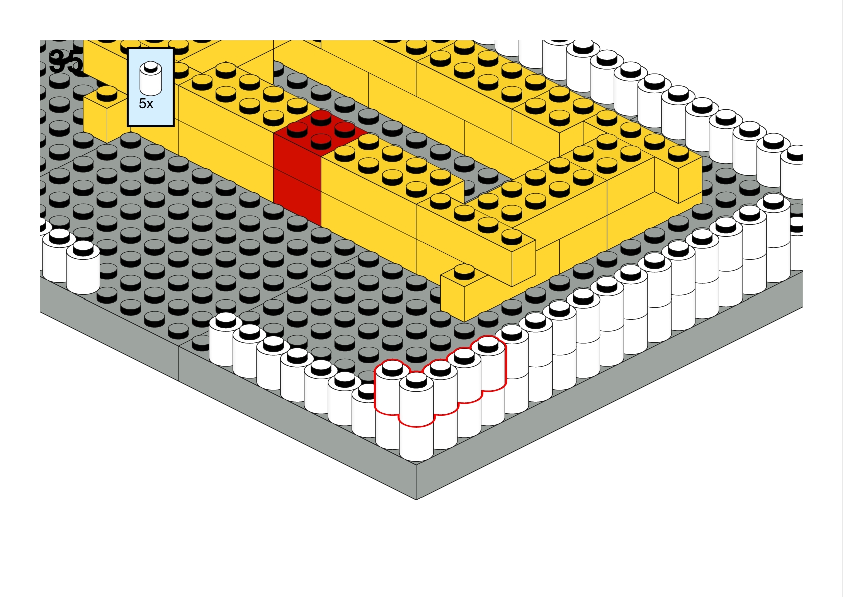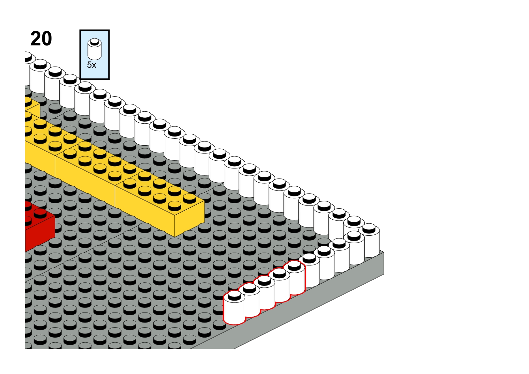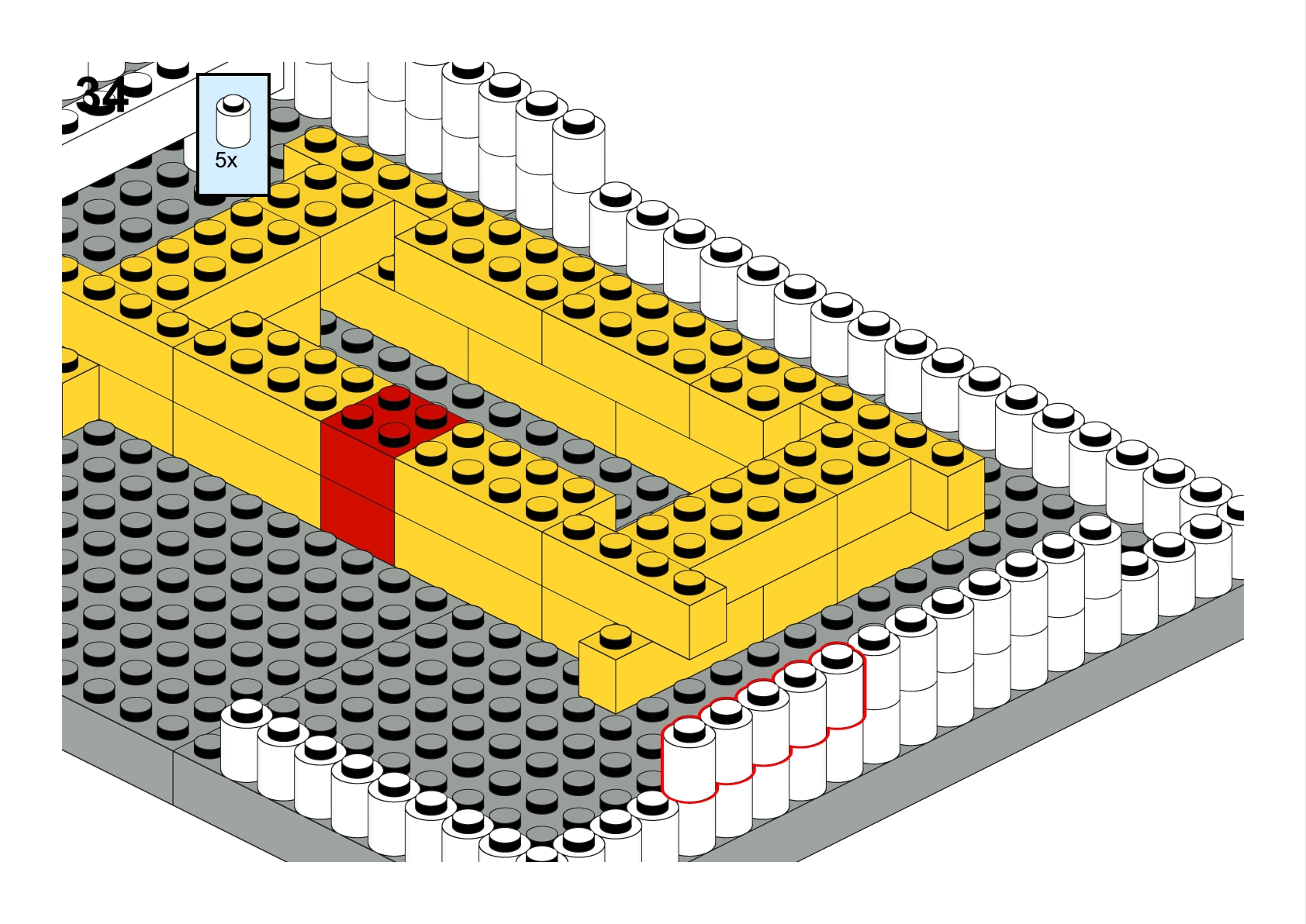 It features a simple rectangular structure with white or gray walls, a red roof, a fence and a barbecue, using the 1960s primary color palette. It doesn’t use any doors or windows.