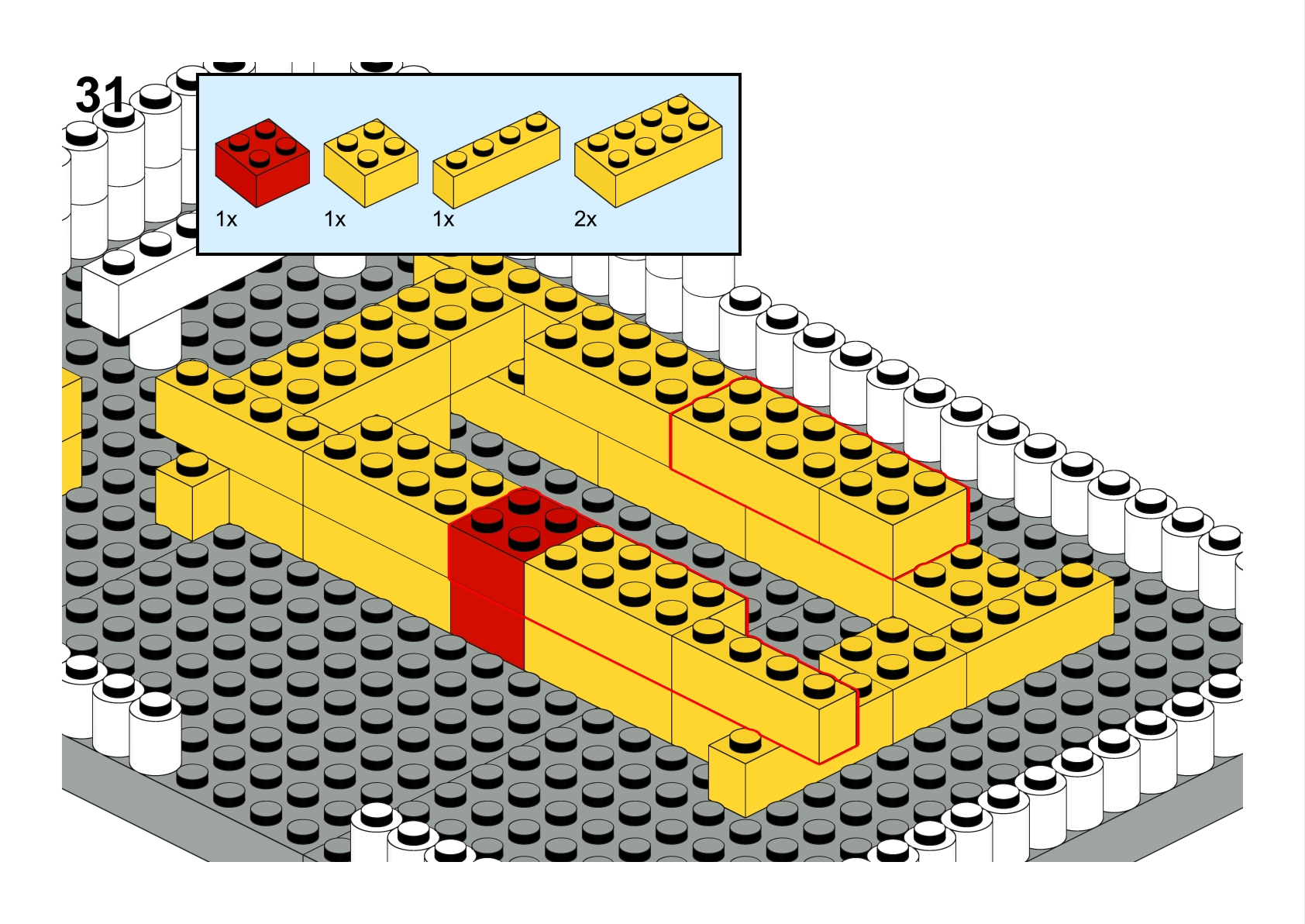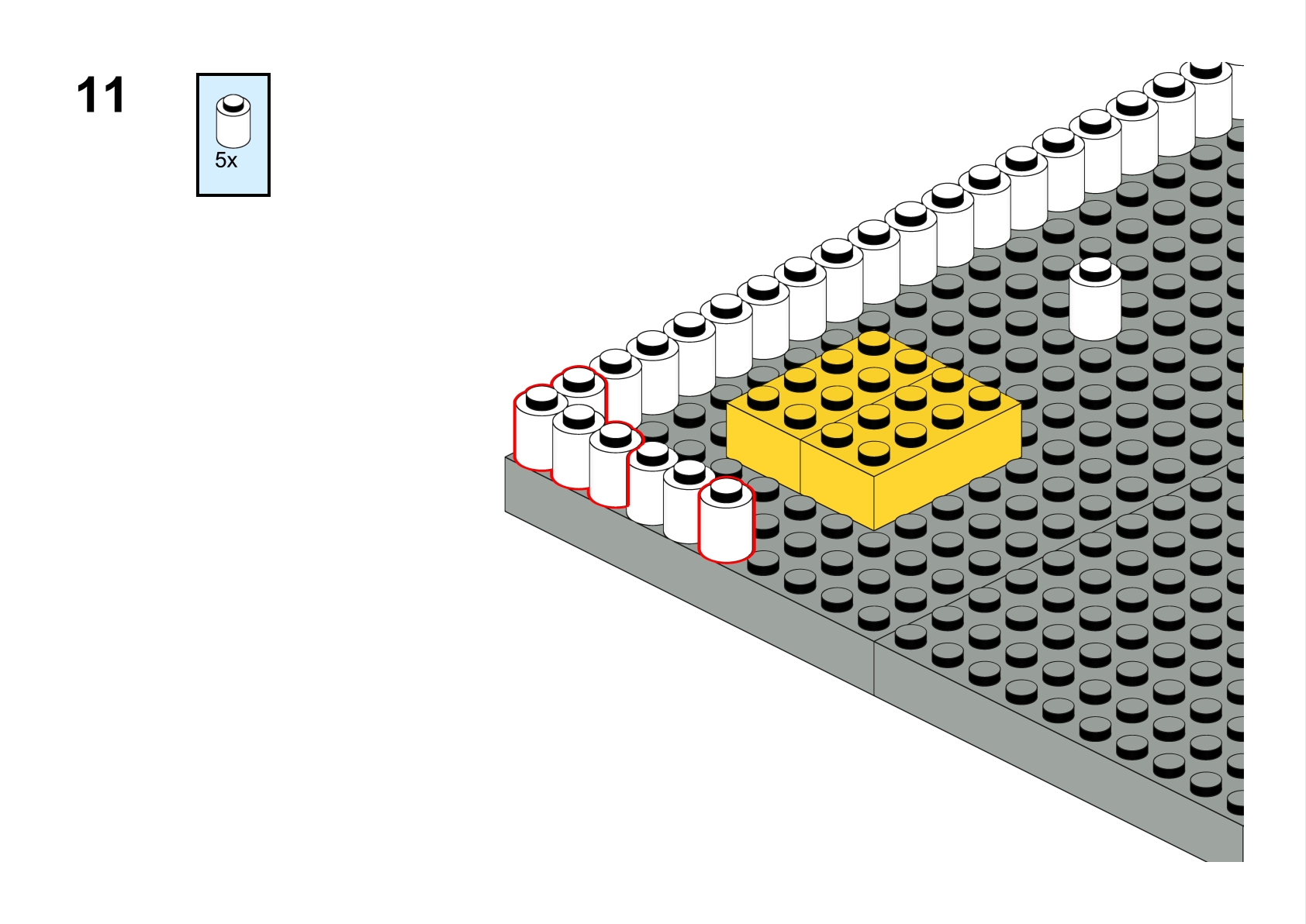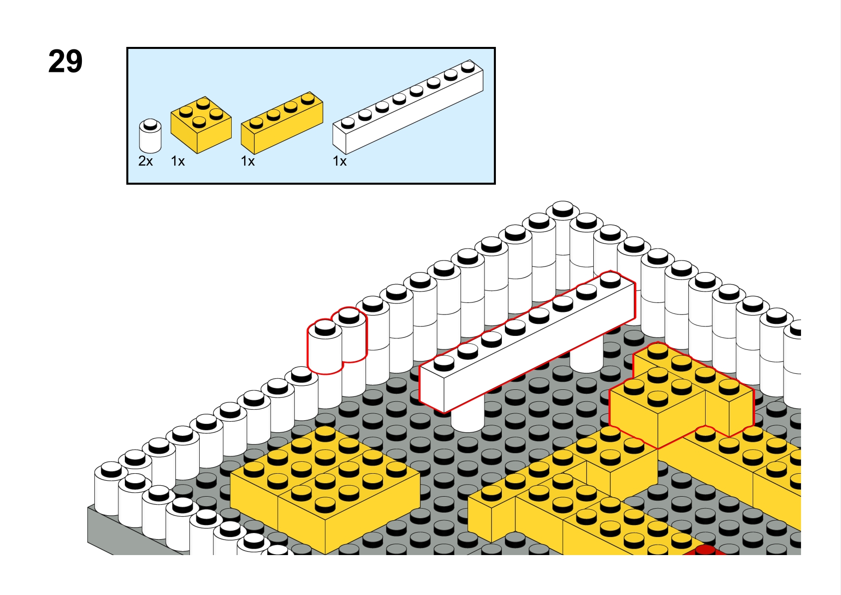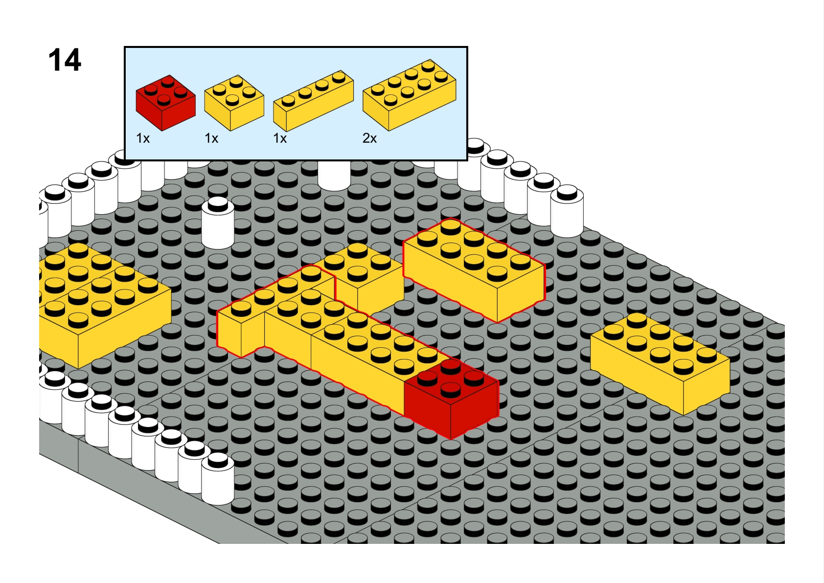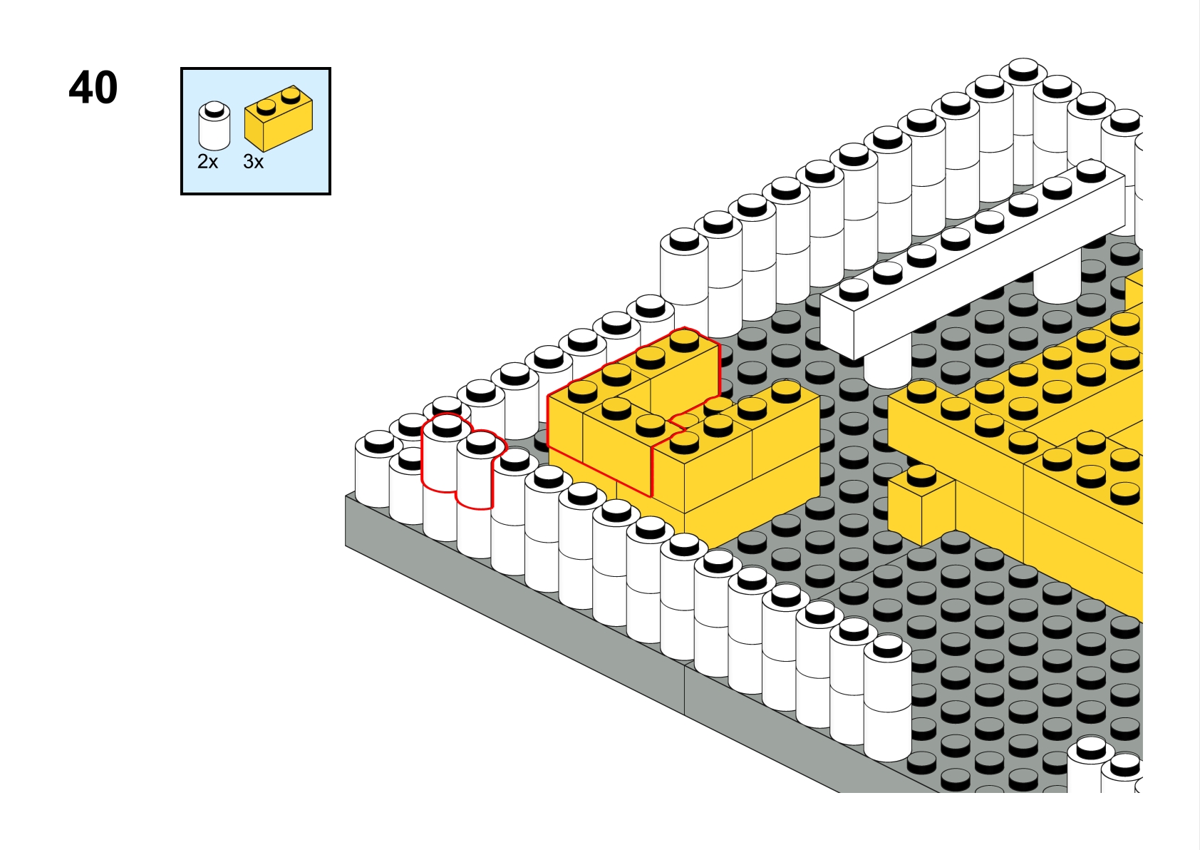 It features a simple rectangular structure with white or gray walls, a red roof, a fence and a barbecue, using the 1960s primary color palette. It doesn’t use any doors or windows.