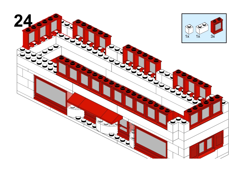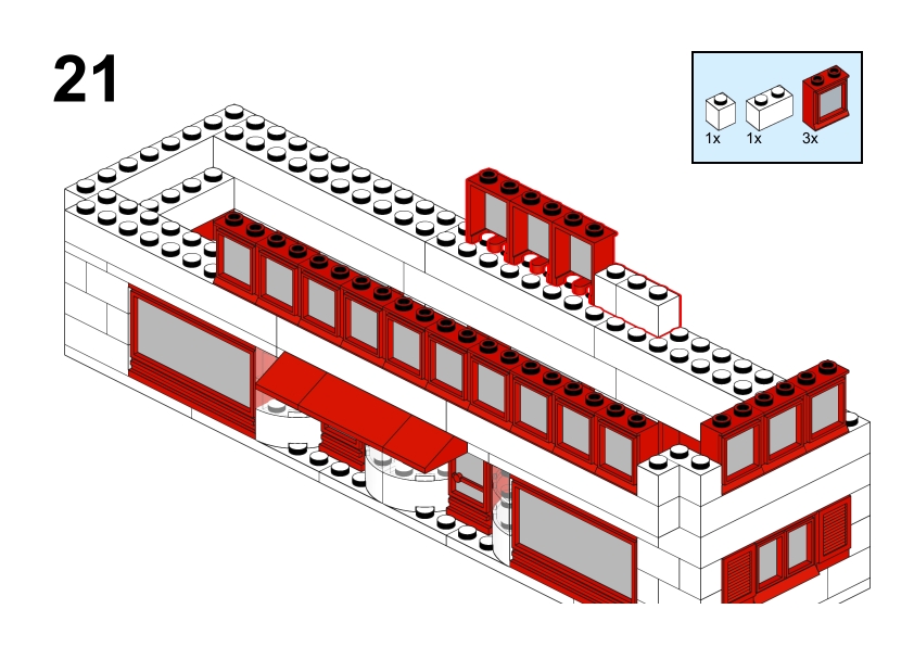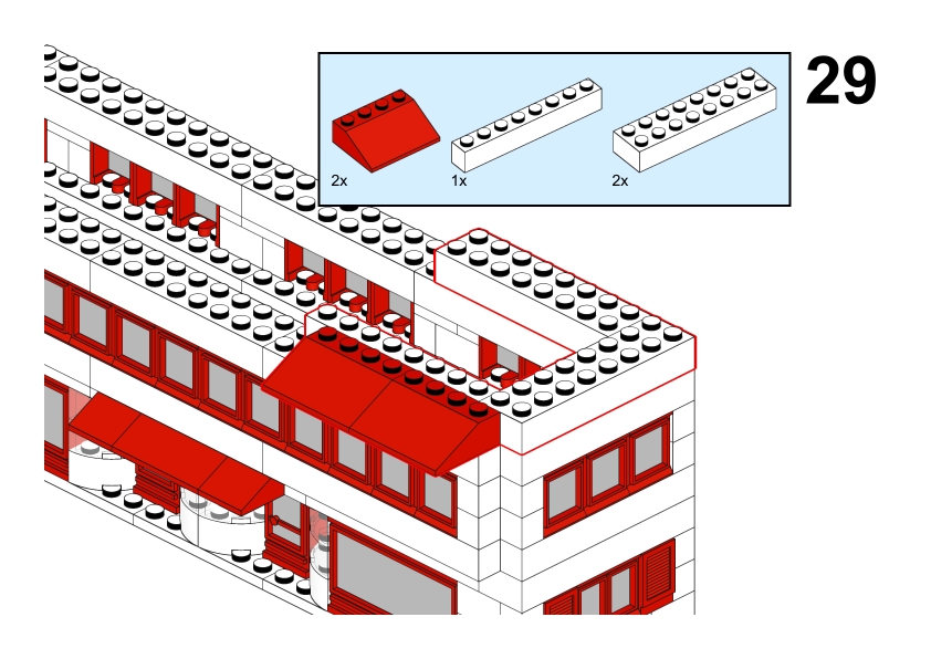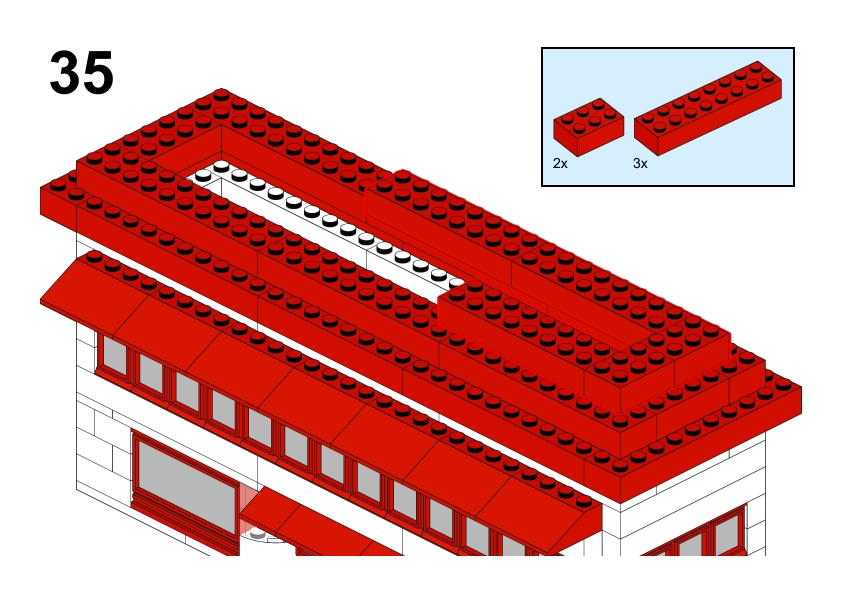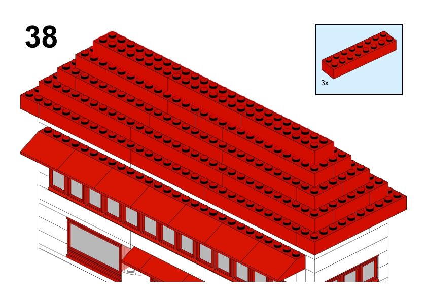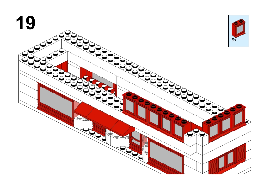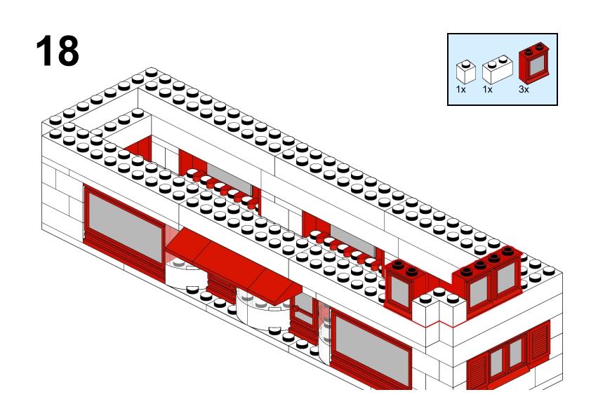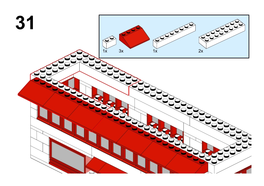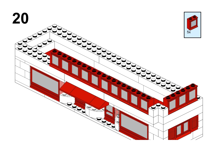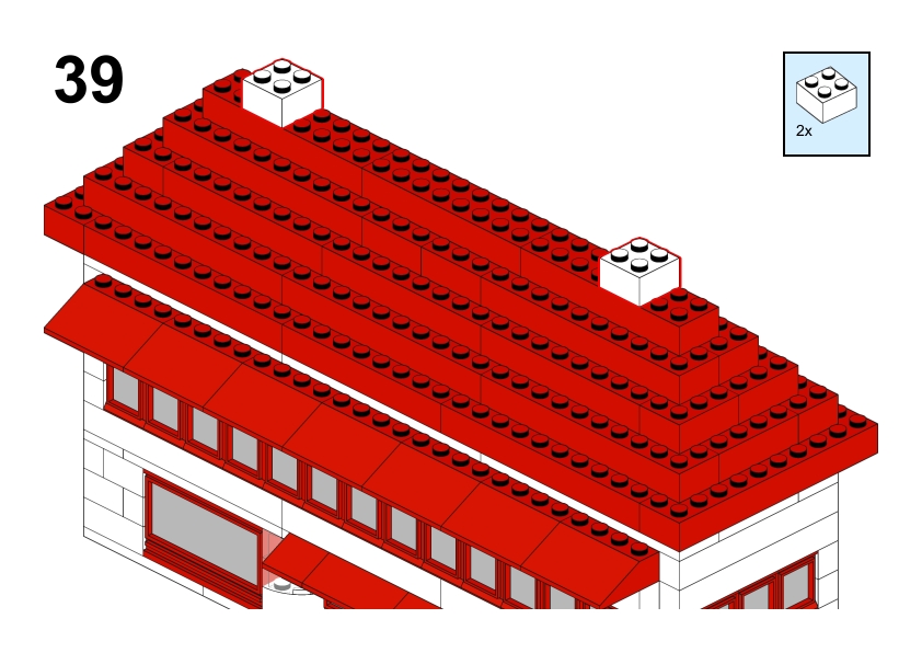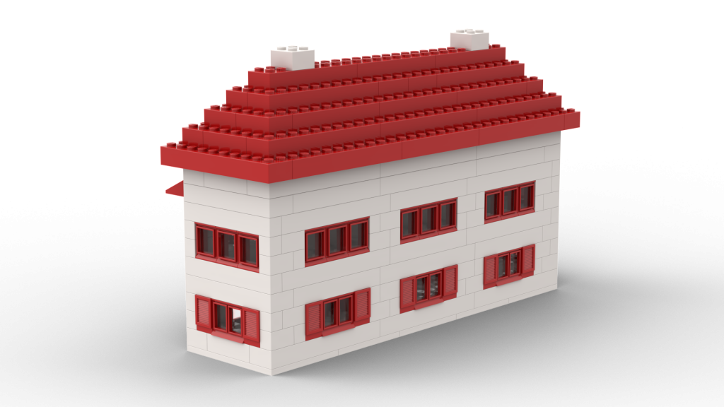 The hotel features a two-story rectangular building with a white exterior and a vibrant red, sloped roof, a hallmark of LEGO’s classic architectural style from the 1960s. The roof has a stepped, gabled design, with small white chimney elements at each end, adding a touch of detail. The facade is adorned with large, transparent windows framed in red, giving the building a bright and welcoming appearance. These windows span both floors, suggesting spacious interiors, possibly a lobby on the ground floor and guest rooms above.