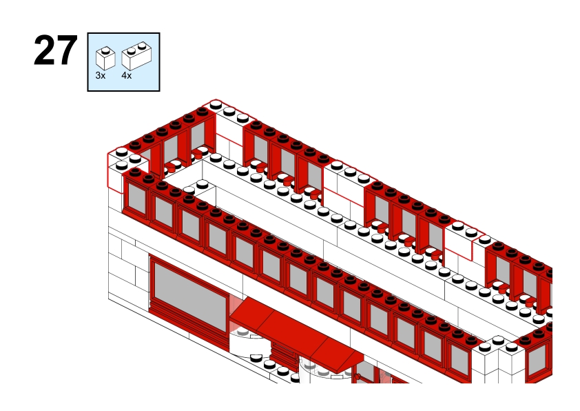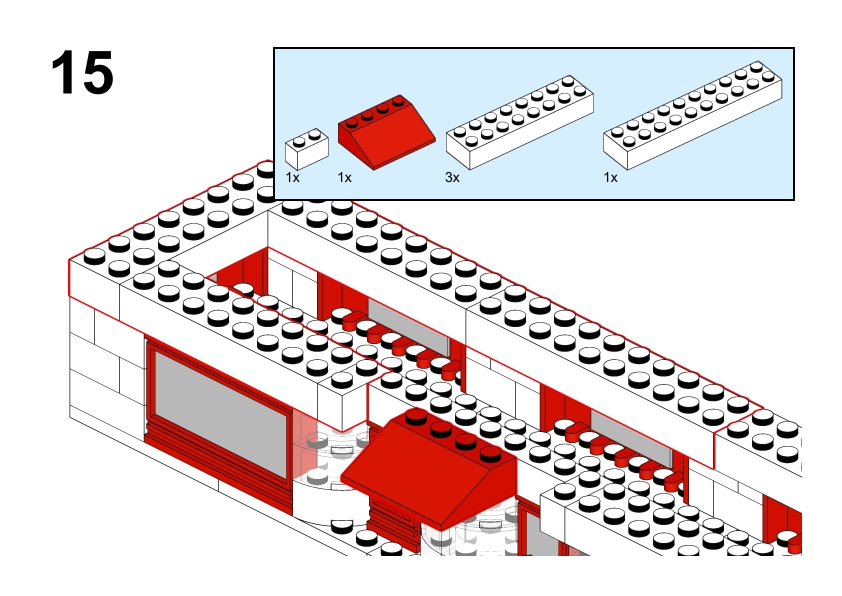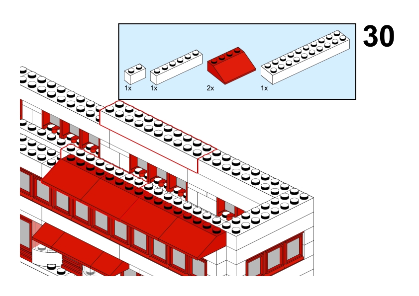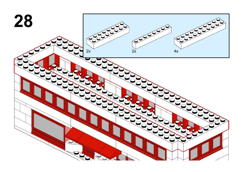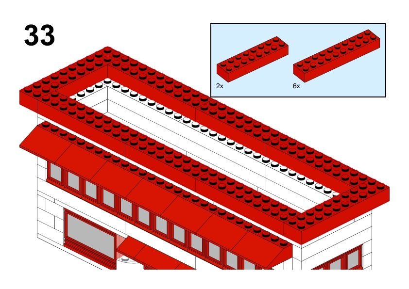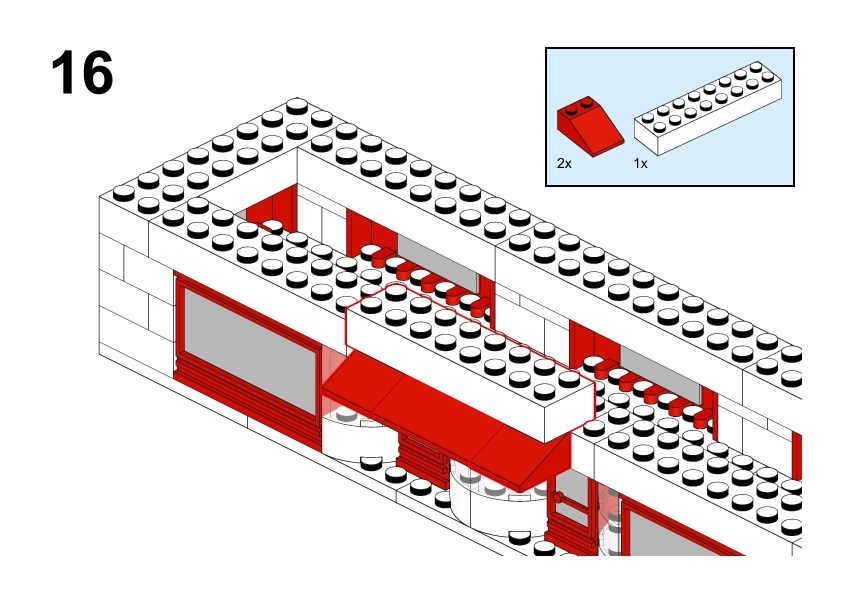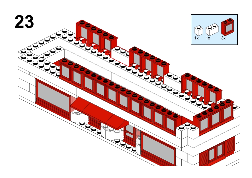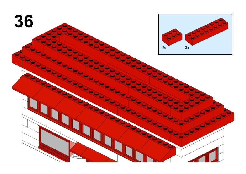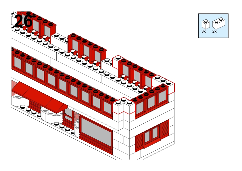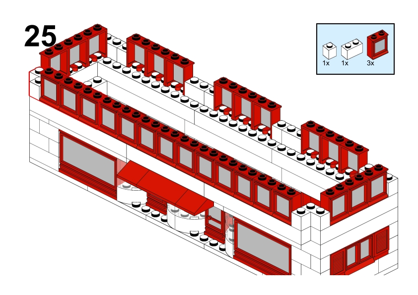 The hotel features a two-story rectangular building with a white exterior and a vibrant red, sloped roof, a hallmark of LEGO’s classic architectural style from the 1960s. The roof has a stepped, gabled design, with small white chimney elements at each end, adding a touch of detail. The facade is adorned with large, transparent windows framed in red, giving the building a bright and welcoming appearance. These windows span both floors, suggesting spacious interiors, possibly a lobby on the ground floor and guest rooms above.