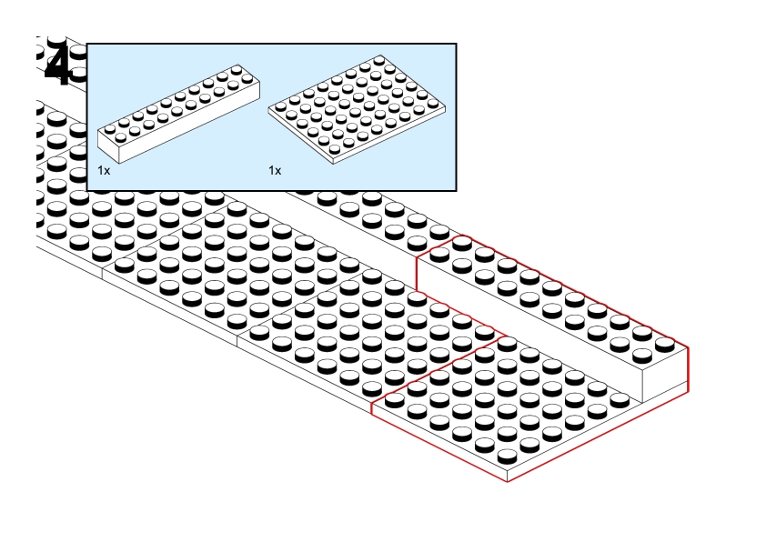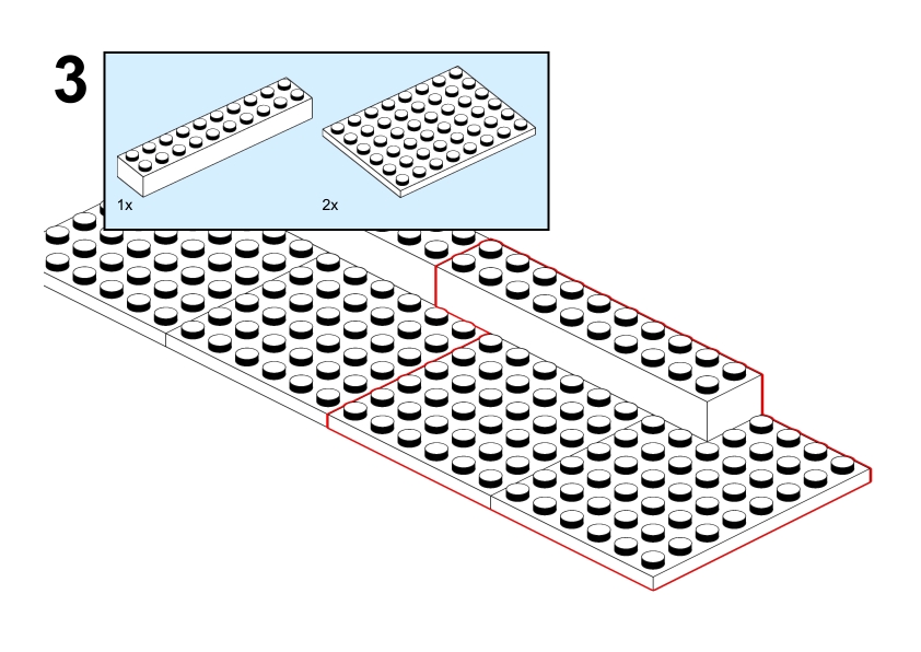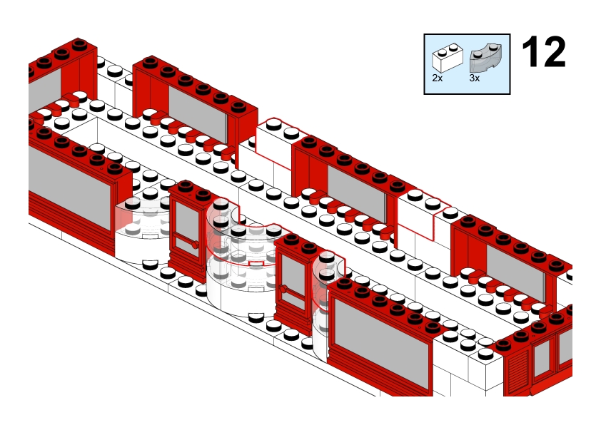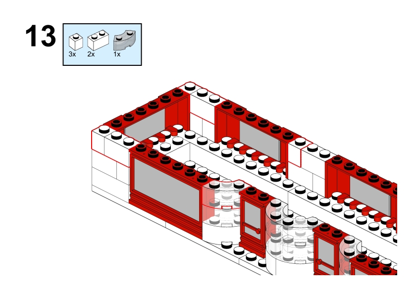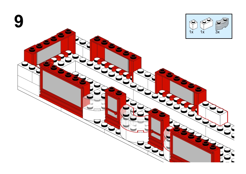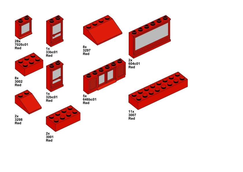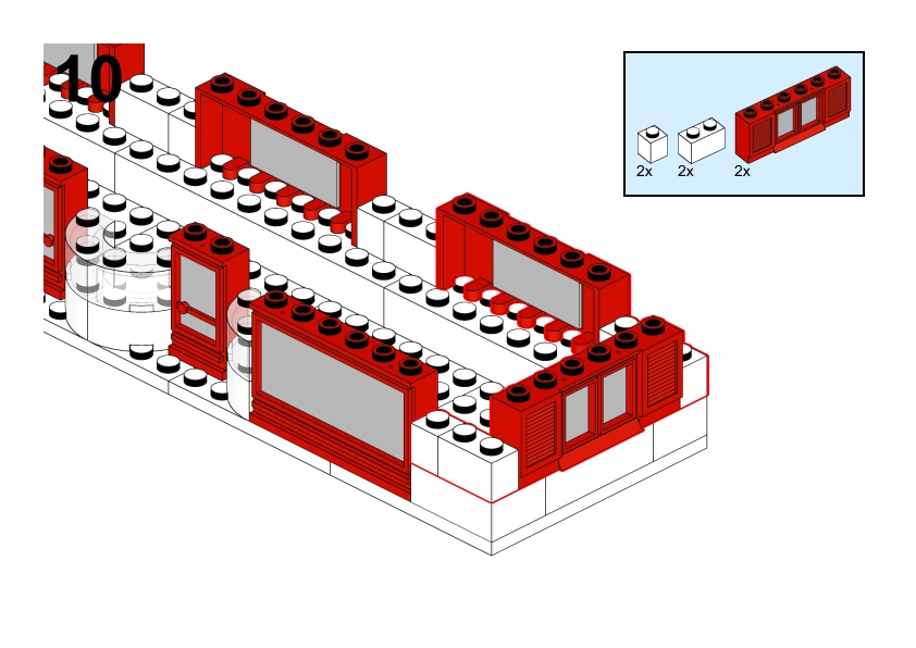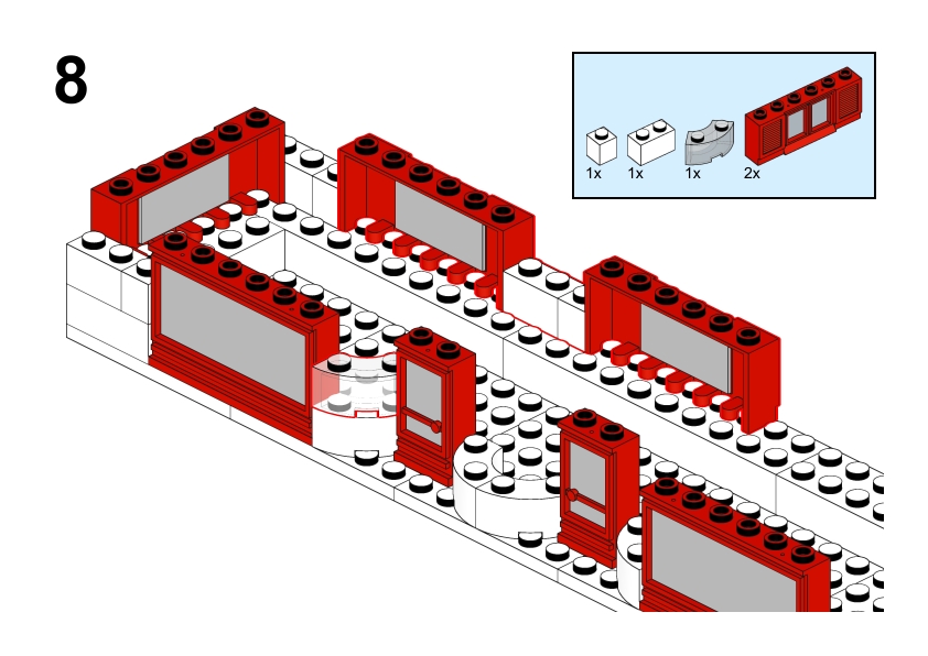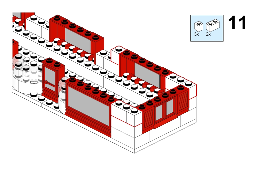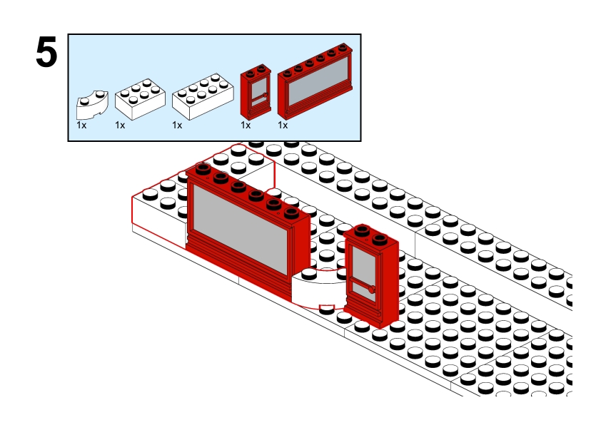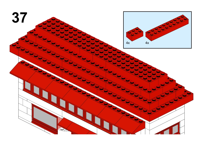 The hotel features a two-story rectangular building with a white exterior and a vibrant red, sloped roof, a hallmark of LEGO’s classic architectural style from the 1960s. The roof has a stepped, gabled design, with small white chimney elements at each end, adding a touch of detail. The facade is adorned with large, transparent windows framed in red, giving the building a bright and welcoming appearance. These windows span both floors, suggesting spacious interiors, possibly a lobby on the ground floor and guest rooms above.