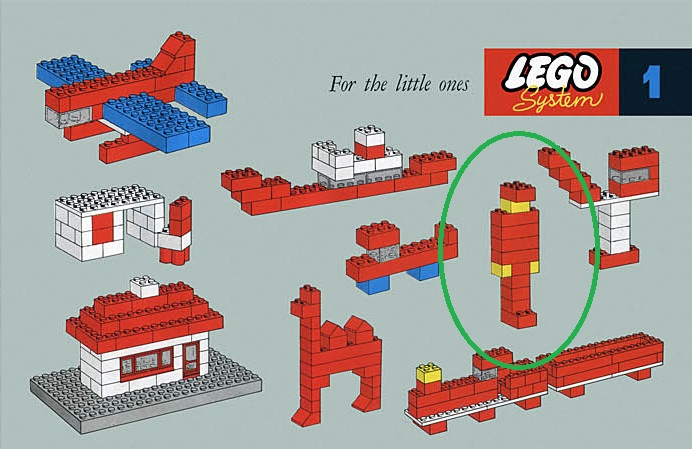 Welcome to the guide for building a delightful LEGO creation inspired by the classic designs of the LEGO System Idea Book no 1, page 1, tailored for young children as explicited : “For the little ones”. The construction highlighted within the green circle features a simple figure, crafted with basic pieces for easy assembly. On this page, you’ll find step-by-step instructions and a complete inventory of parts to recreate this basic model, perfect for young kid to start building like in the 50’s and 60’s !