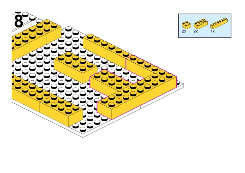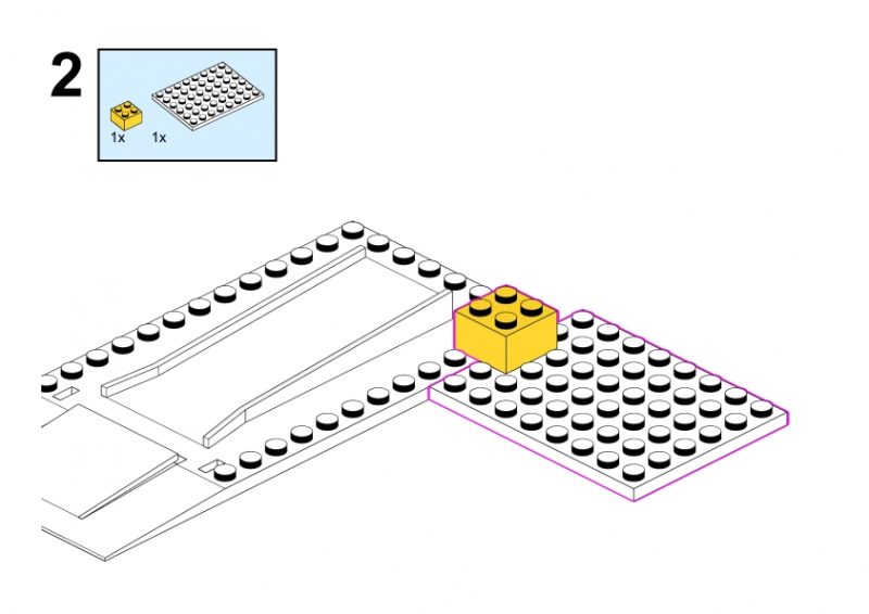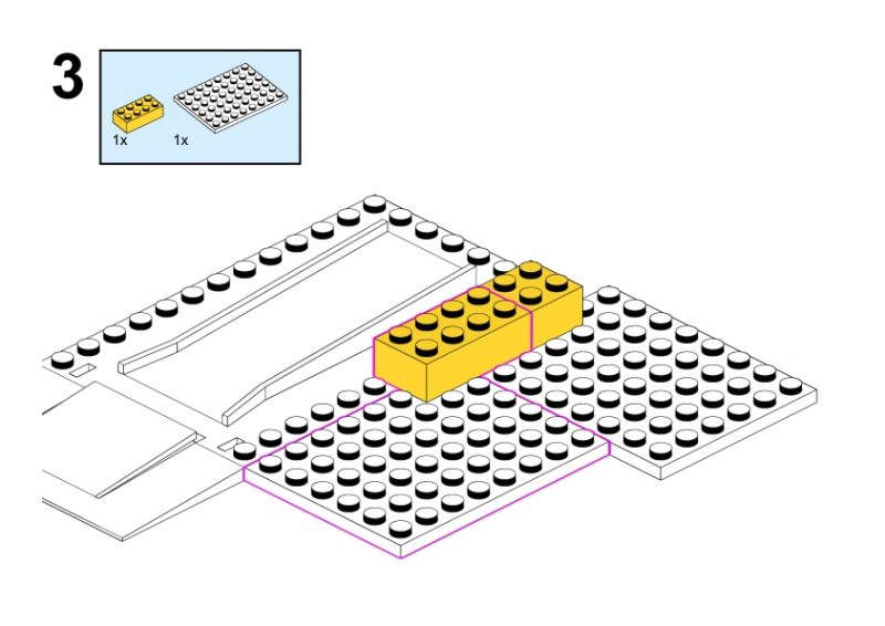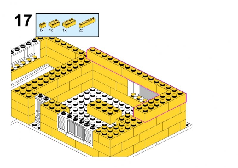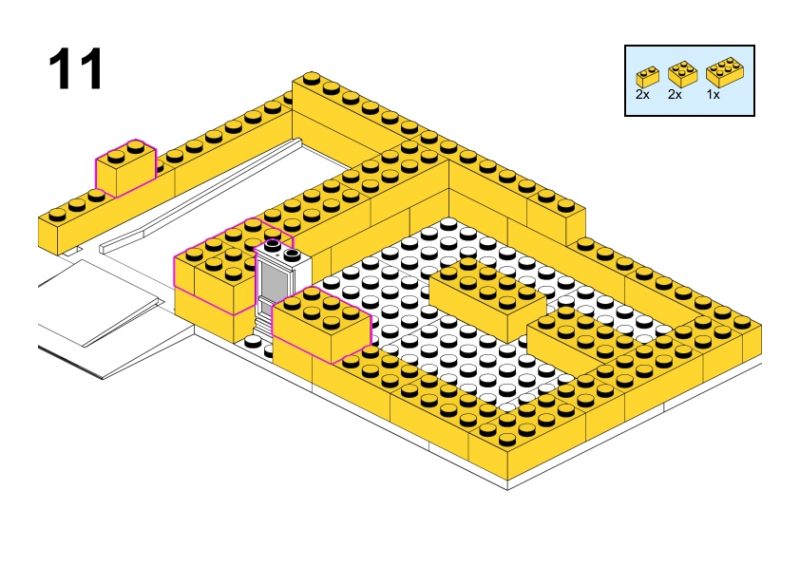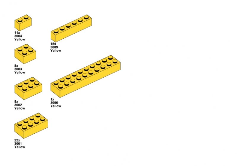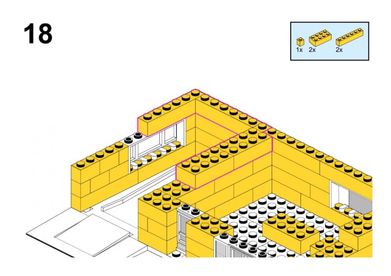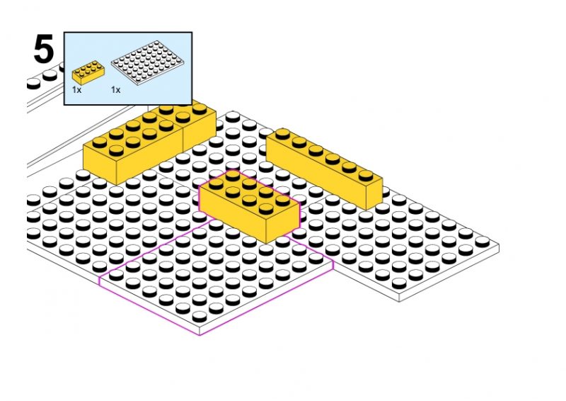 This image, taken from the LEGO System Idea Book 1 (238-0), page 2, features a variety of house designs under the theme “Something about houses.” The construction highlighted within the green circle showcases a distinctive yellow house with a pyramidal red roof and a garage, standing out with its unique architectural style. On this web page, we provide step-by-step instructions to build this charming yellow house. Notably, the original image depicts a continuous white plate as a base with dozens of studs, which did not exist in LEGO sets at the time; instead, I build it using a 6×8 white plate, a commonly utilized piece from that era, to achieve a similar effect.
