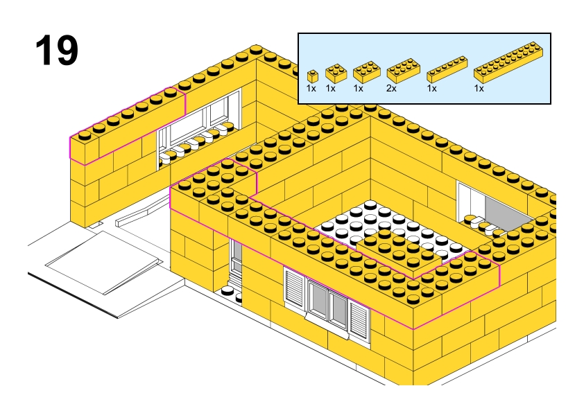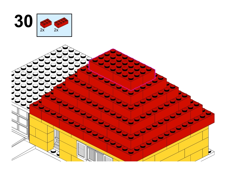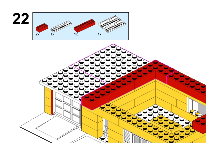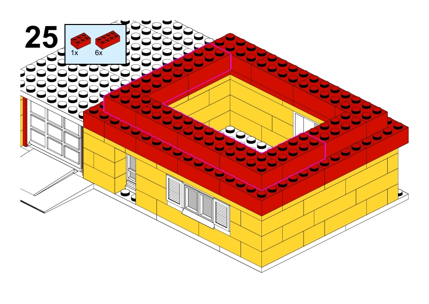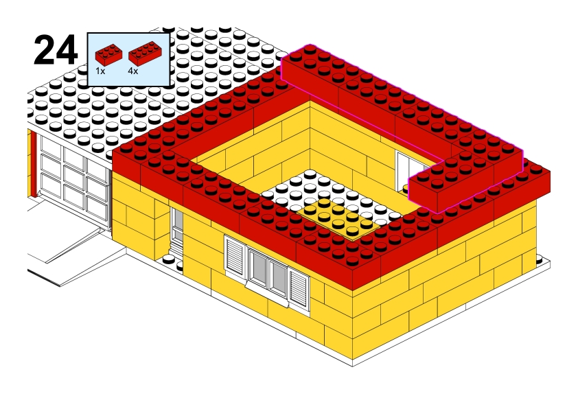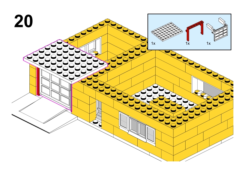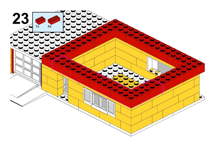 This image, taken from the LEGO System Idea Book 1 (238-0), page 2, features a variety of house designs under the theme “Something about houses.” The construction highlighted within the green circle showcases a distinctive yellow house with a pyramidal red roof and a garage, standing out with its unique architectural style. On this web page, we provide step-by-step instructions to build this charming yellow house. Notably, the original image depicts a continuous white plate as a base with dozens of studs, which did not exist in LEGO sets at the time; instead, I build it using a 6×8 white plate, a commonly utilized piece from that era, to achieve a similar effect.