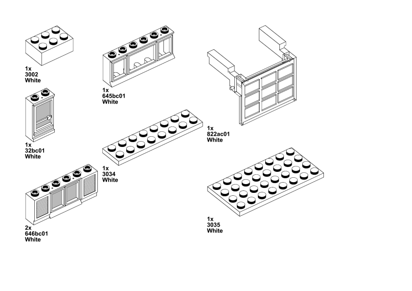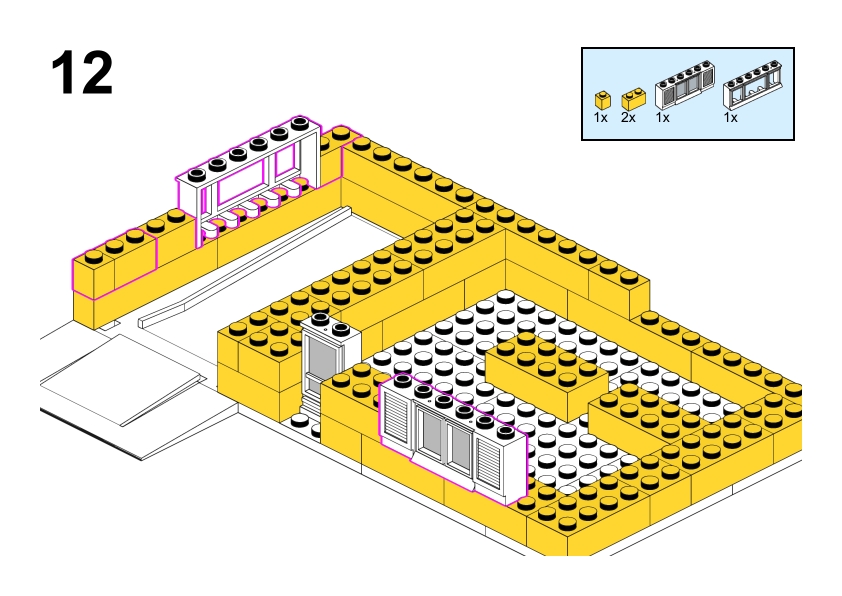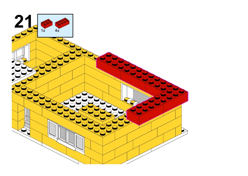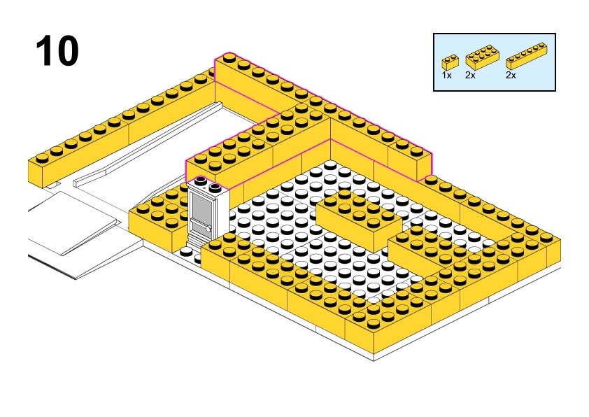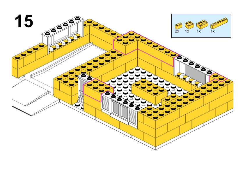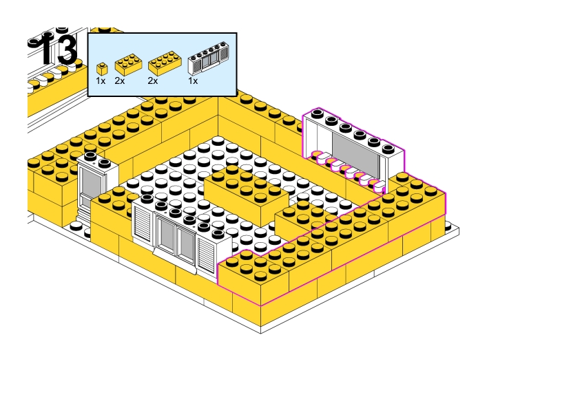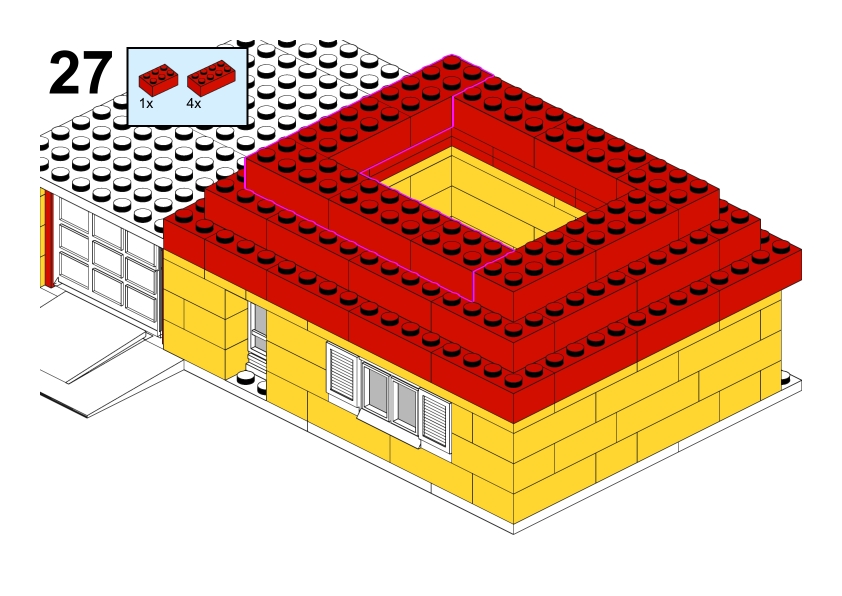 This image, taken from the LEGO System Idea Book 1 (238-0), page 2, features a variety of house designs under the theme “Something about houses.” The construction highlighted within the green circle showcases a distinctive yellow house with a pyramidal red roof and a garage, standing out with its unique architectural style. On this web page, we provide step-by-step instructions to build this charming yellow house. Notably, the original image depicts a continuous white plate as a base with dozens of studs, which did not exist in LEGO sets at the time; instead, I build it using a 6×8 white plate, a commonly utilized piece from that era, to achieve a similar effect.