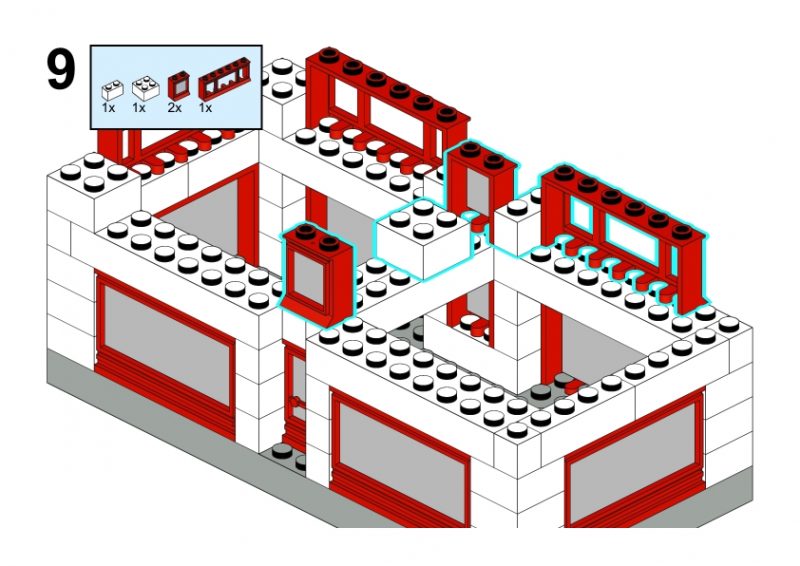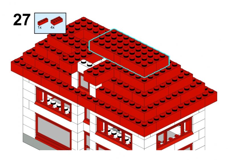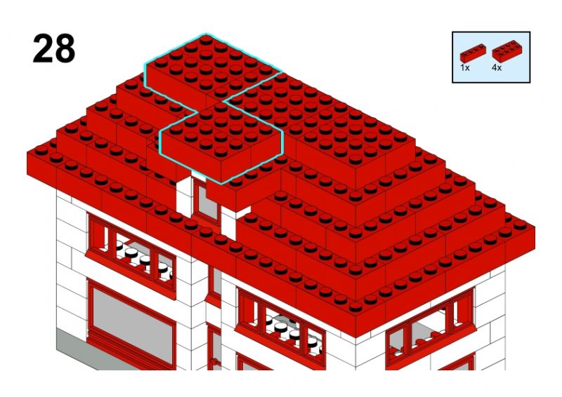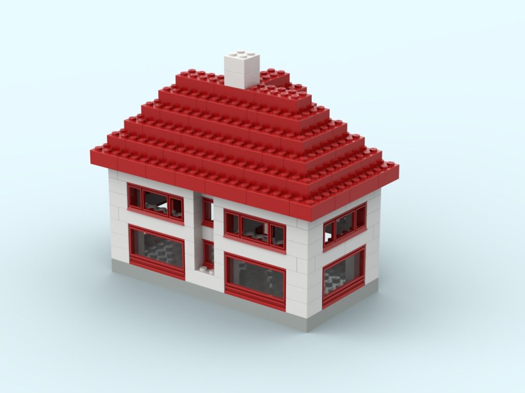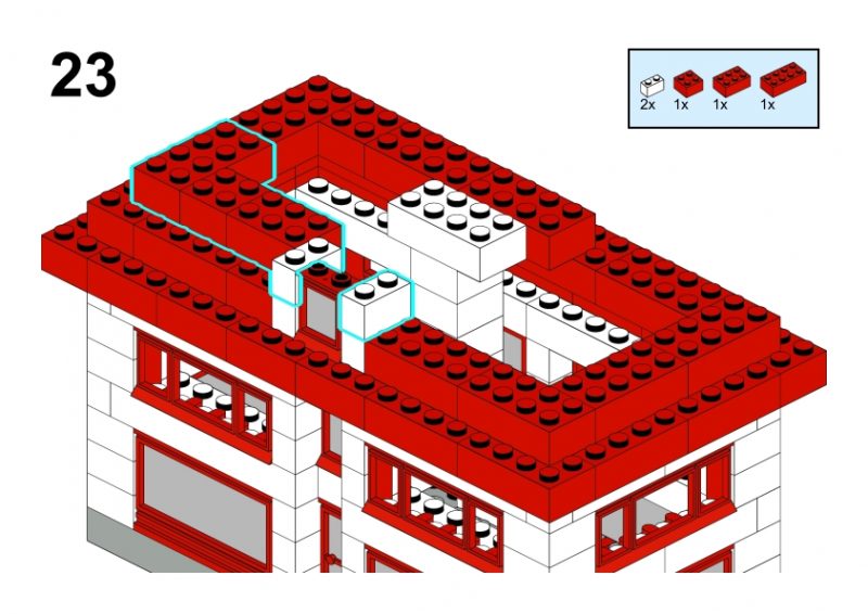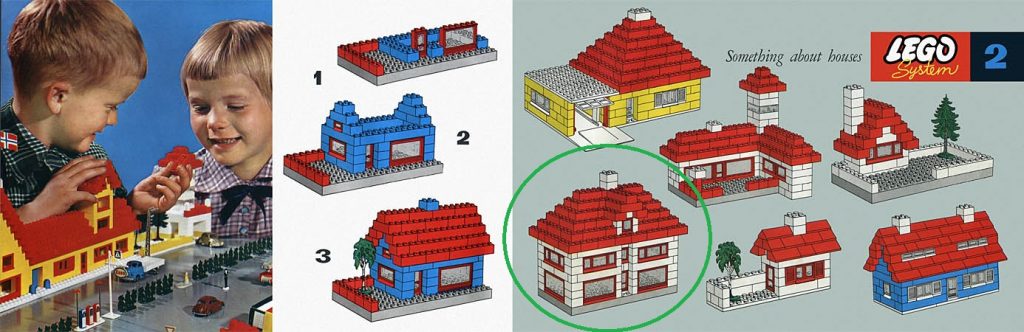This image, sourced from the LEGO System Idea Book1 (238-0), page 2 set under the theme “Something about houses,”. The construction highlighted within the green circle showcases a charming house with 2 floors, a red roof and white walls, decorated with a dormer window. On this web page, we provide step-by-step instructions to build this delightful house. Interestingly, the image includes pieces on top of the dormer window that did not exist in the original LEGO sets. Additionally, in the instructions provided, I have incorporated extra elements to ensure the roof’s stability. Also the back side of it is improvised based on the front, as this is the only existing picture of this construction.