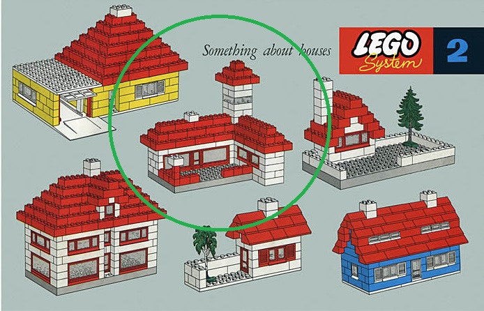 This image, sourced from page 2 of the LEGO Idea Book 1 (also referenced as set 238-0), showcases a variety of house designs under the theme “Something about houses.” The construction highlighted within the green circle features a charming L shaped house with a distinctive bricked red roof and a small entrance area. On this web page, we provide step-by-step instructions to help you build this delightful yellow house, allowing you to recreate this classic LEGO design from the 1950s.