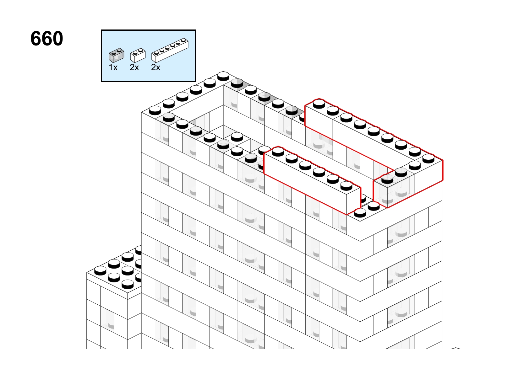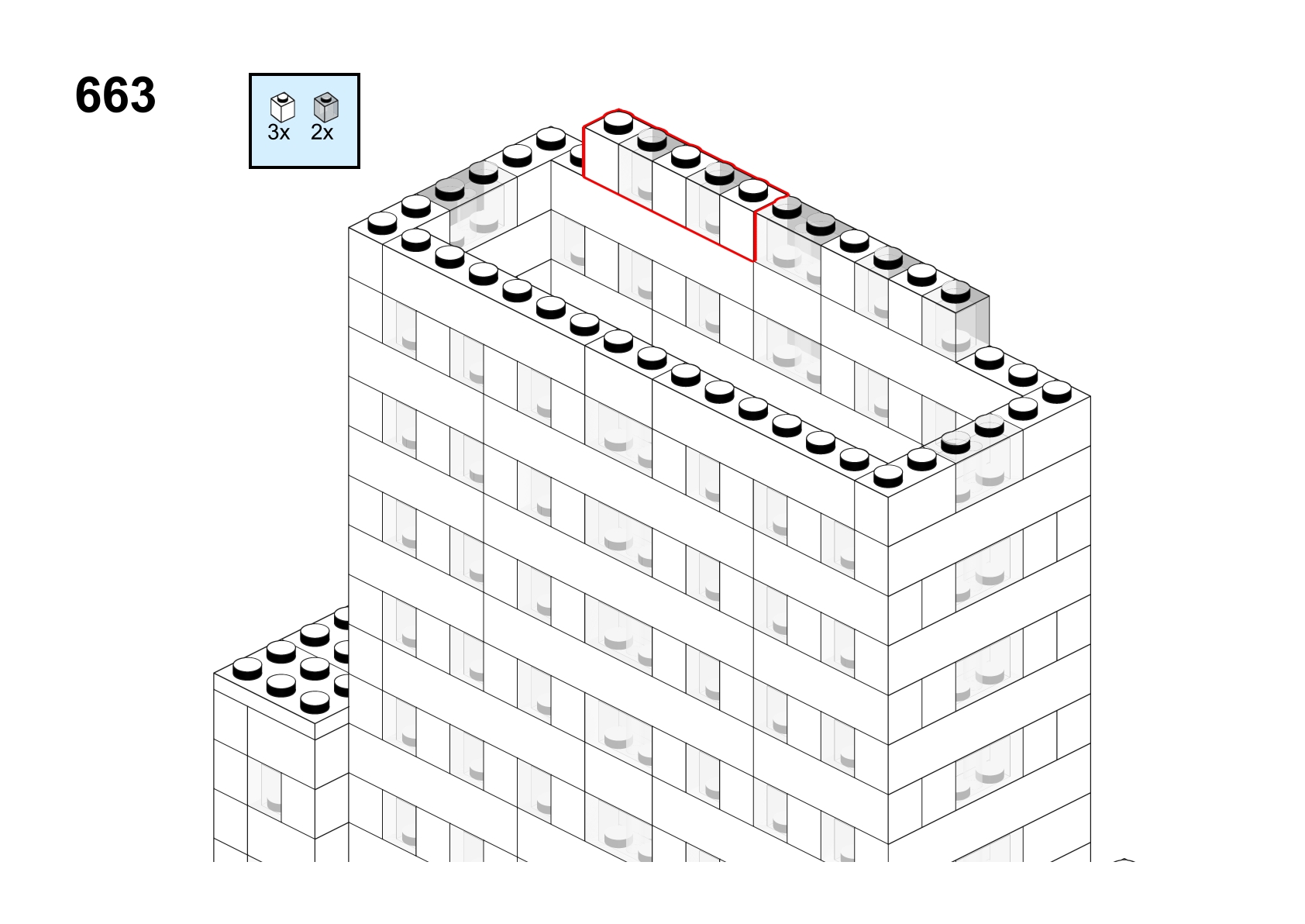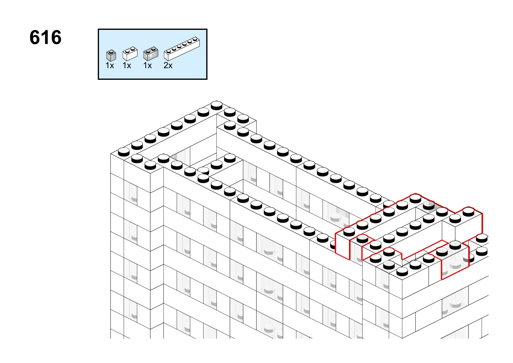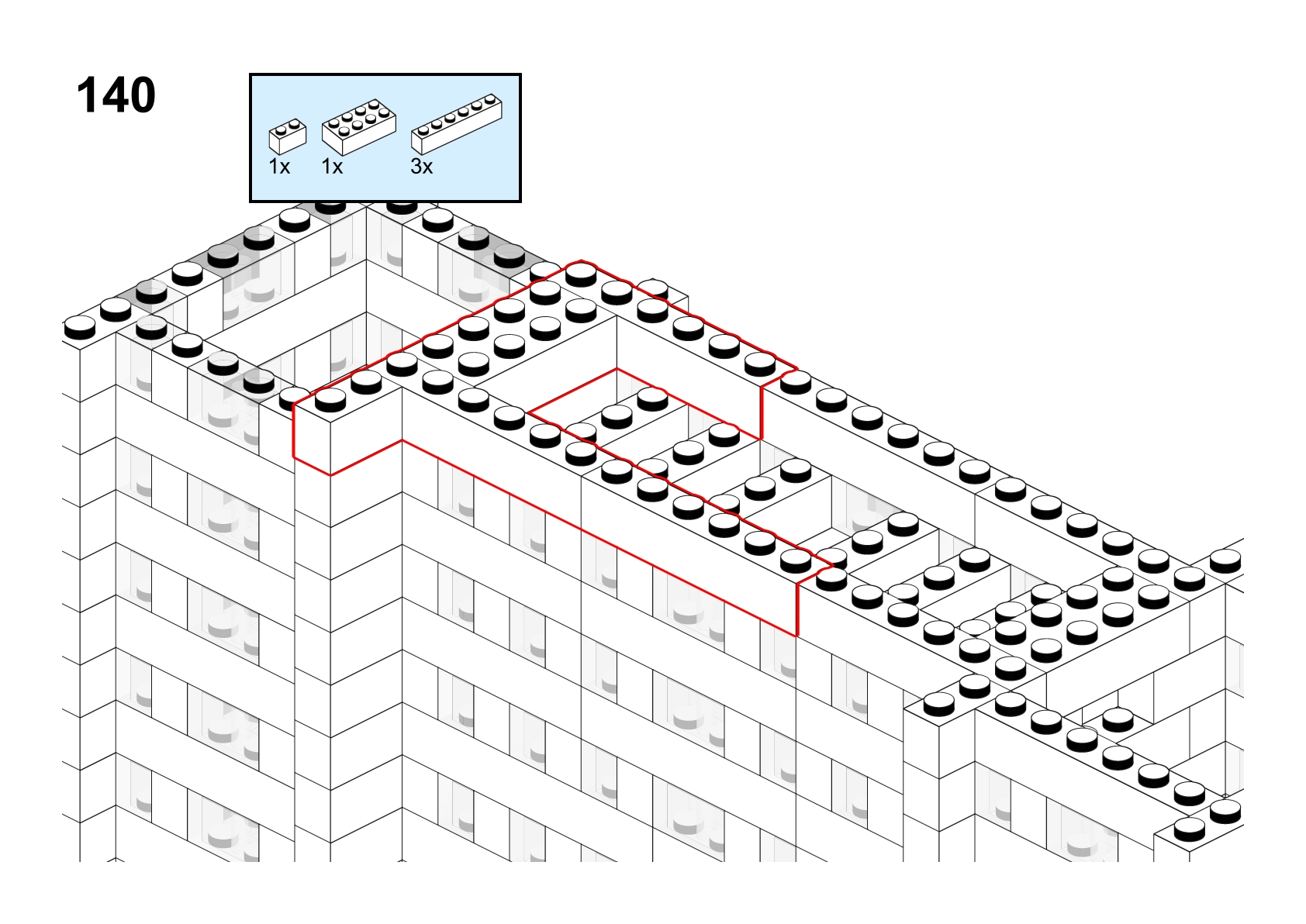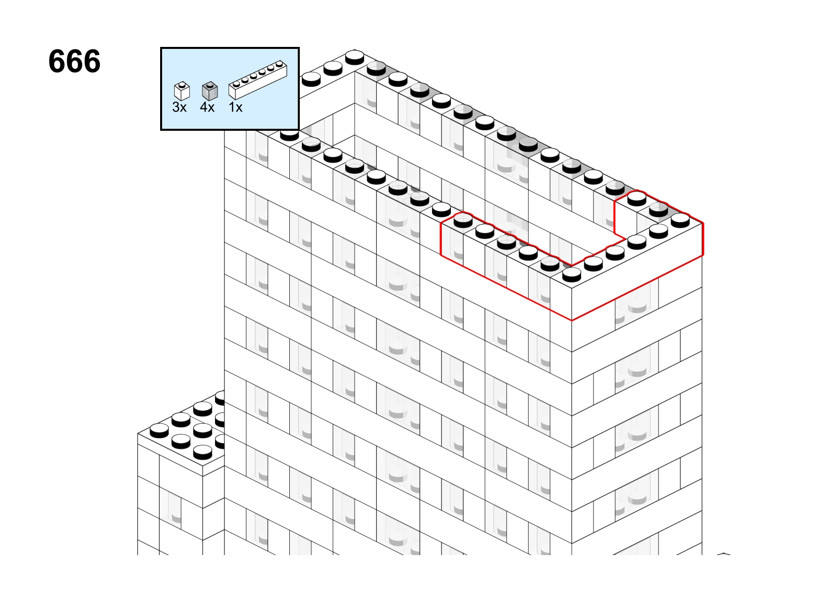 I have built it recently, and included a lighting system. I deviated a bit from the plan and inventory bellow to make it slightly lighter but same height and width. I have added a Hotel sign on top of the doors. Also the top 6 floors level in this version is 6 slots wide which makes it more comfortable, and I have reduced the number of inner reinforcement. It is stable and relatively solid. I’ll drop the insructions and inventory soon.