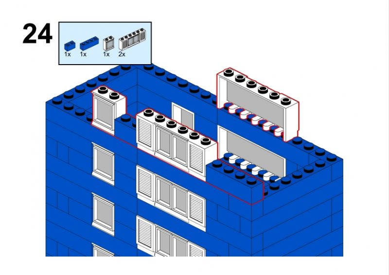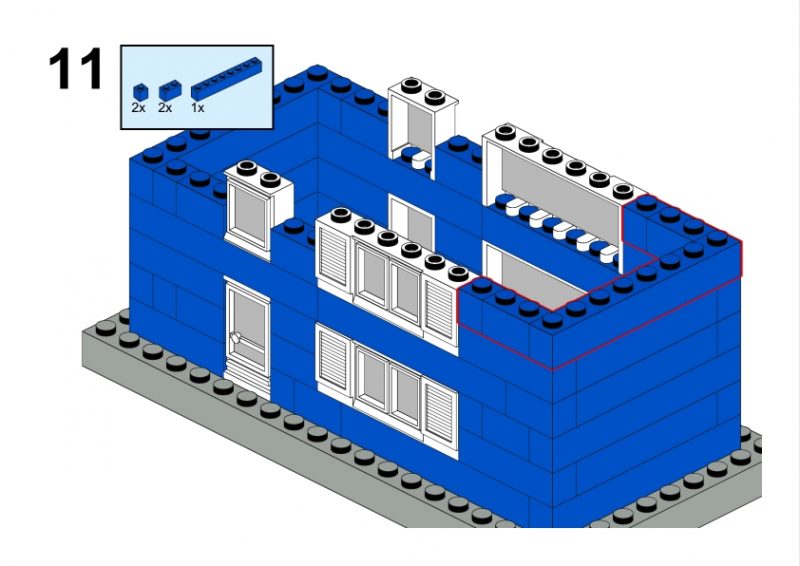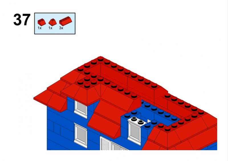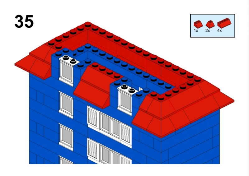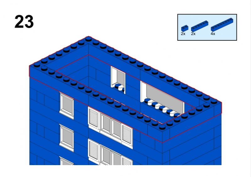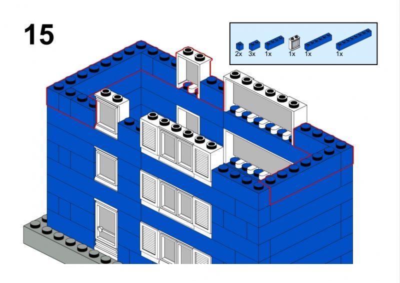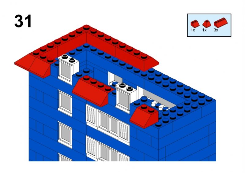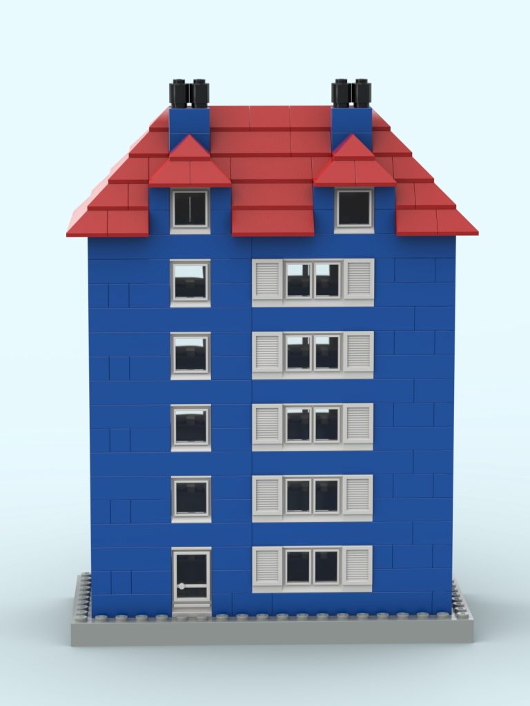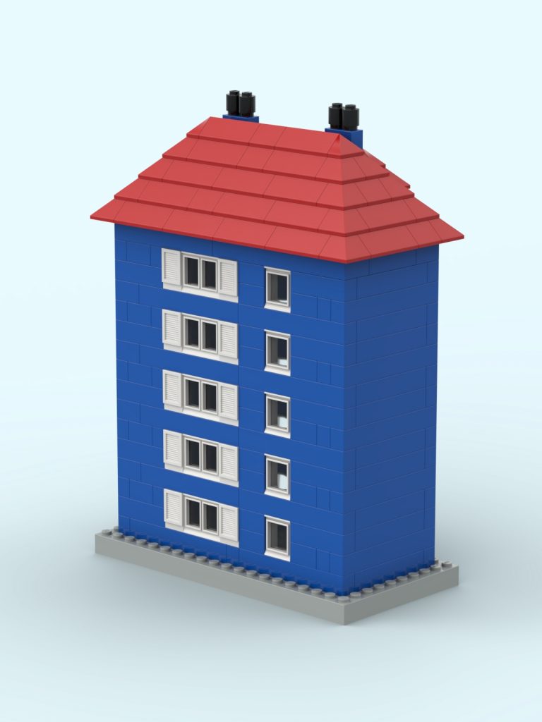 The LEGO construction circled in black in this image from LEGO Idea Book No. 238 German edition is a compact urban row house, designed as part of a charming street scene. Since the roof can’t be scene, I give my own interpretation of the build trying to stick to the overall picture style. This build reflects a traditional European row house style, likely inspired by the narrow, tightly packed homes found in medieval or early modern towns across Northern Europe, such as those in Germany or the Netherlands during the 1950s.