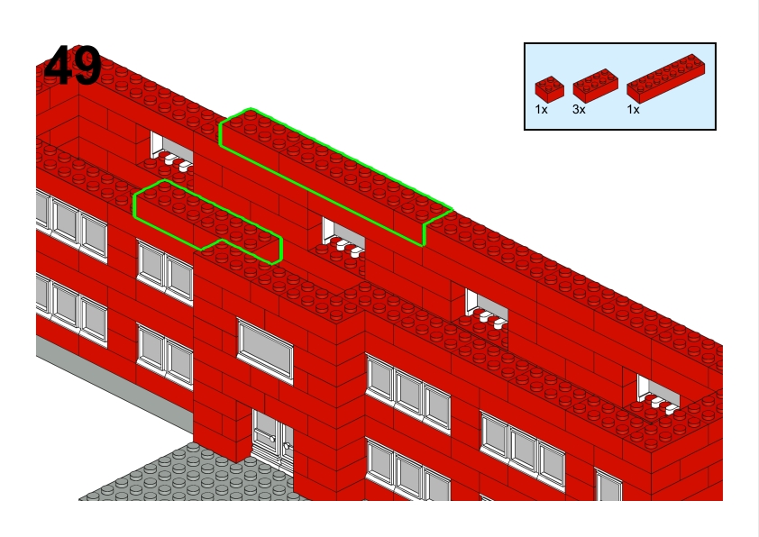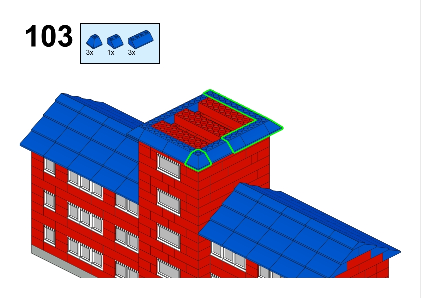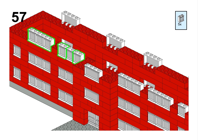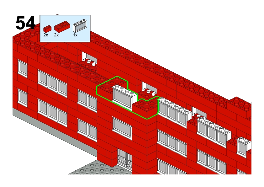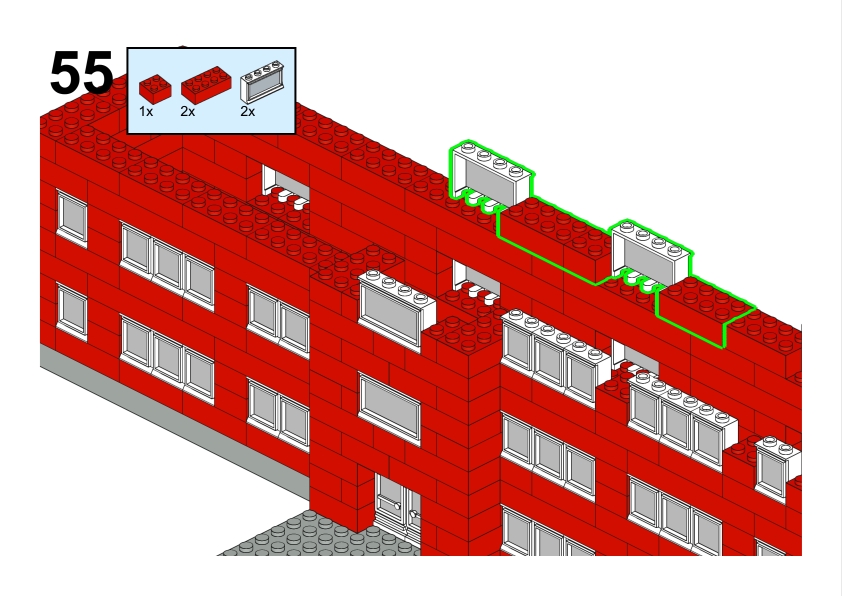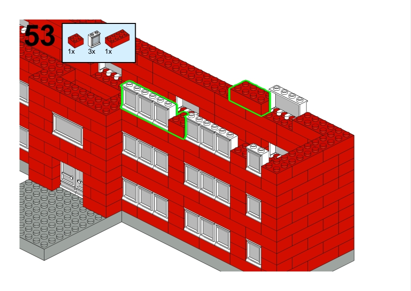 Today we build the building circled in black on this picture. This construction is shown in page 2 of the LEGO Idea Book No. 238-1 (German) and it is a urban large townhouse or maybe firemen headquarters or even university building, designed to fit into a bustling city scene. As we see a very tiny part of the building, you will find here my interpretation of the build. It reflects a traditional European urban townhouse style, likely inspired by the narrow, tightly packed residences found in cities like Amsterdam or Hamburg during the mid-20th century. It could likely be a school.