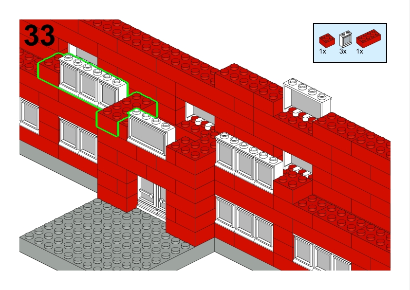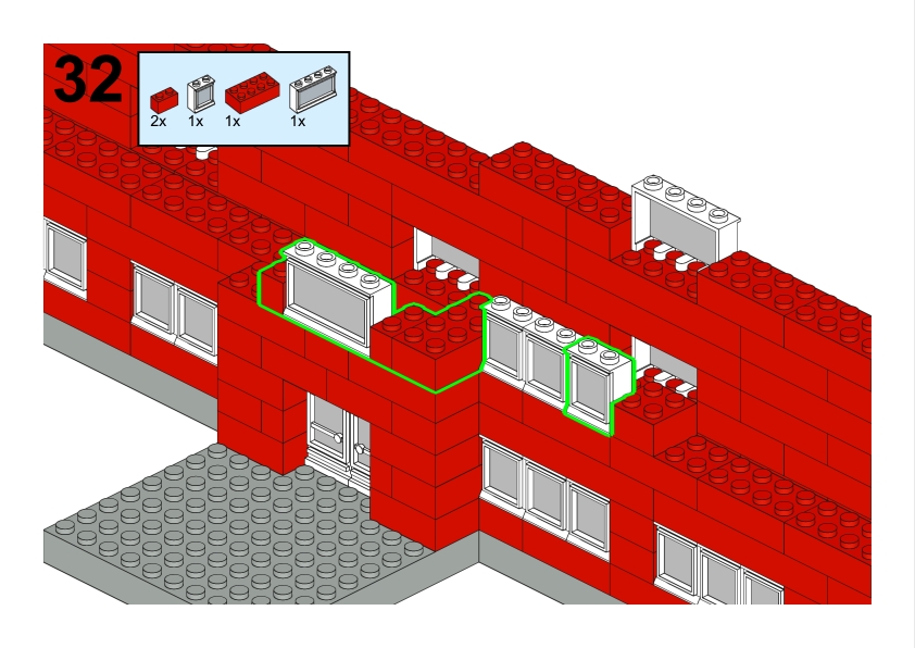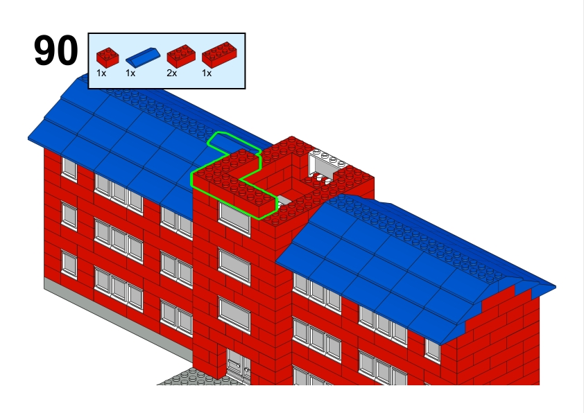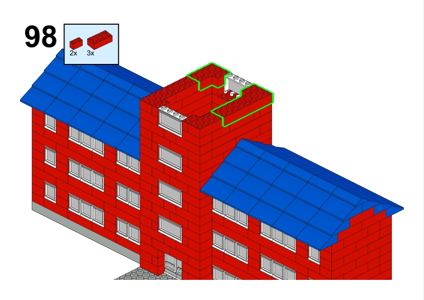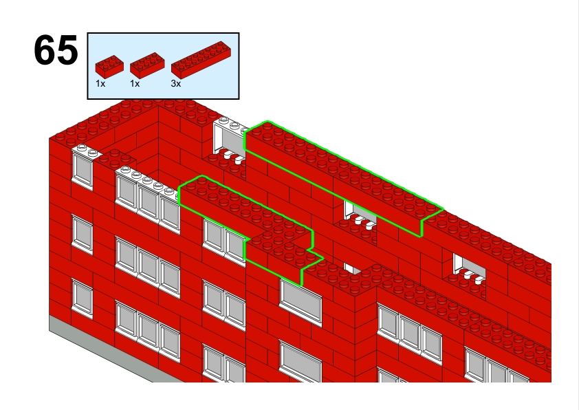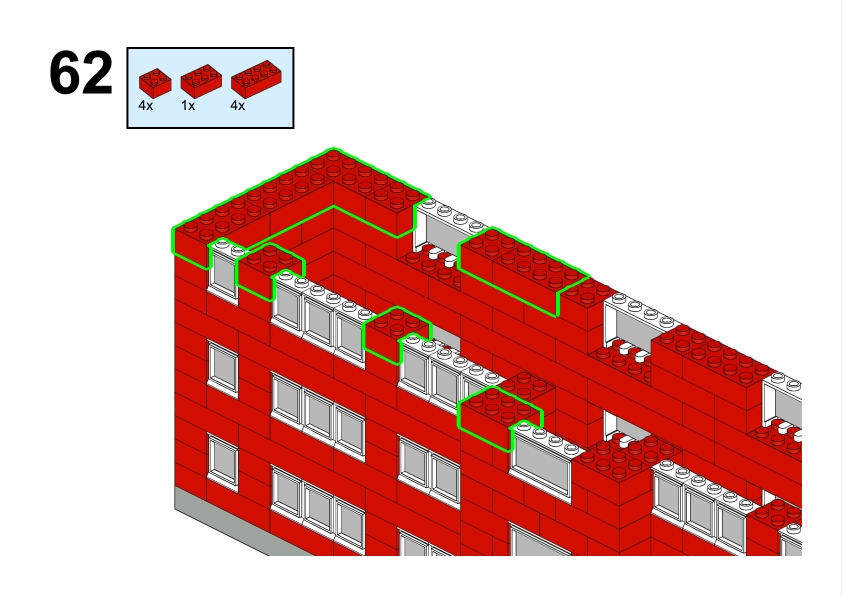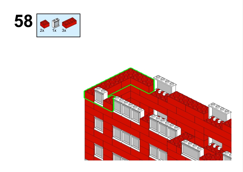 Today we build the building circled in black on this picture. This construction is shown in page 2 of the LEGO Idea Book No. 238-1 (German) and it is a urban large townhouse or maybe firemen headquarters or even university building, designed to fit into a bustling city scene. As we see a very tiny part of the building, you will find here my interpretation of the build. It reflects a traditional European urban townhouse style, likely inspired by the narrow, tightly packed residences found in cities like Amsterdam or Hamburg during the mid-20th century. It could likely be a school.