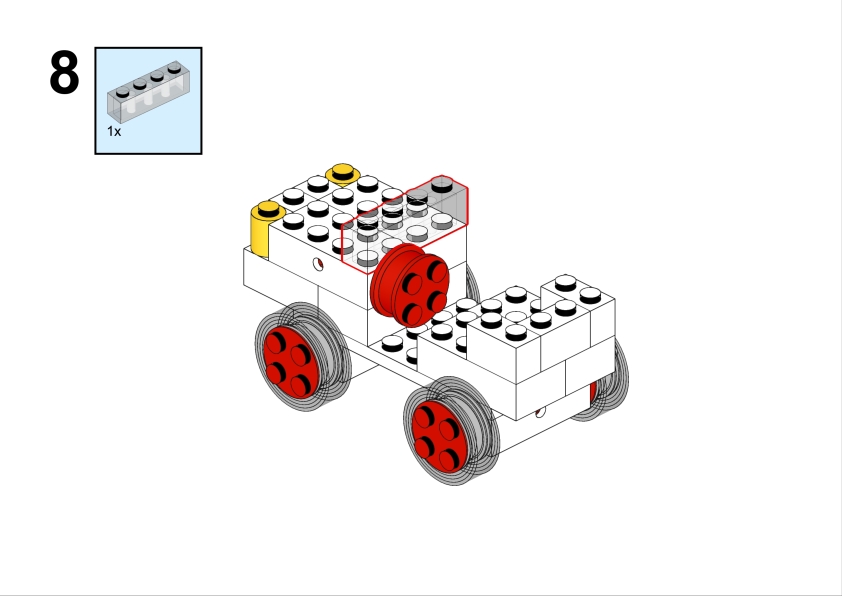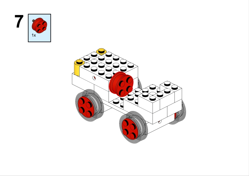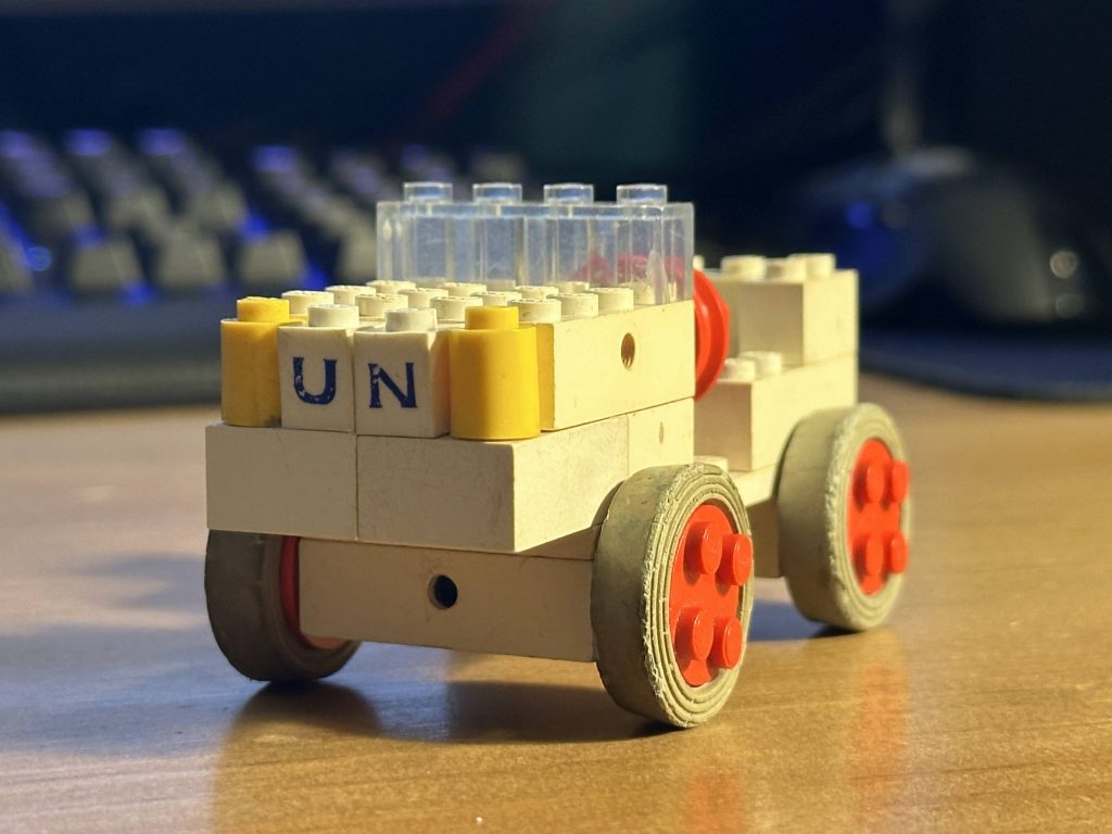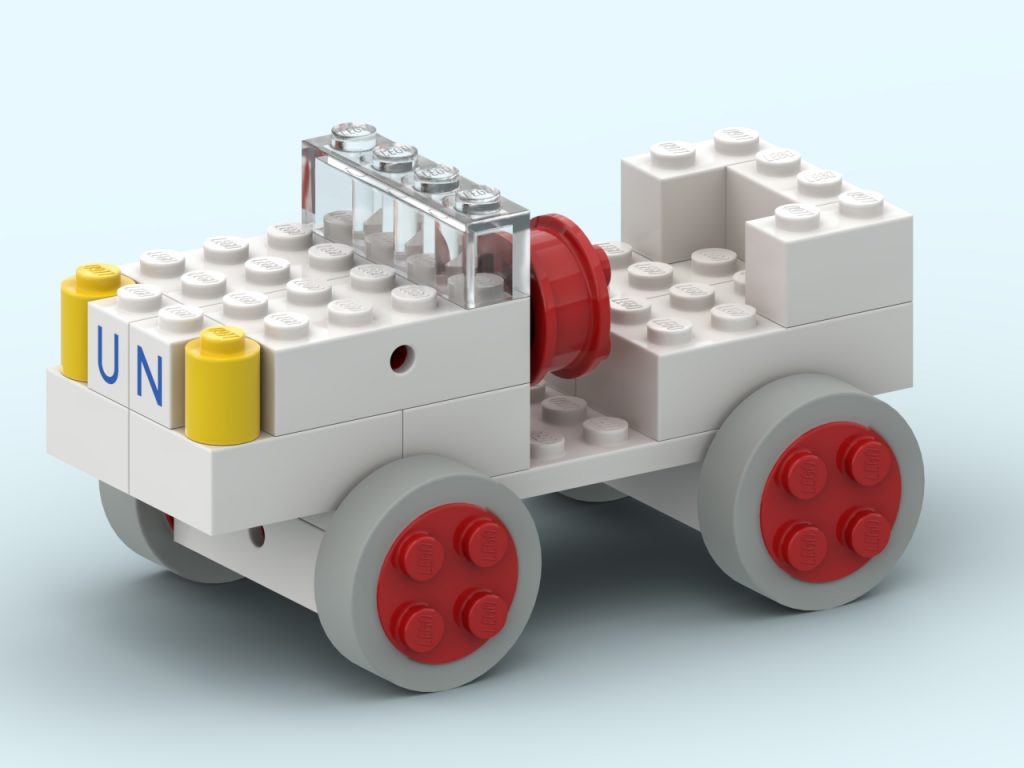 Among the alternate builds shown on the original leaflet is a charming and somewhat unusual vehicle: a white UN-themed car, complete with red wheels and a compact body. This cute model reflects the style of the era—simple bricks, bold colours, and lots of personality—and it feels like a delightful snapshot of LEGO history, when even humanitarian vehicles found their way into children’s imaginations.