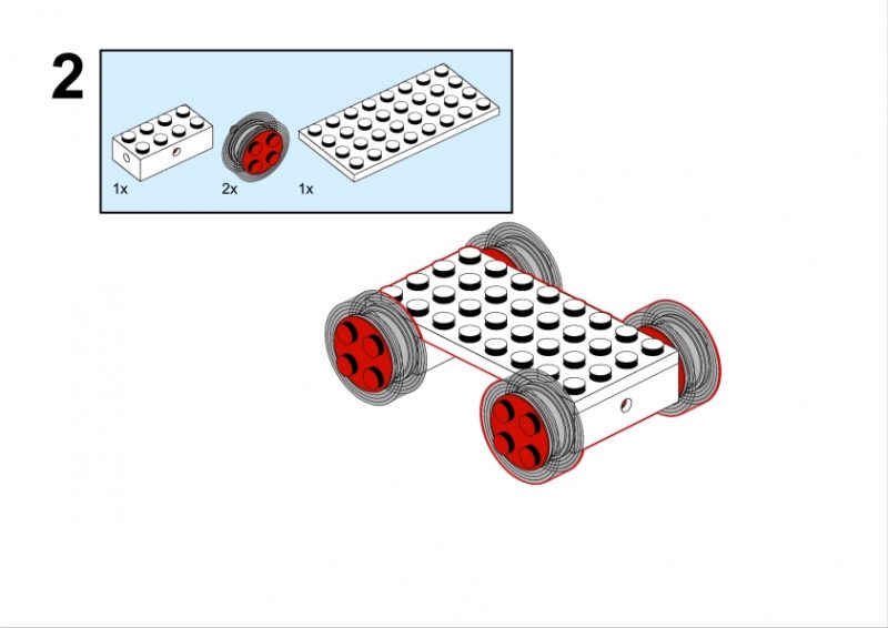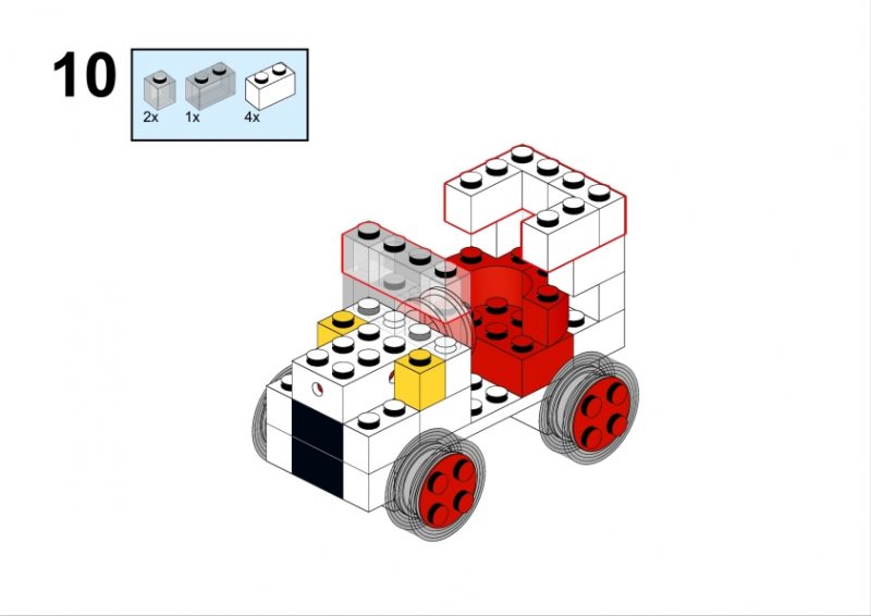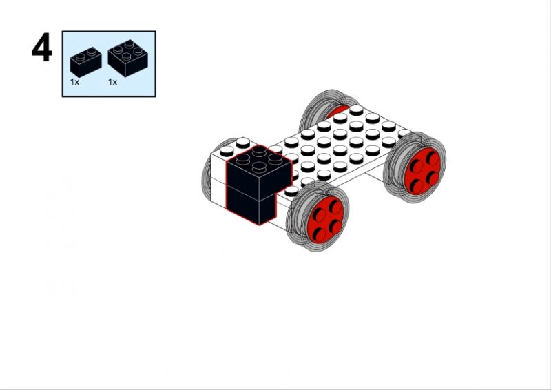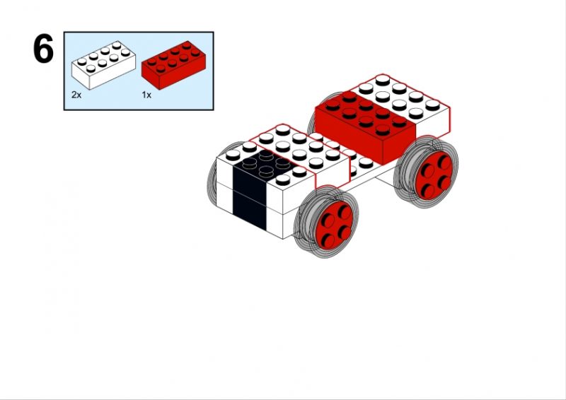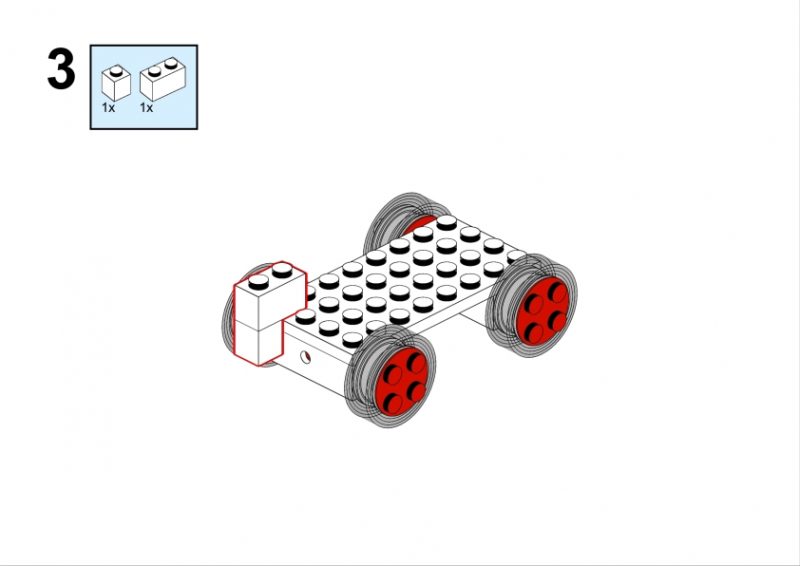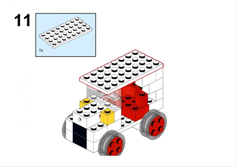 Let’s build this very basic small white car with no doors visible on this Set 400-4 leaflet, introducing small wheels with axles to the Lego inventory. It is fairly easy to build and only take few minutes. I am not sure if this is inspired from a Jeep or something else. Anyways, here’s my proposal.
