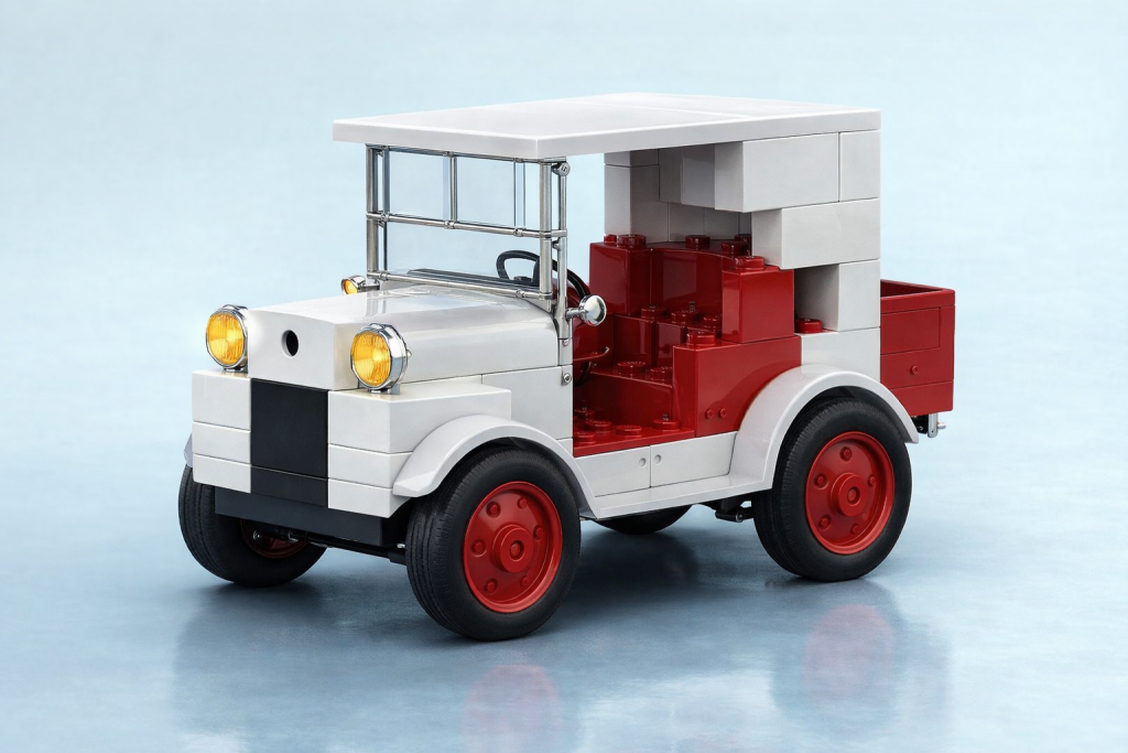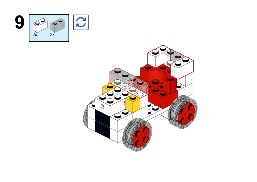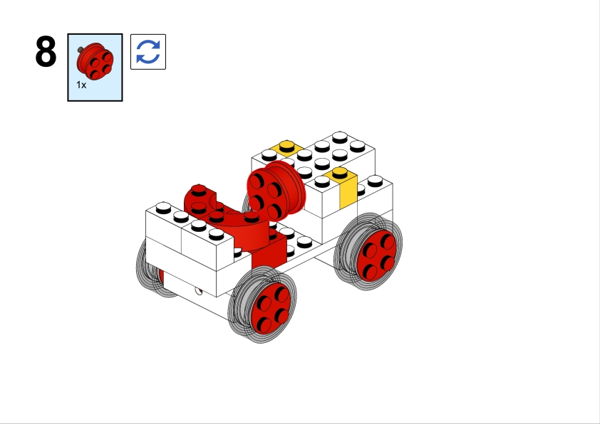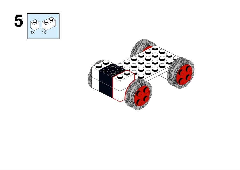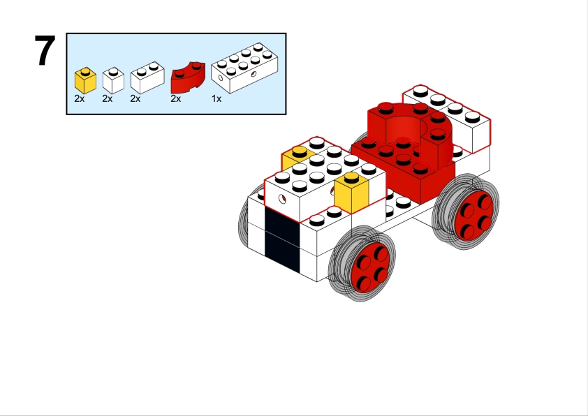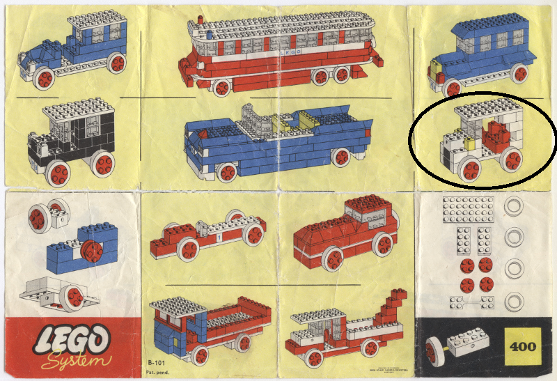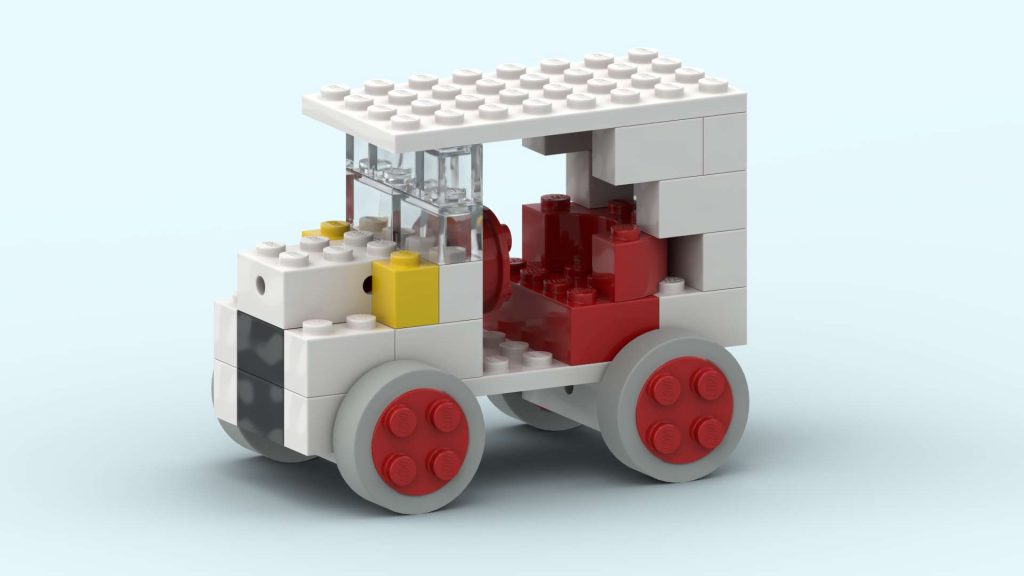 Let’s build this very basic small white car with no doors visible on this Set 400-4 leaflet, introducing small wheels with axles to the Lego inventory. It is fairly easy to build and only take few minutes. I am not sure if this is inspired from a Jeep or something else. Anyways, here’s my proposal.