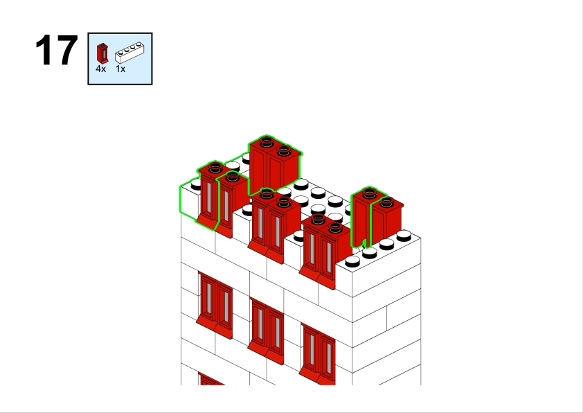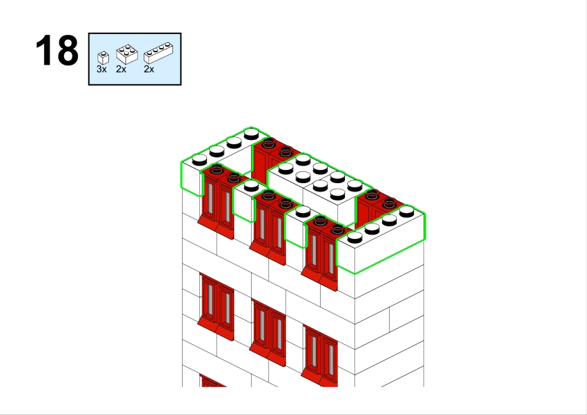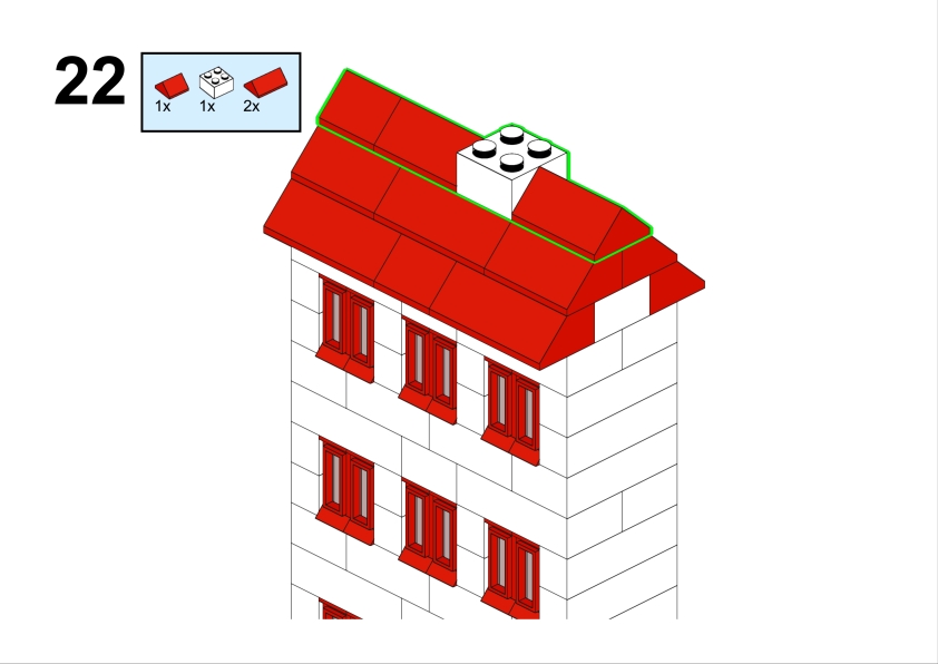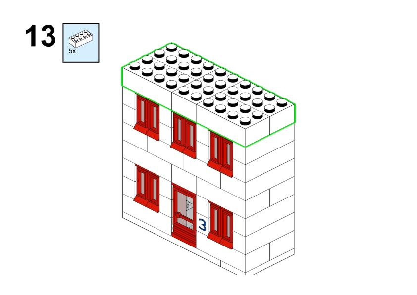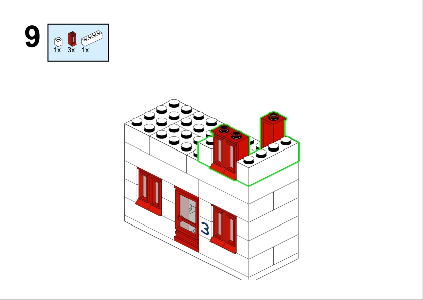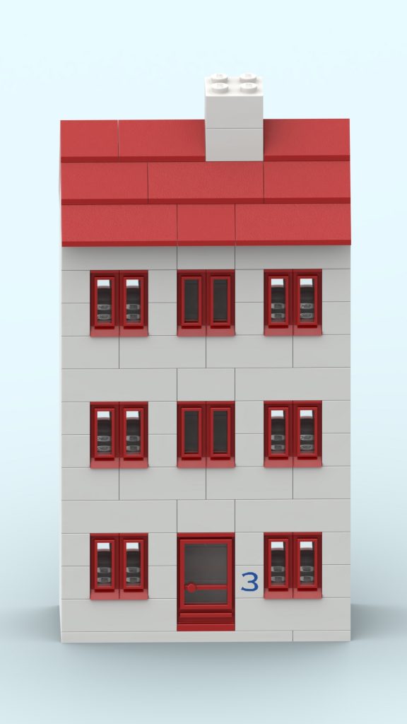 In the original illustration, it appears almost discreetly, partially hidden among taller structures. Yet its clean façade, red roofline, and neatly aligned windows give it a calm, reassuring presence. It feels like the kind of place where curtains gently move in the afternoon light, where footsteps echo softly in the stairwell, and where a neighbor might lean out of the window to watch the life of the street below.