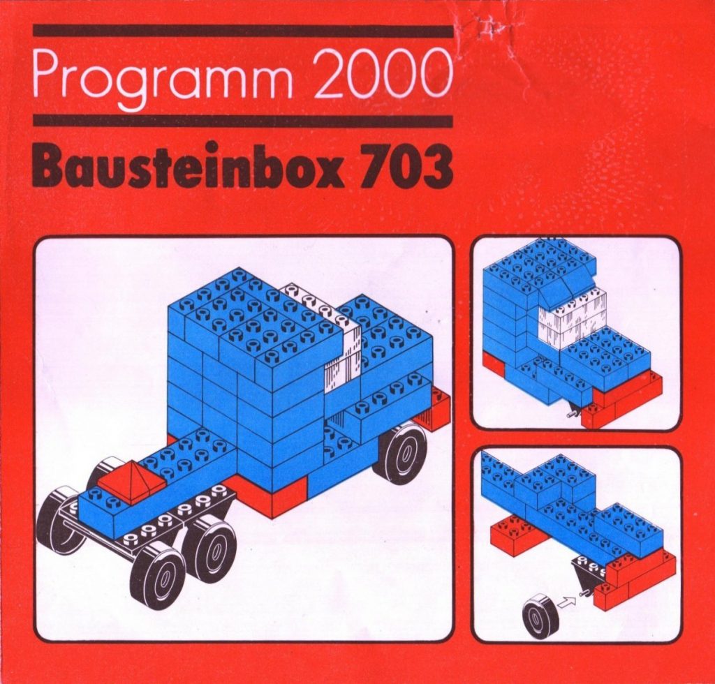 This model is a small historical curiosity. The original image does not come from LEGO, but from a PEBE construction set, specifically Bausteinbox 703 from the “Programm 2000” series. PEBE was a European brick manufacturer active in the mid-20th century, producing building toys that followed the same basic stud-and-tube logic that made LEGO System famous.