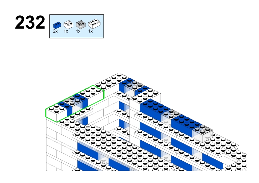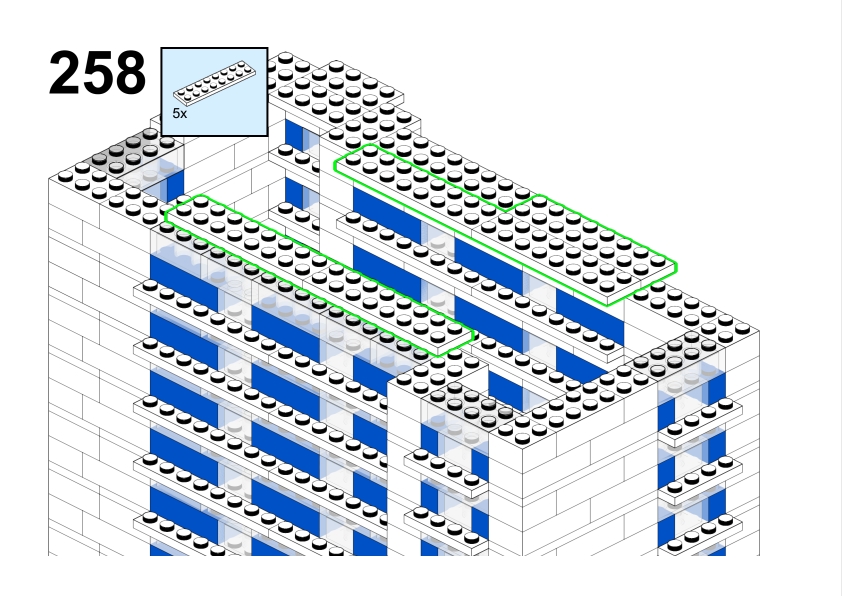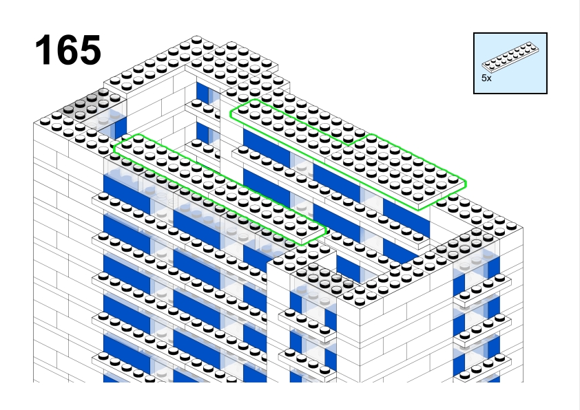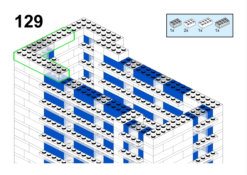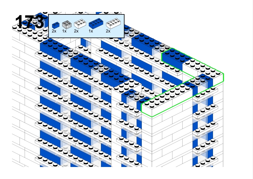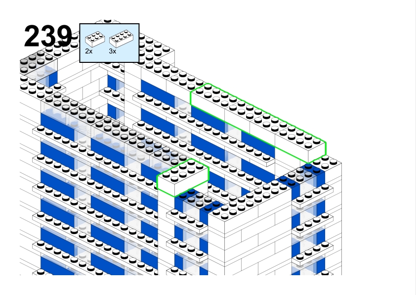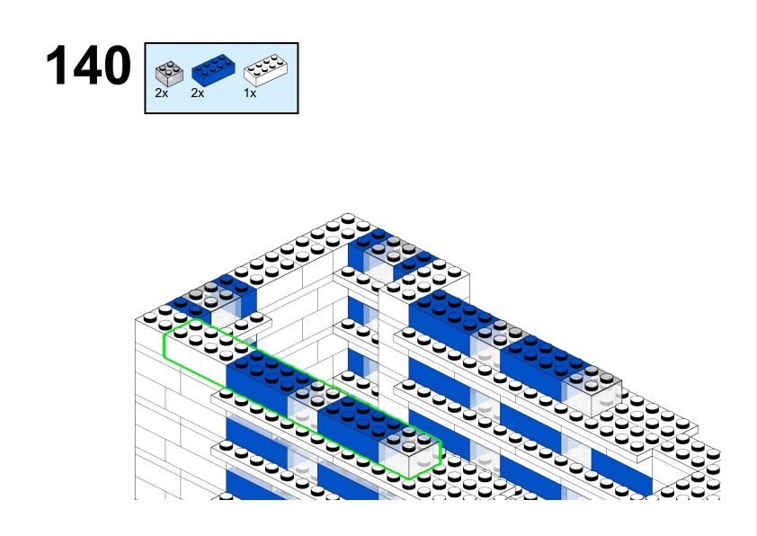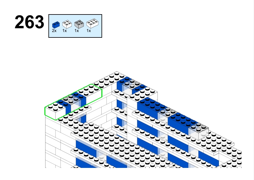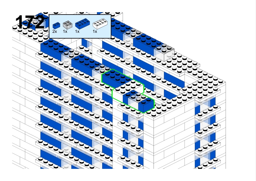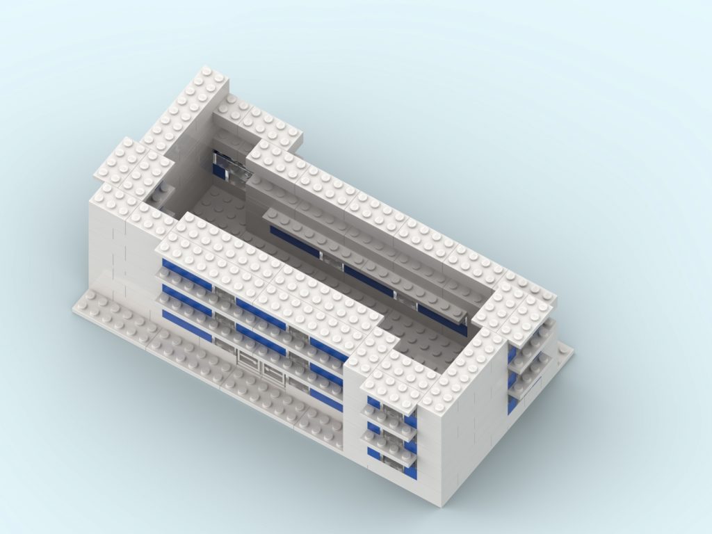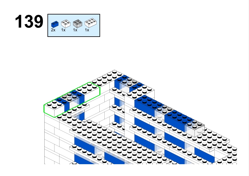 Unlike many of the more playful houses in the scene, this tower feels serious. Very serious. Its façade repeats the same pattern floor after floor, like a disciplined grid designed by someone who truly trusted geometry. The structure is demanding in transparent bricks and white plates, which create those long horizontal bands of windows that wrap around the building like layers of glass and concrete.