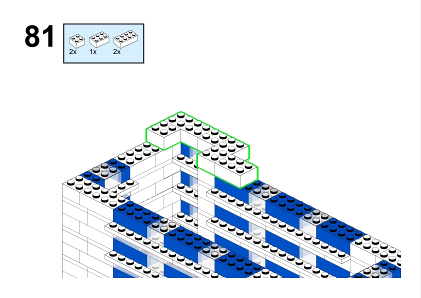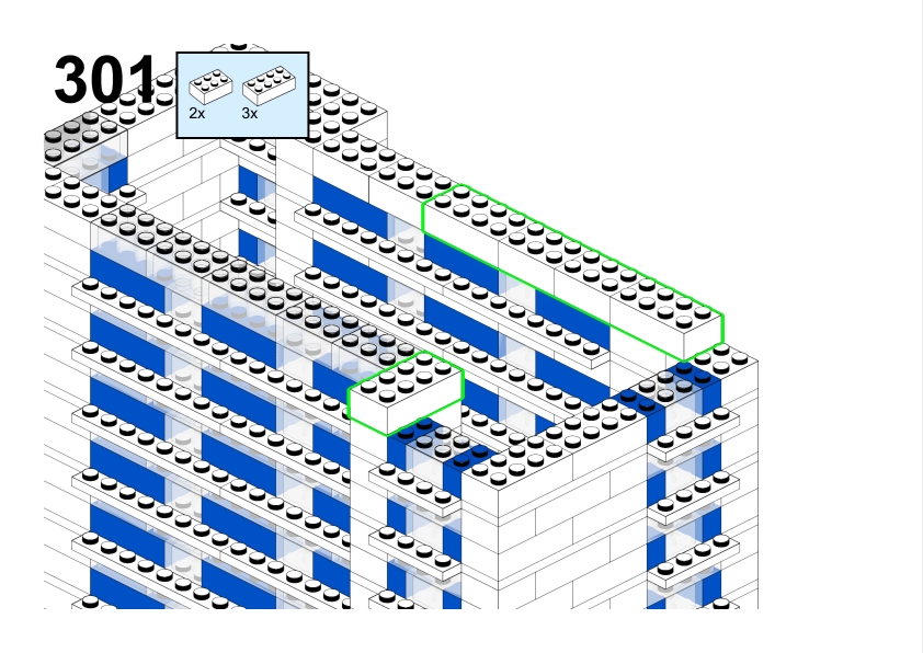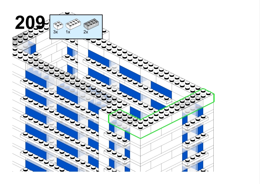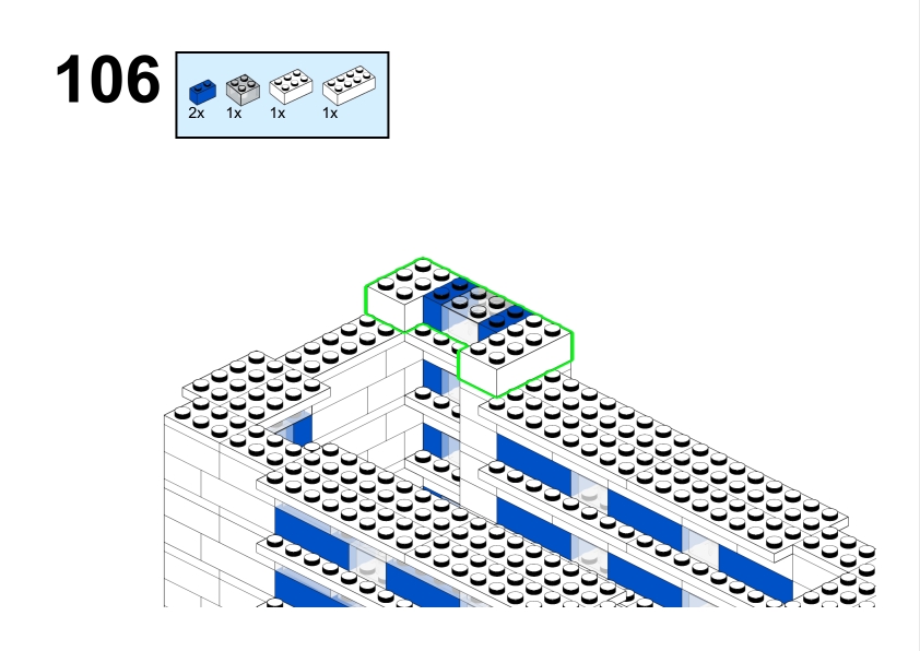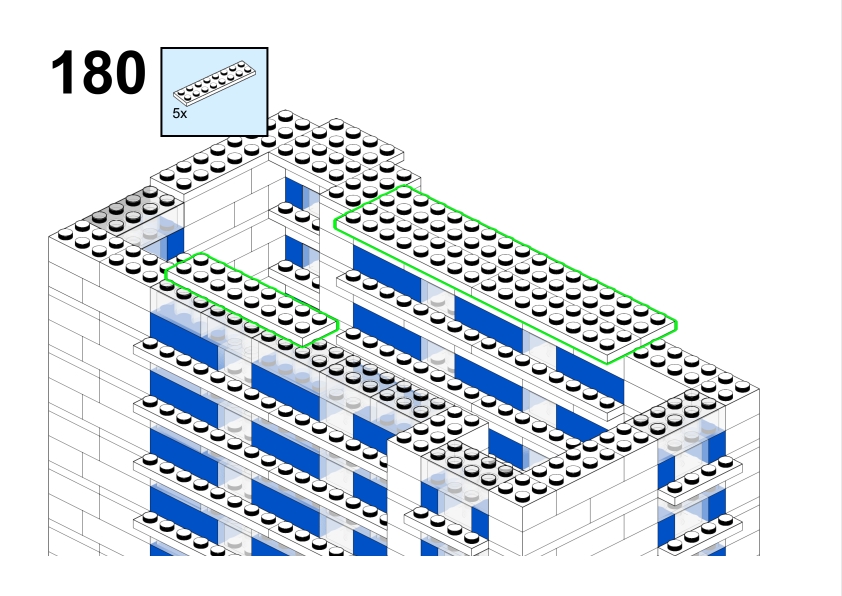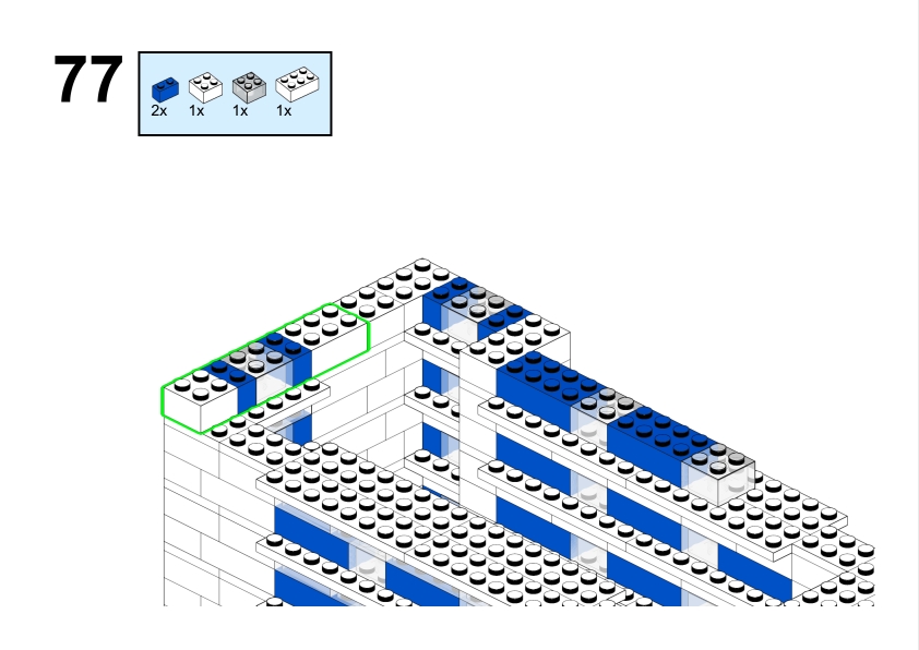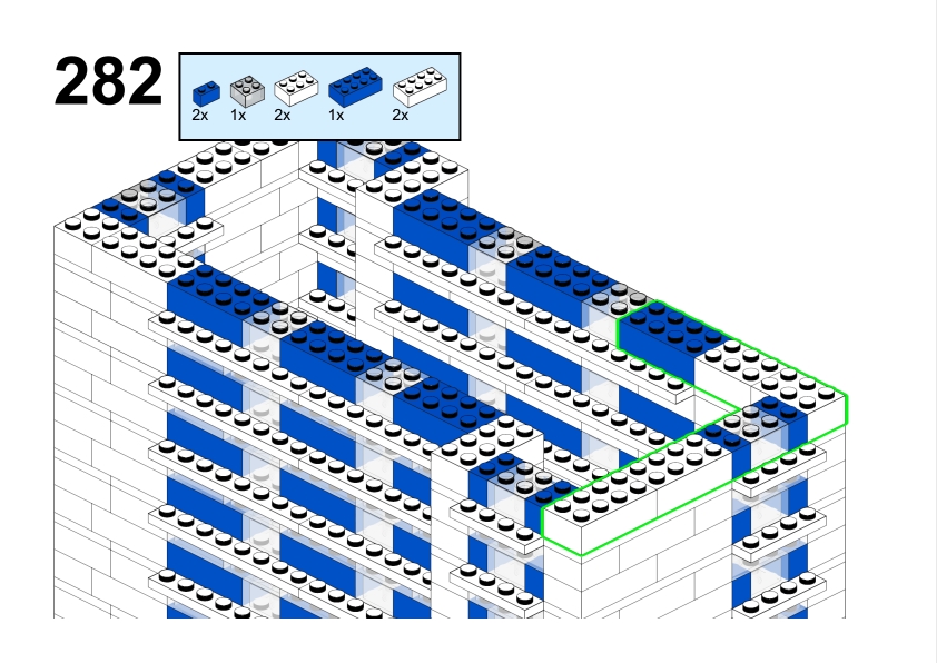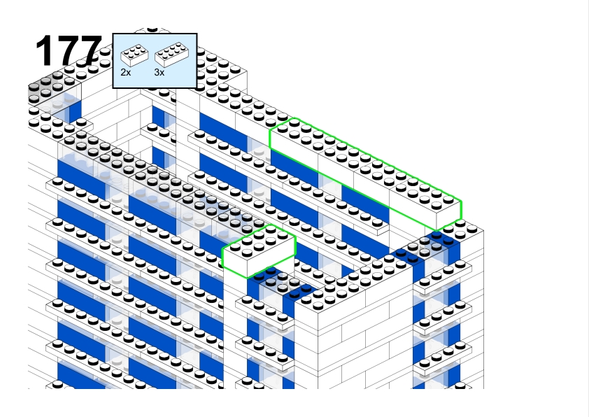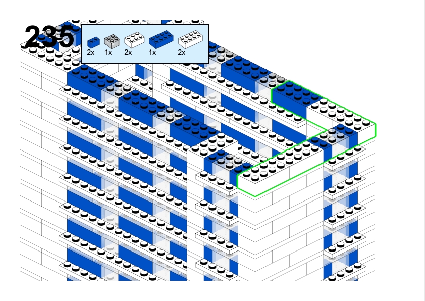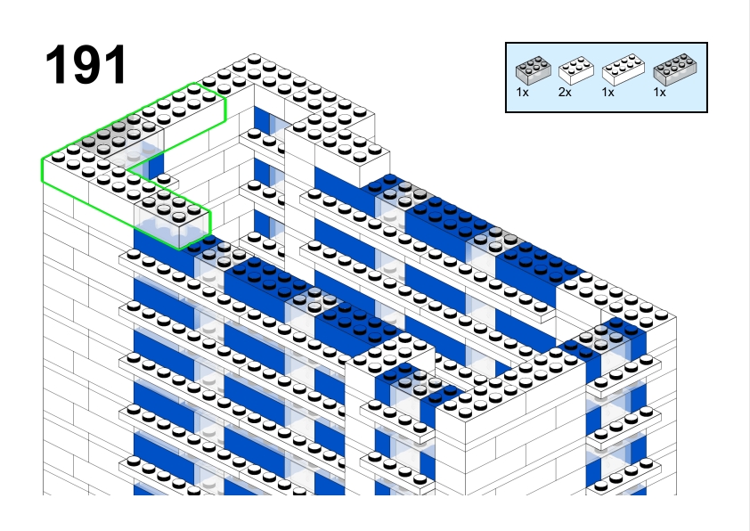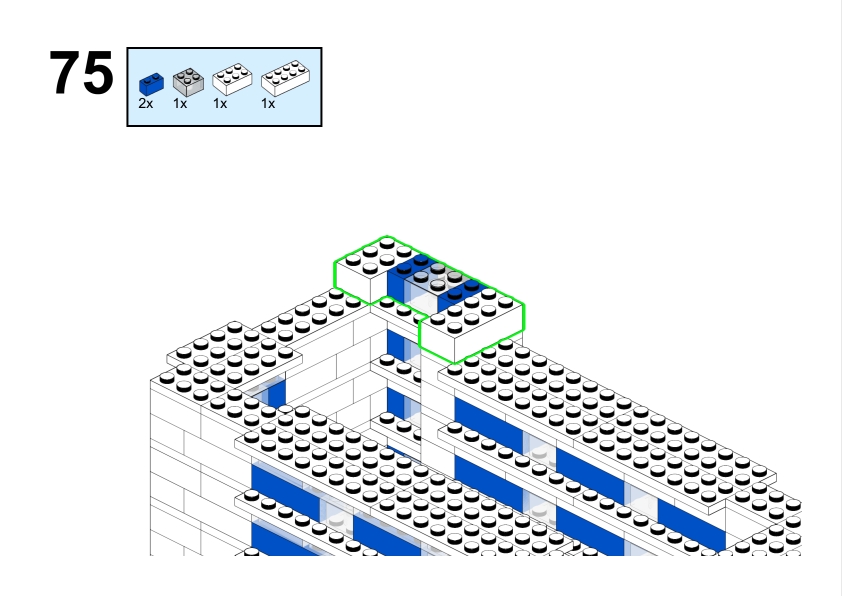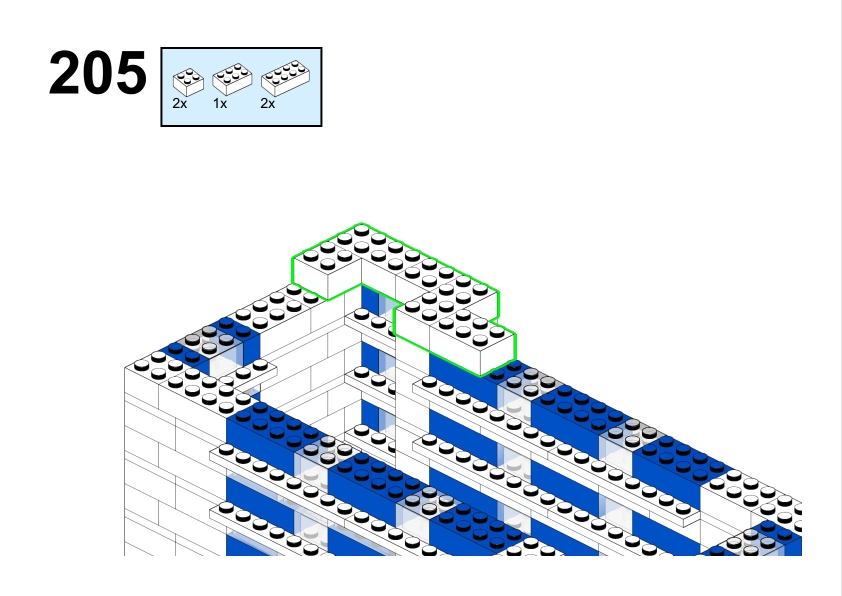 Unlike many of the more playful houses in the scene, this tower feels serious. Very serious. Its façade repeats the same pattern floor after floor, like a disciplined grid designed by someone who truly trusted geometry. The structure is demanding in transparent bricks and white plates, which create those long horizontal bands of windows that wrap around the building like layers of glass and concrete.