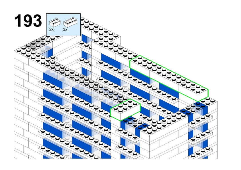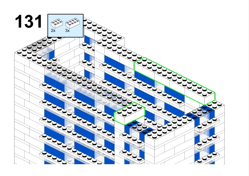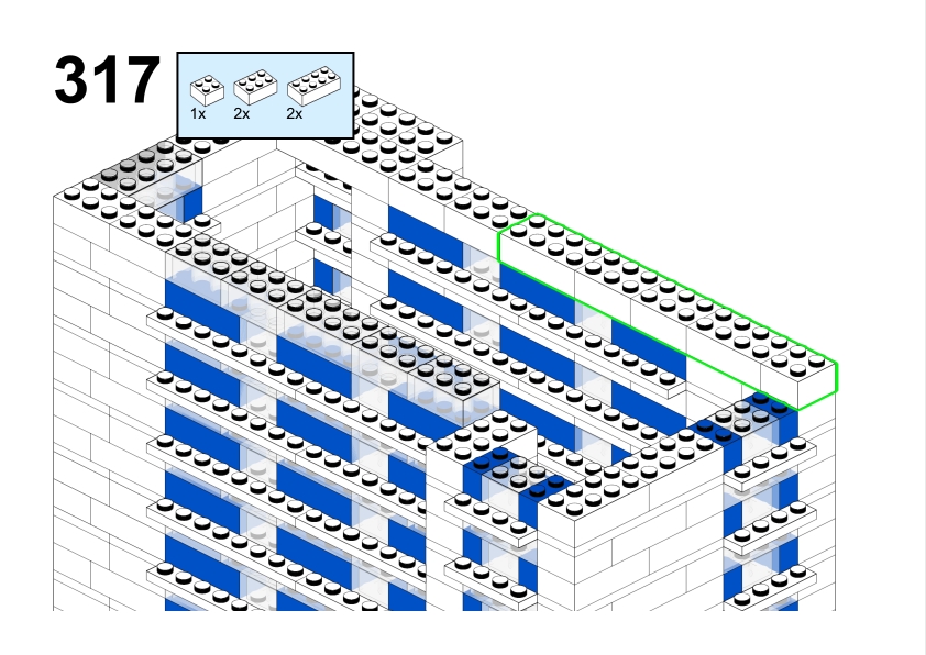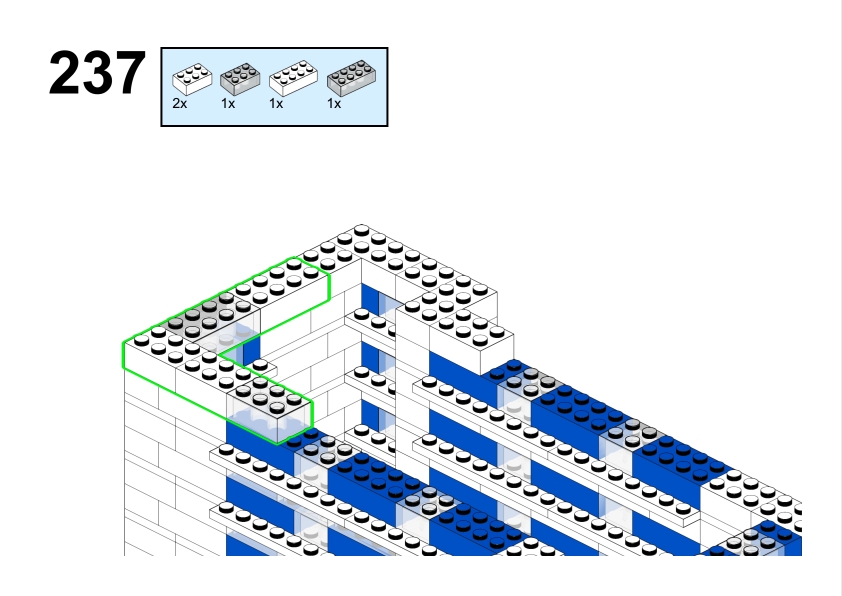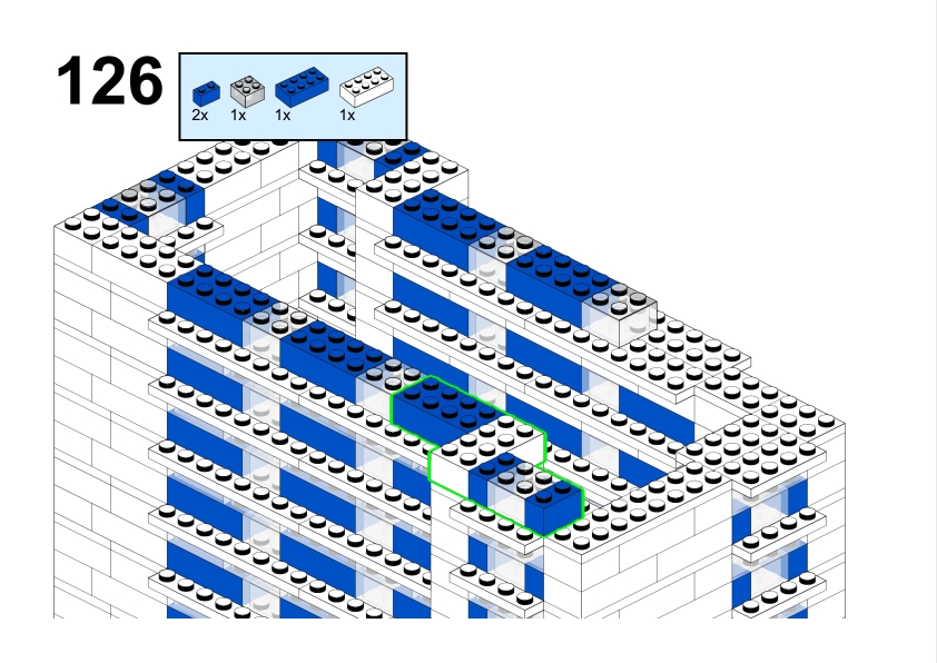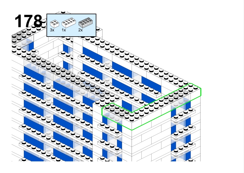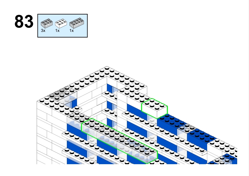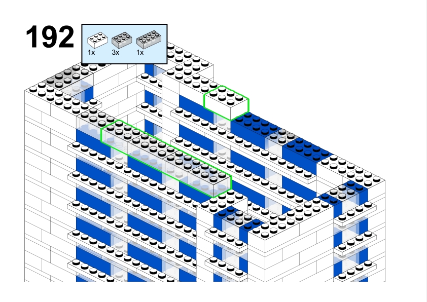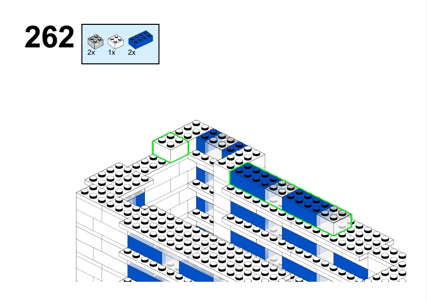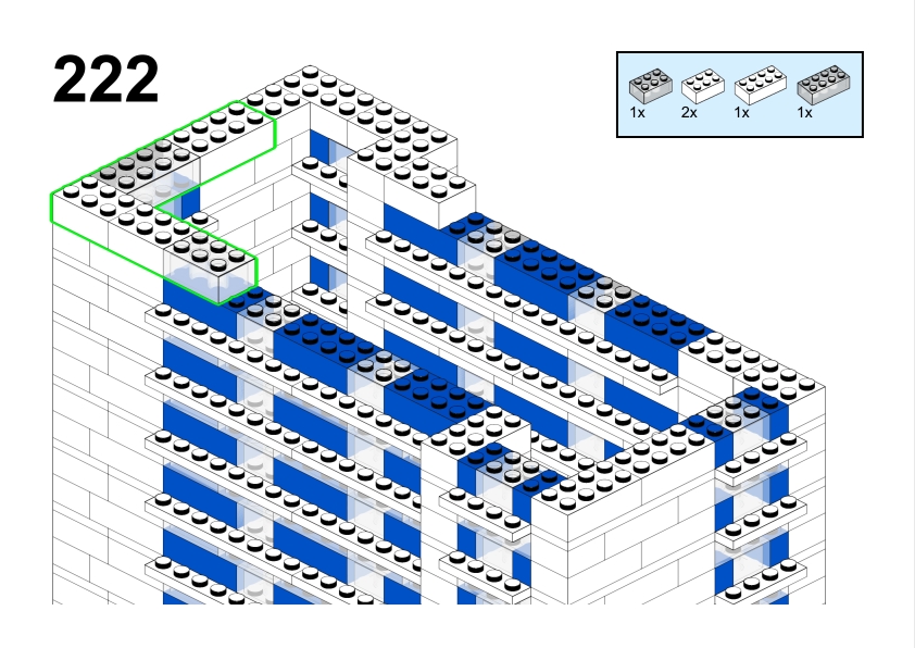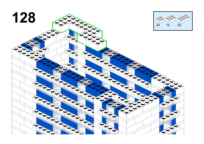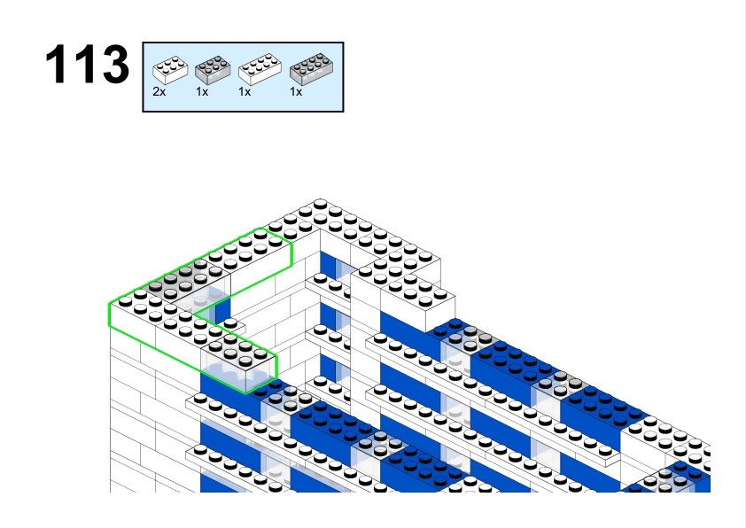 Unlike many of the more playful houses in the scene, this tower feels serious. Very serious. Its façade repeats the same pattern floor after floor, like a disciplined grid designed by someone who truly trusted geometry. The structure is demanding in transparent bricks and white plates, which create those long horizontal bands of windows that wrap around the building like layers of glass and concrete.