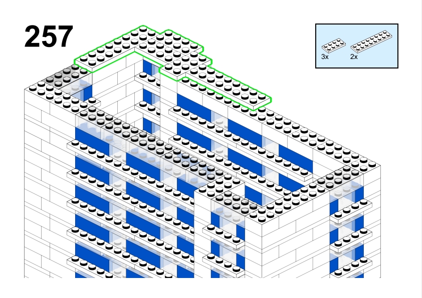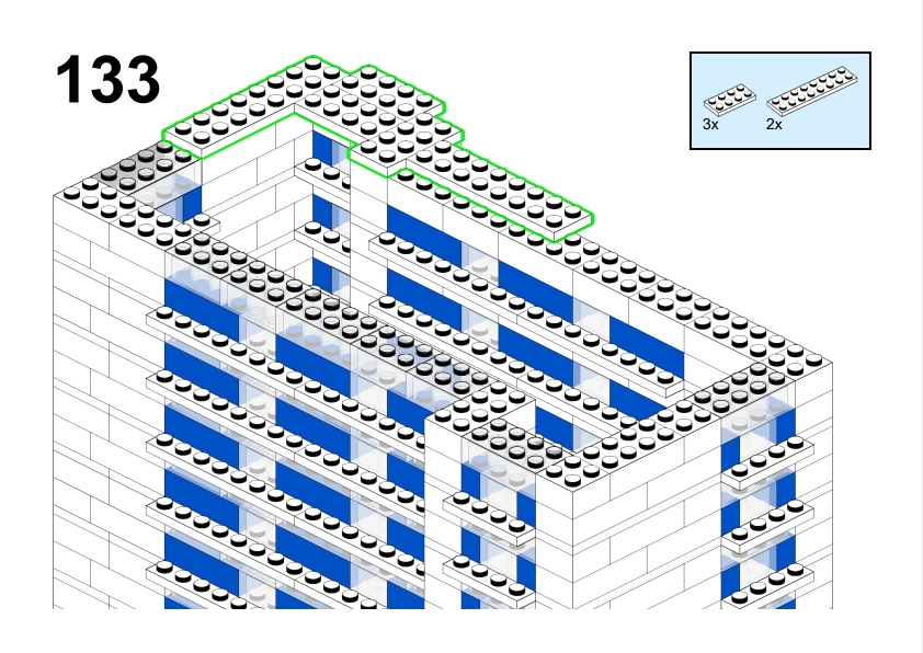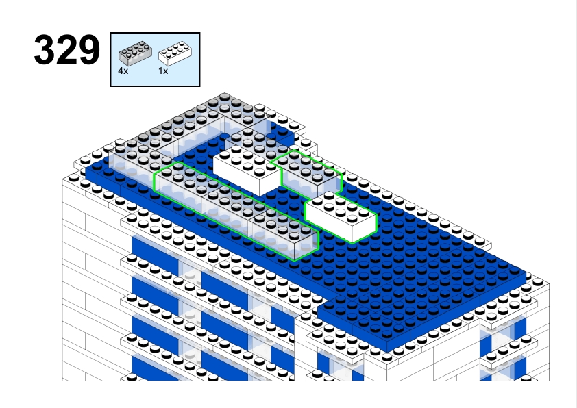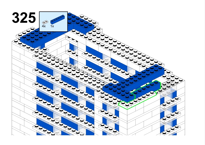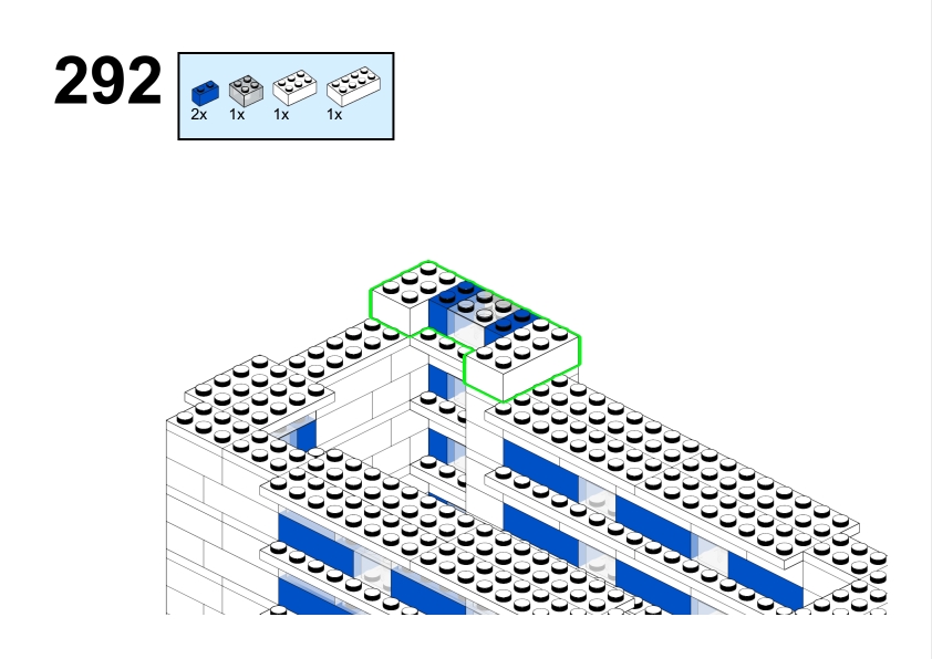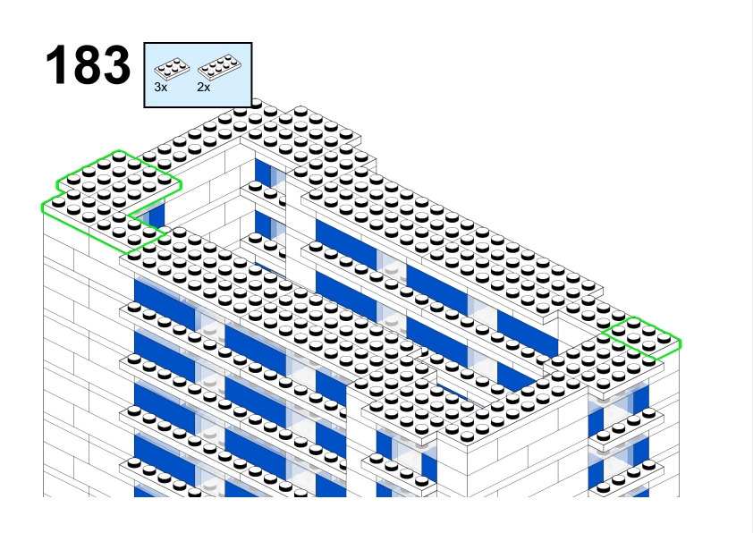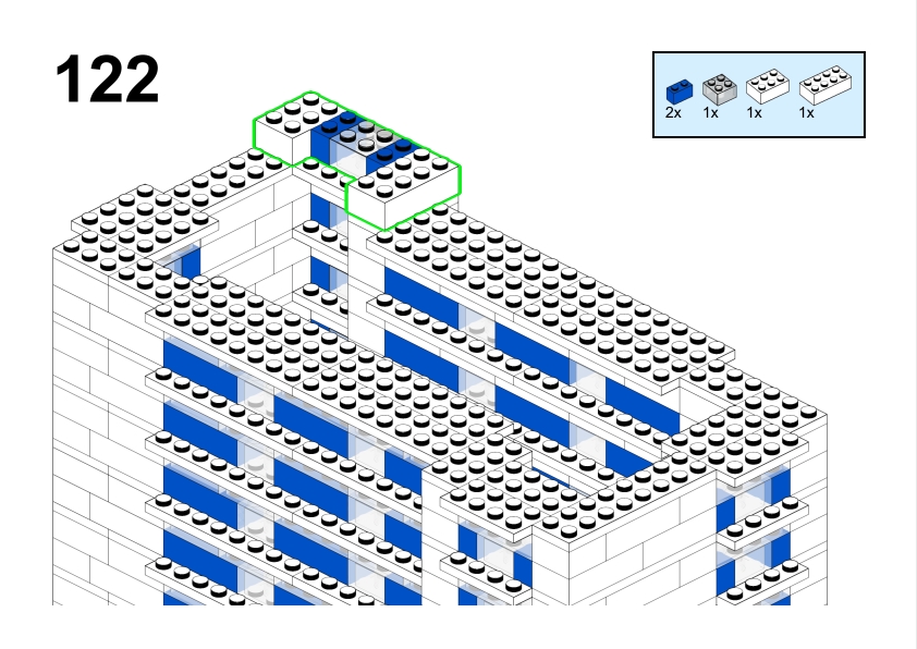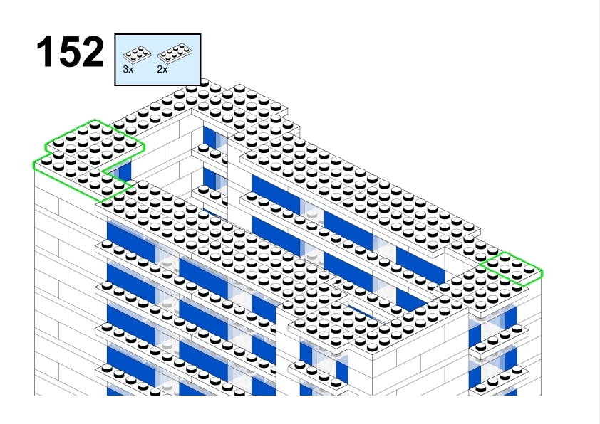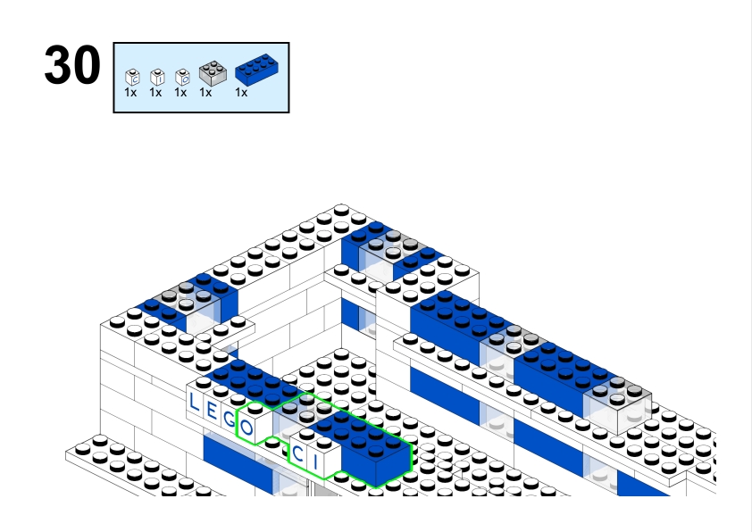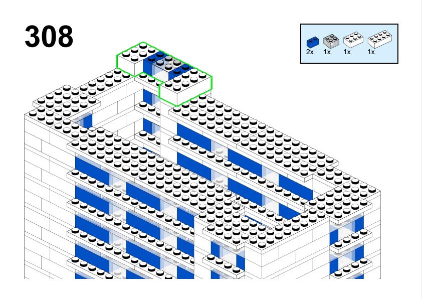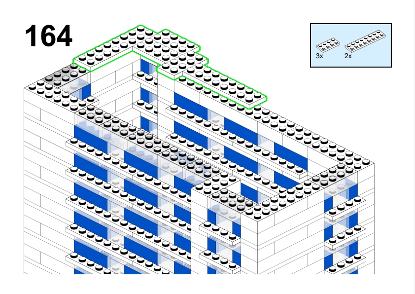 Unlike many of the more playful houses in the scene, this tower feels serious. Very serious. Its façade repeats the same pattern floor after floor, like a disciplined grid designed by someone who truly trusted geometry. The structure is demanding in transparent bricks and white plates, which create those long horizontal bands of windows that wrap around the building like layers of glass and concrete.