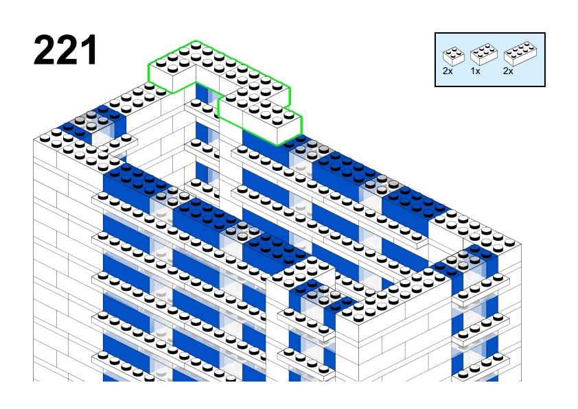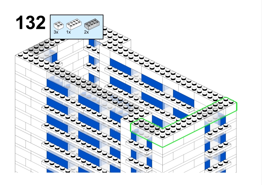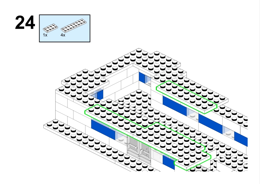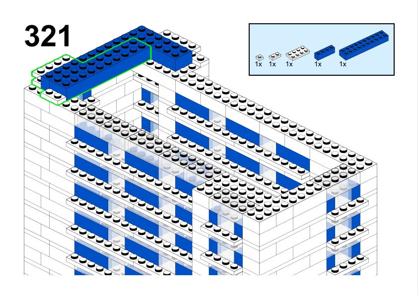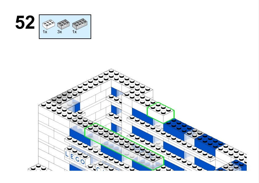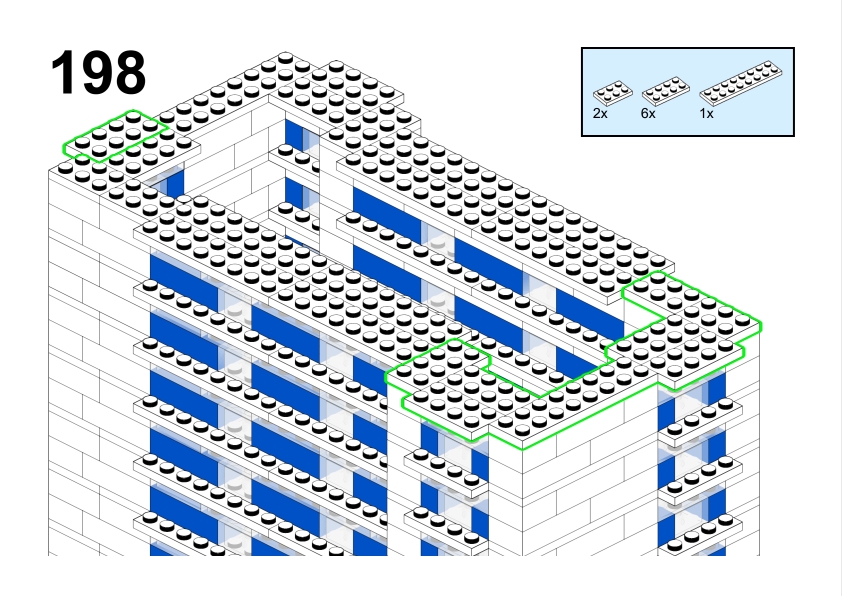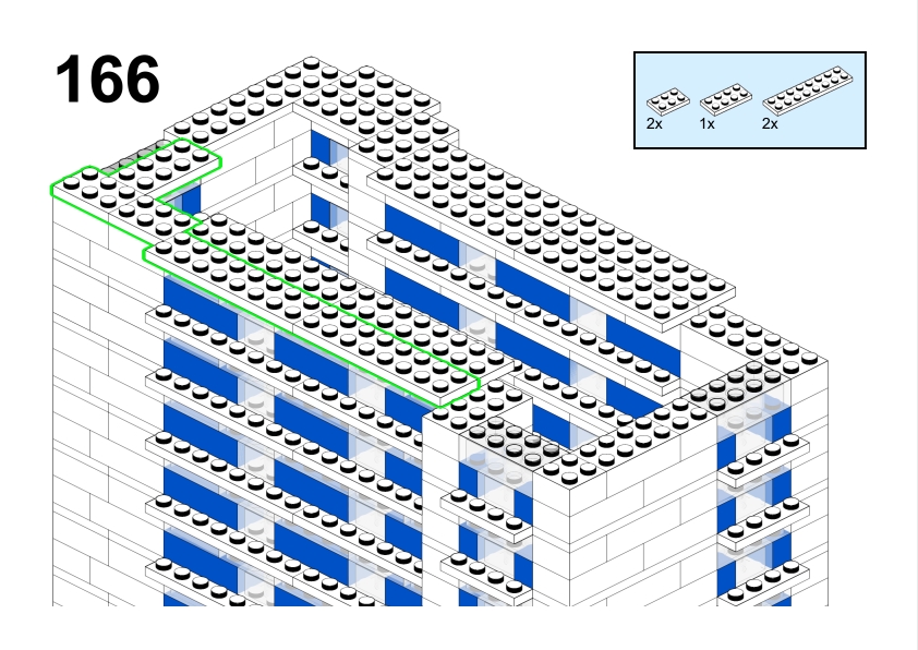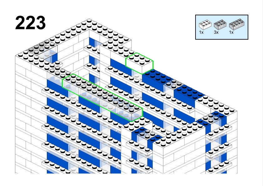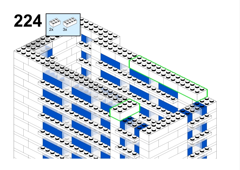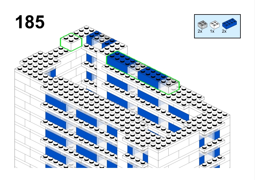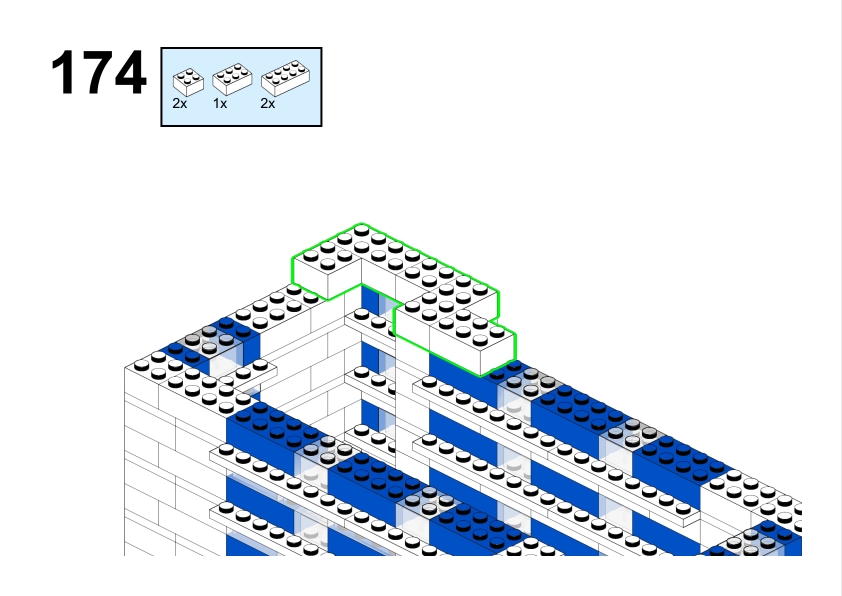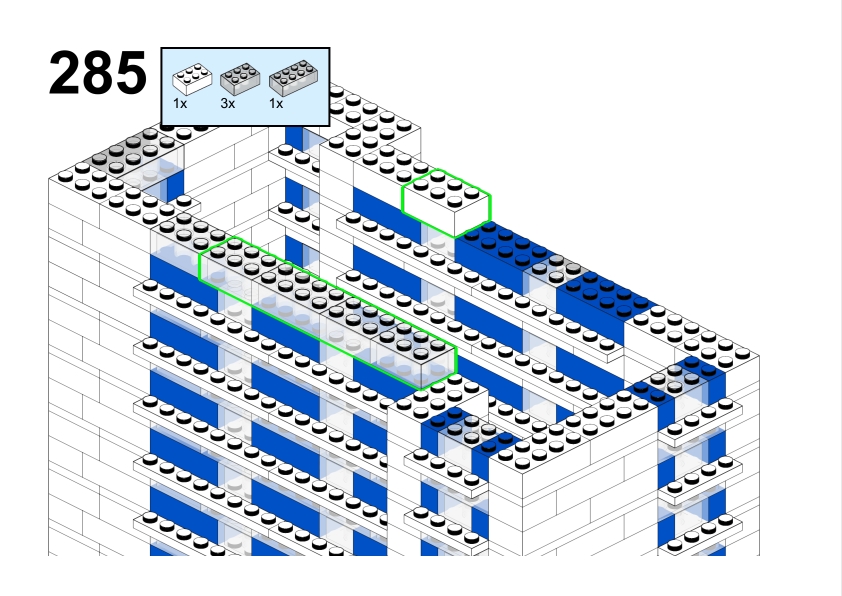 Unlike many of the more playful houses in the scene, this tower feels serious. Very serious. Its façade repeats the same pattern floor after floor, like a disciplined grid designed by someone who truly trusted geometry. The structure is demanding in transparent bricks and white plates, which create those long horizontal bands of windows that wrap around the building like layers of glass and concrete.