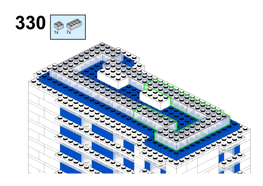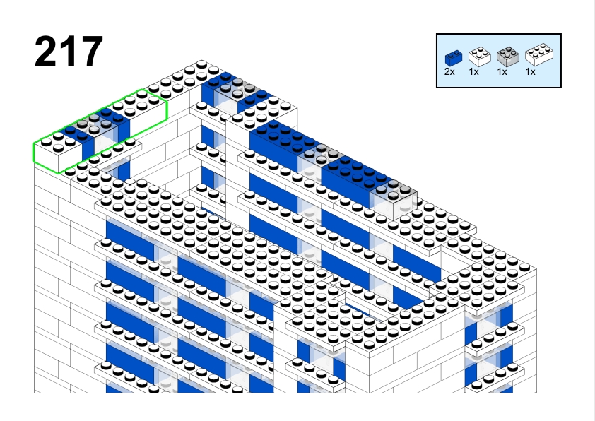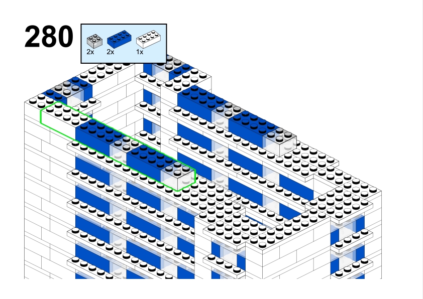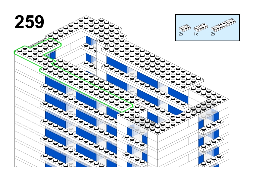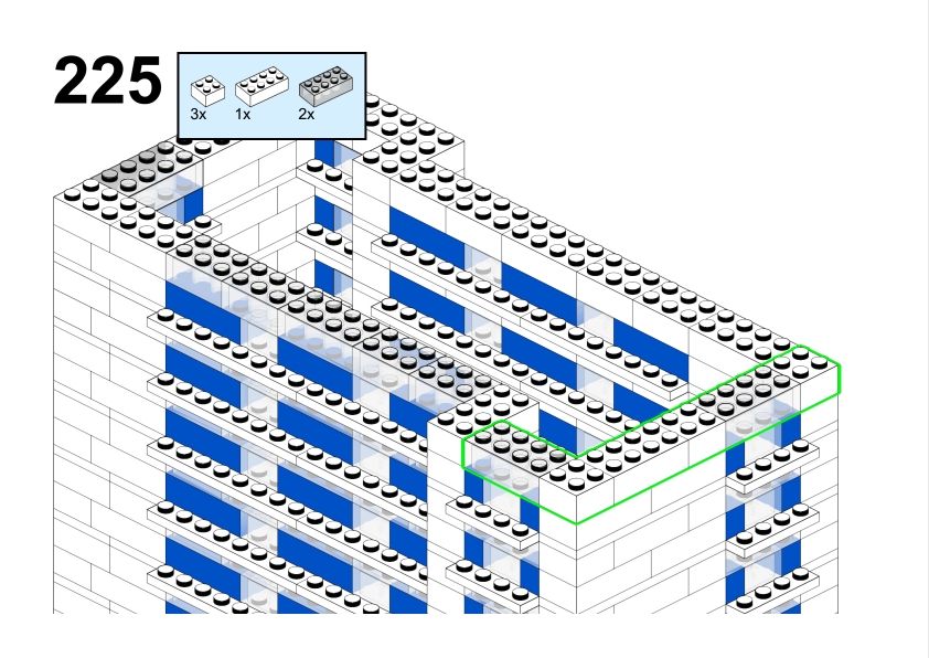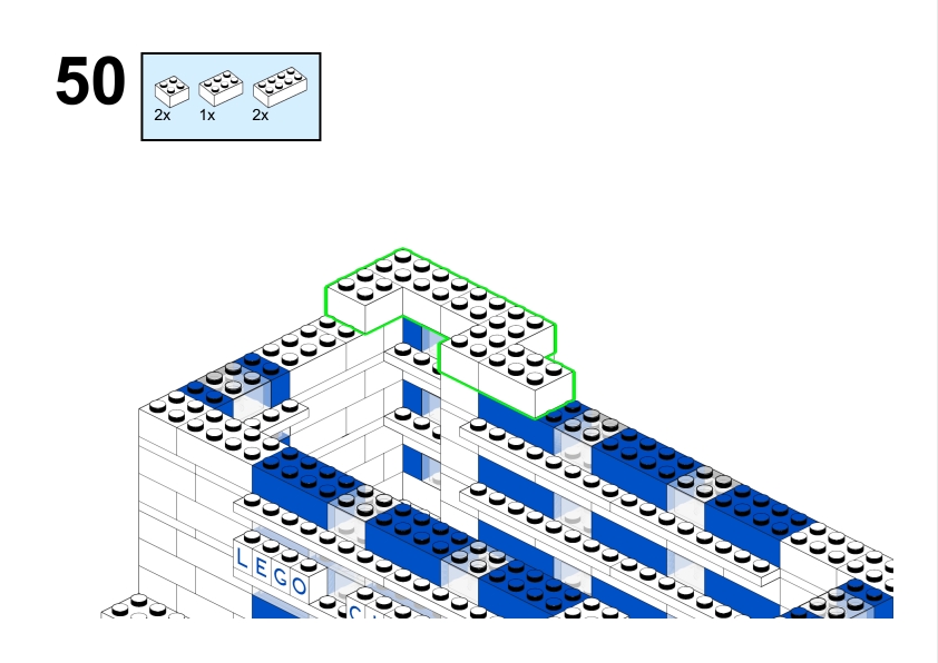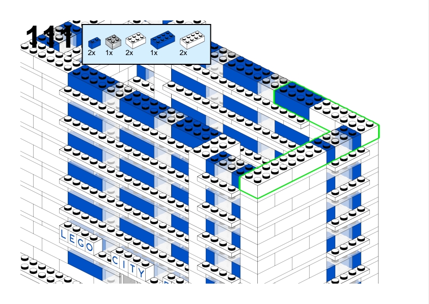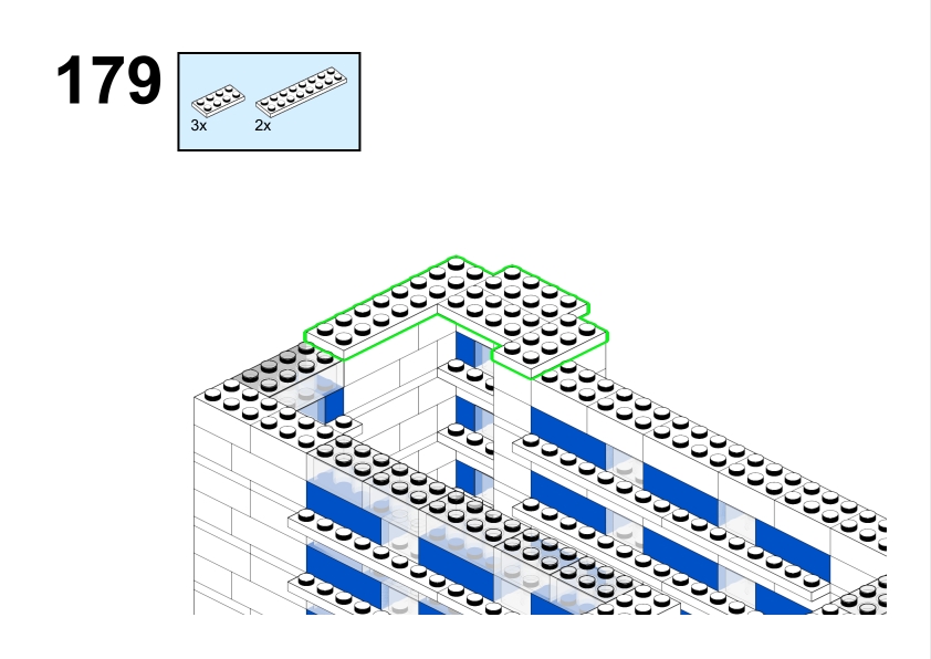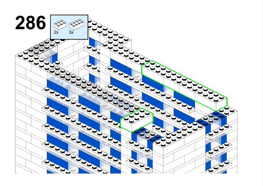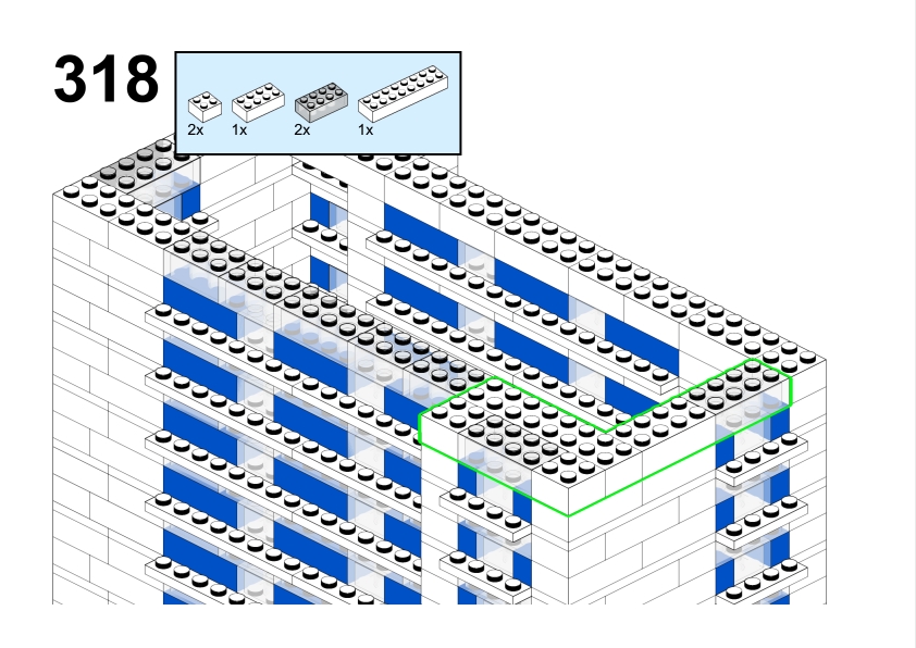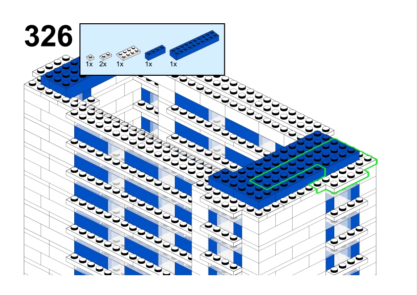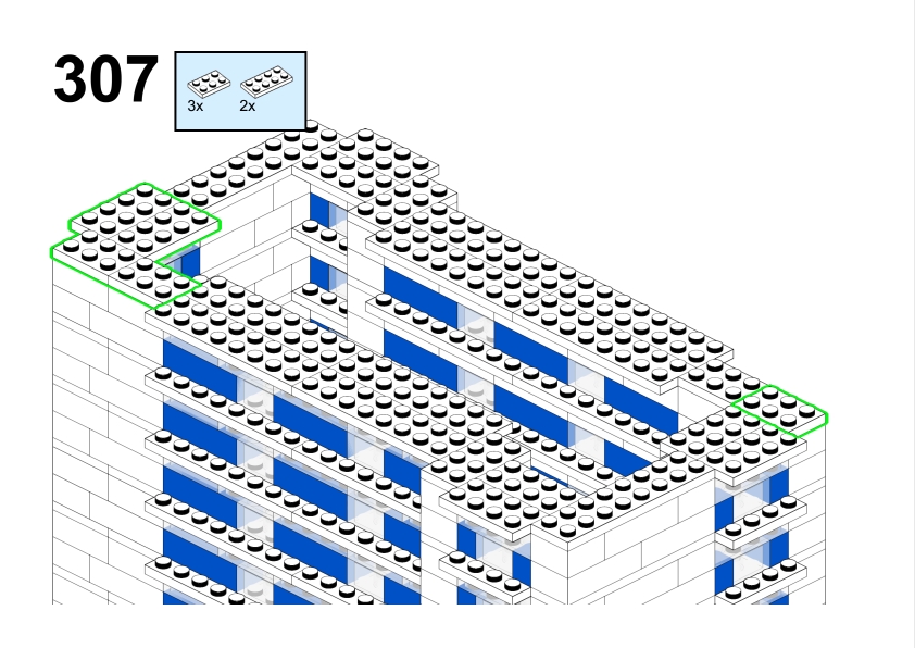 Unlike many of the more playful houses in the scene, this tower feels serious. Very serious. Its façade repeats the same pattern floor after floor, like a disciplined grid designed by someone who truly trusted geometry. The structure is demanding in transparent bricks and white plates, which create those long horizontal bands of windows that wrap around the building like layers of glass and concrete.